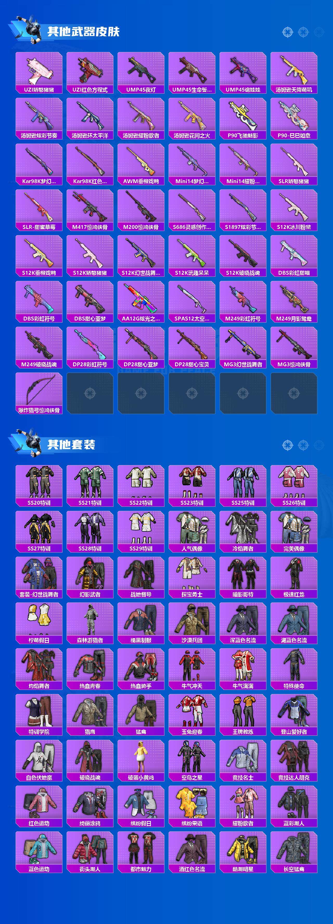 【稀有枪皮】:AKM-影袭,AKM-星之信仰,AKM-环太平洋,AKM-破晓战魂,AKM-霓虹街区,AKM-龙的传人,M16A4-幻世战舞者,M16A4-甜心亚梦,M16A4-蓝色火焰,SCAR-L-玉兔迎春,M416-圣诞惊喜,M416-糯团青竹,M416-蓝色火焰,GROZA-异彩先驱,GROZA-甜蜜草莓,AUG-冰川粉黛,AUG-天降萌叽,AUG-耀粉歌者,QBZ-相思残雪,M762-彩虹甜喵,M762-彩虹符号,M762-甜心宝贝,Mk47-荒漠赏金,G36C-花间之火,AC-VAL-彩虹甜喵,AC-VAL-灵感创作师,AC-VAL-甜心亚梦,蜜獾-垂柳戏鸭,蜜獾-天降萌叽,蜜獾-娇憨猪猪,UZI-娇憨猪猪,UZI-红色方程式,UMP45-夜灯,UMP45-生命誓言,UMP45-诡娃娃,汤姆逊-天降萌叽,汤姆逊-炫彩节奏,汤姆逊-环太平洋,汤姆逊-耀粉歌者,汤姆
