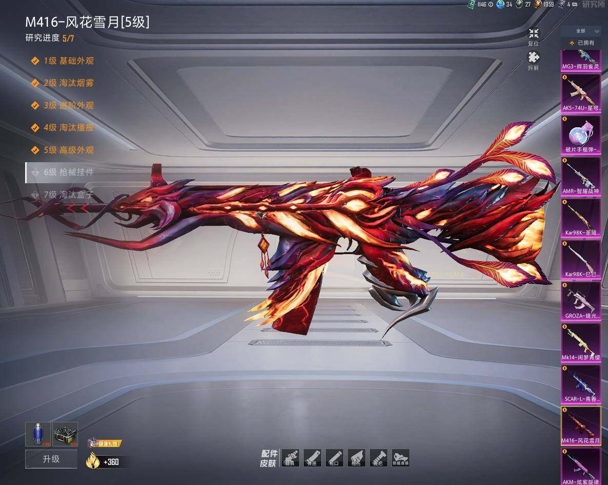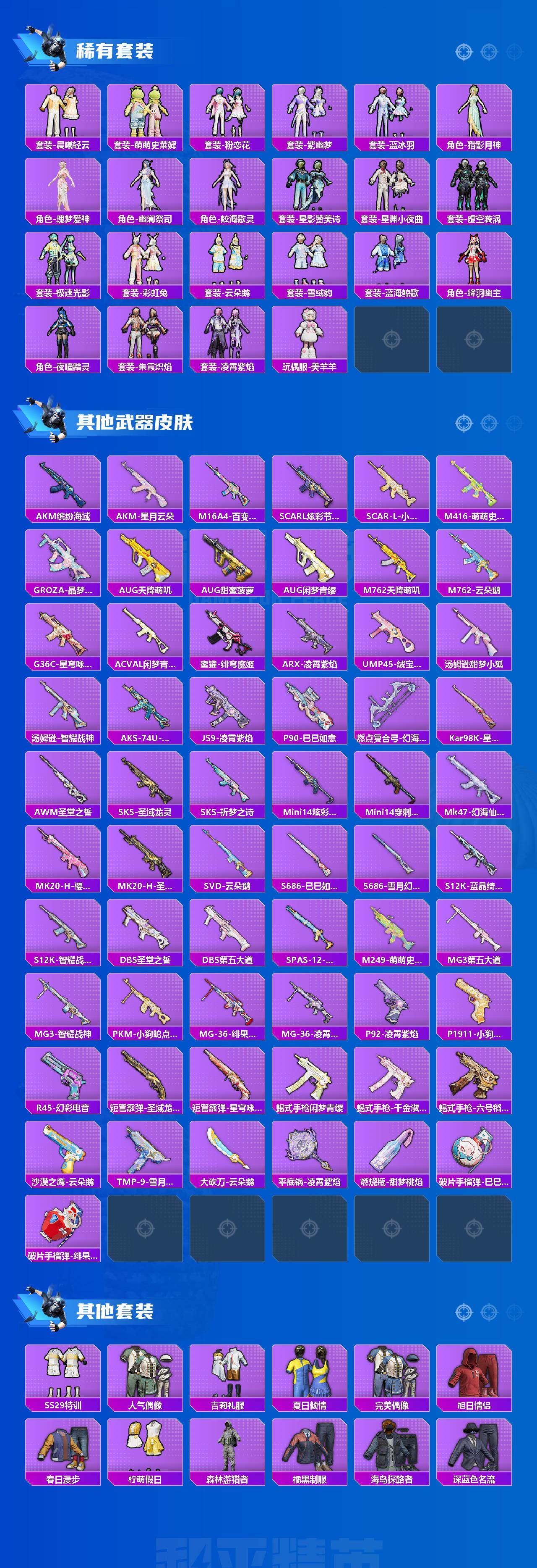 AKM-炫紫旋律,SCAR-L-青春物语,M416-风花雪月,GROZA-镜光银凌,Kar98K-巳巳如意,Kar98K-圣域龙灵,Mk14-闲梦青缨