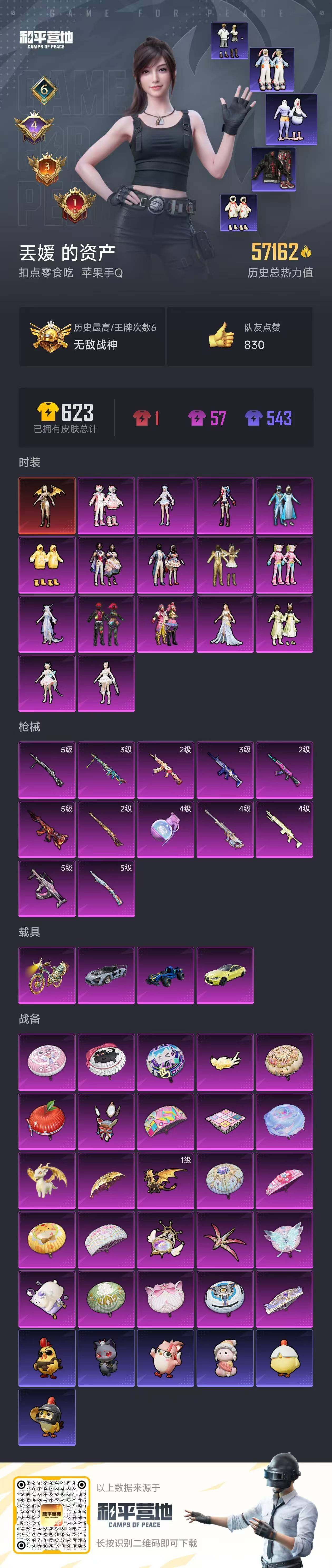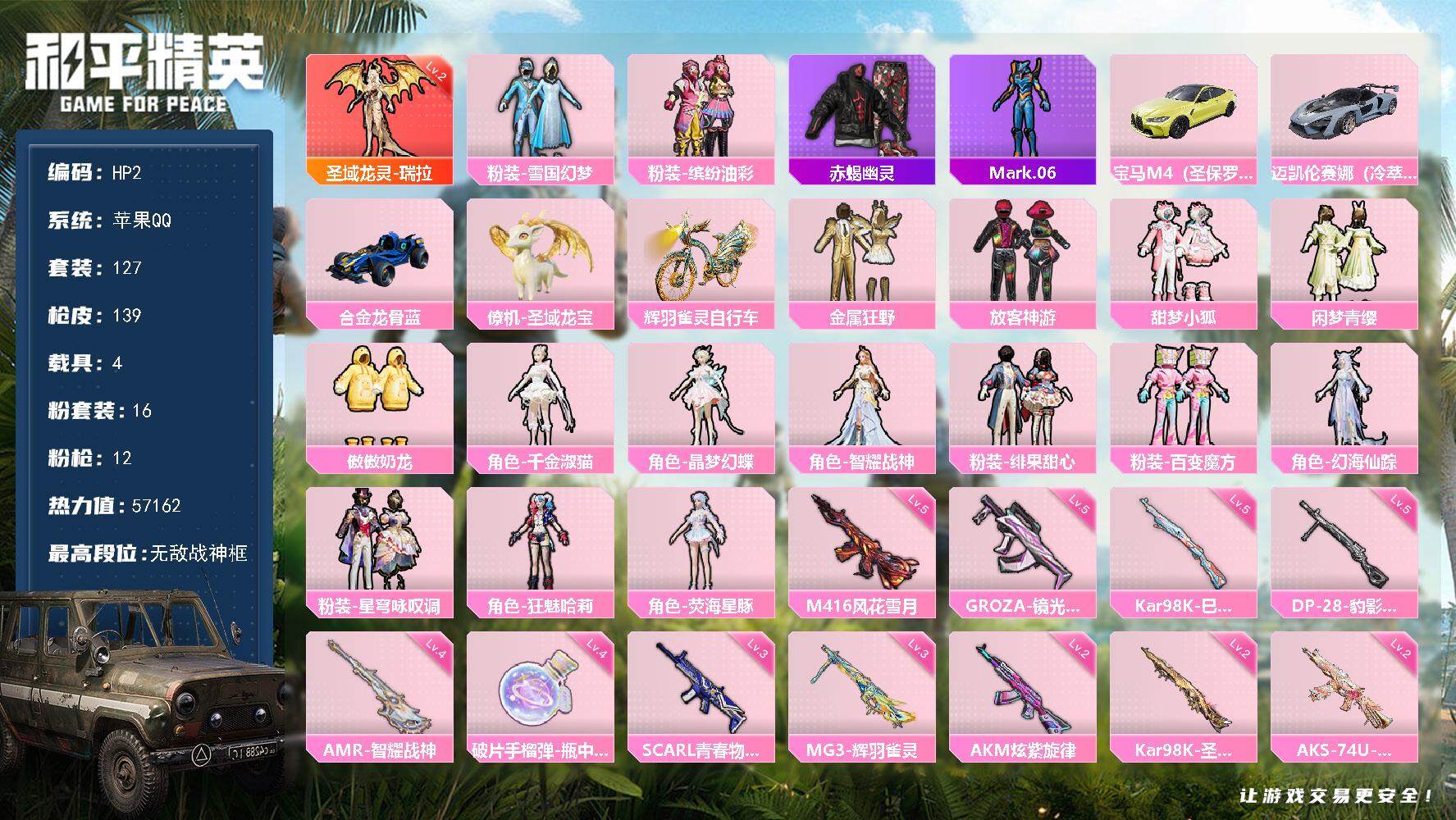[13868172]苹果 手Q-无敌战神框-1神装-16粉装-12特效枪-4载具-7粉色飞行器-57162热力值-6王牌印记-127套装-139枪皮
