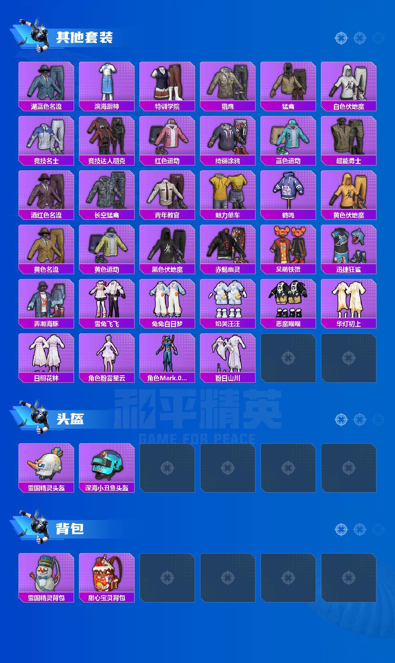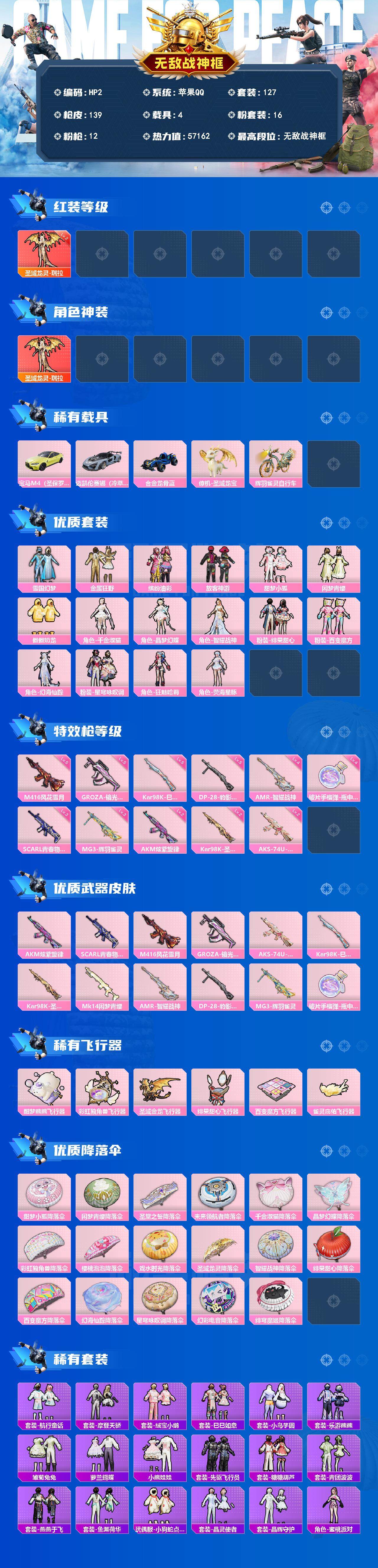 [13868172]苹果 手Q-无敌战神框-1神装-16粉装-12特效枪-4载具-7粉色飞行器-57162热力值-6王牌印记-127套装-139枪皮 【红色神装等级】:圣域龙灵-瑞拉(二级) 【红色角色神装】:圣域龙灵-瑞拉 【热门品类】:粉装-雪国幻梦,粉装-缤纷油彩,套装-赤蝎幽灵,角色-Mark.06 【粉色载具】:宝马M4(圣保罗黄),迈凯伦塞纳(冷萃蓝),合金龙骨(蓝),僚机-圣域龙宝,辉羽雀灵自行车 【粉色套装】:粉装-雪国幻梦,粉装-金属狂野,粉装-缤纷油彩,粉装-放客神游,粉装-甜梦小狐,粉装-闲梦青缨,粉装-傲傲奶龙,角色-千金淑猫,角色-晶梦幻蝶,角色-智耀战神,粉装-绯果甜心,粉装-百变魔方,角色-幻海仙踪,粉装-星穹咏叹调,角色-狂魅哈莉,角色-荧海星豚 【粉色枪皮等级】:AKM-炫紫旋律(二级),SCAR-L-青春物语(三级),M416-风花雪月(五级),GROZA-镜光银凌(五级),AKS-74U-星穹咏叹调(二级),Kar98K-巳巳如意(五级),Kar98K-圣域龙灵(二级),AMR-智耀战神(四级),DP-28-豹影疾电(五级),MG3-辉羽雀灵(三级),破片手榴弹-瓶中星球(四级) 【粉色枪皮】:AKM-炫紫旋律,SCAR-L-青春物语,M416-风花雪月,GROZA-镜光银凌,AKS-74U-星穹咏叹调,Kar98K-巳巳如意,Kar98K-圣域龙灵,Mk14-闲梦青缨,AMR-智耀战神,DP-28-豹影疾电,MG3-辉羽雀灵,破片手榴弹-瓶中星球 【粉色飞行器】:酣梦熊熊飞行器,彩虹独角兽飞行器,圣域金龙飞行器,绯果甜心飞行器,百变魔方飞行器,雀灵庇佑飞行器 【粉色降落伞】:甜梦小狐降落伞,闲梦青缨降落伞,圣堂之誓降落伞,未来领航者降落伞,千金淑猫降落伞,晶梦幻蝶降落伞,彩虹独角兽降落伞,樱桃泡泡降落伞,戏水时光降落伞,圣域龙灵降落伞,智耀战神降落伞,绯果甜心降落伞,百变魔方降落伞,幻海仙踪降落伞,星穹咏叹调降落伞,幻彩电音降落伞,绯穹魔姬降落伞 【稀有套装】:套装-航行童话,套装-摩登天骄,套装-绒宝小鹅,套装-巳巳如意,套装-小鸟芋圆,套装-乐游熊熊,套装-雏菊兔兔,套装-萝兰蝴蝶,套装-小熊娃娃,套装-先驱飞行员,套装-糖糖葫芦,套装-青团波波,套装-燕燕于飞,套装-鱼渊荷华,玩偶服-小狗蛇点点,套装-晶灵使者,套装-晶辉守护,角色-蜜桃