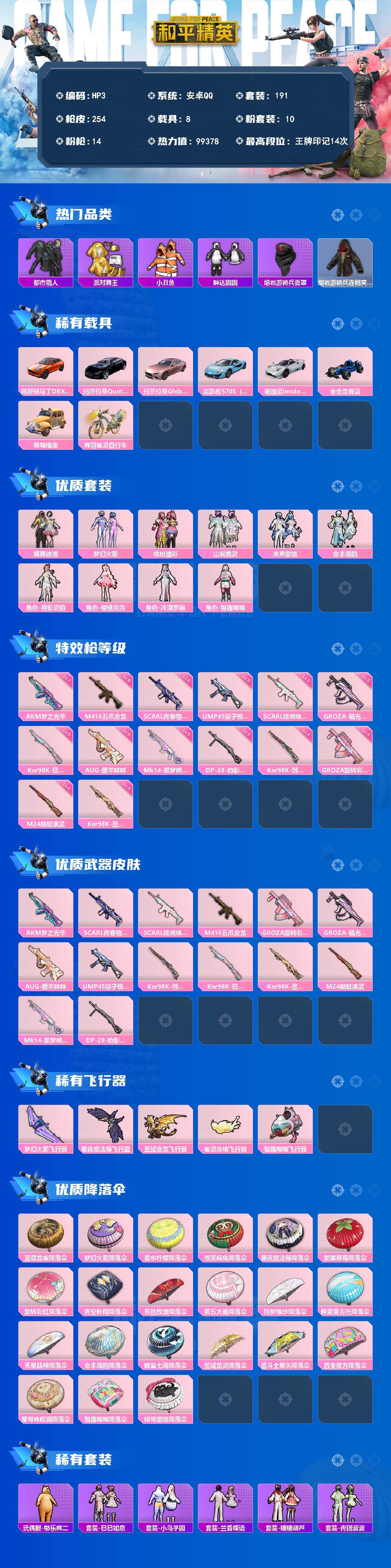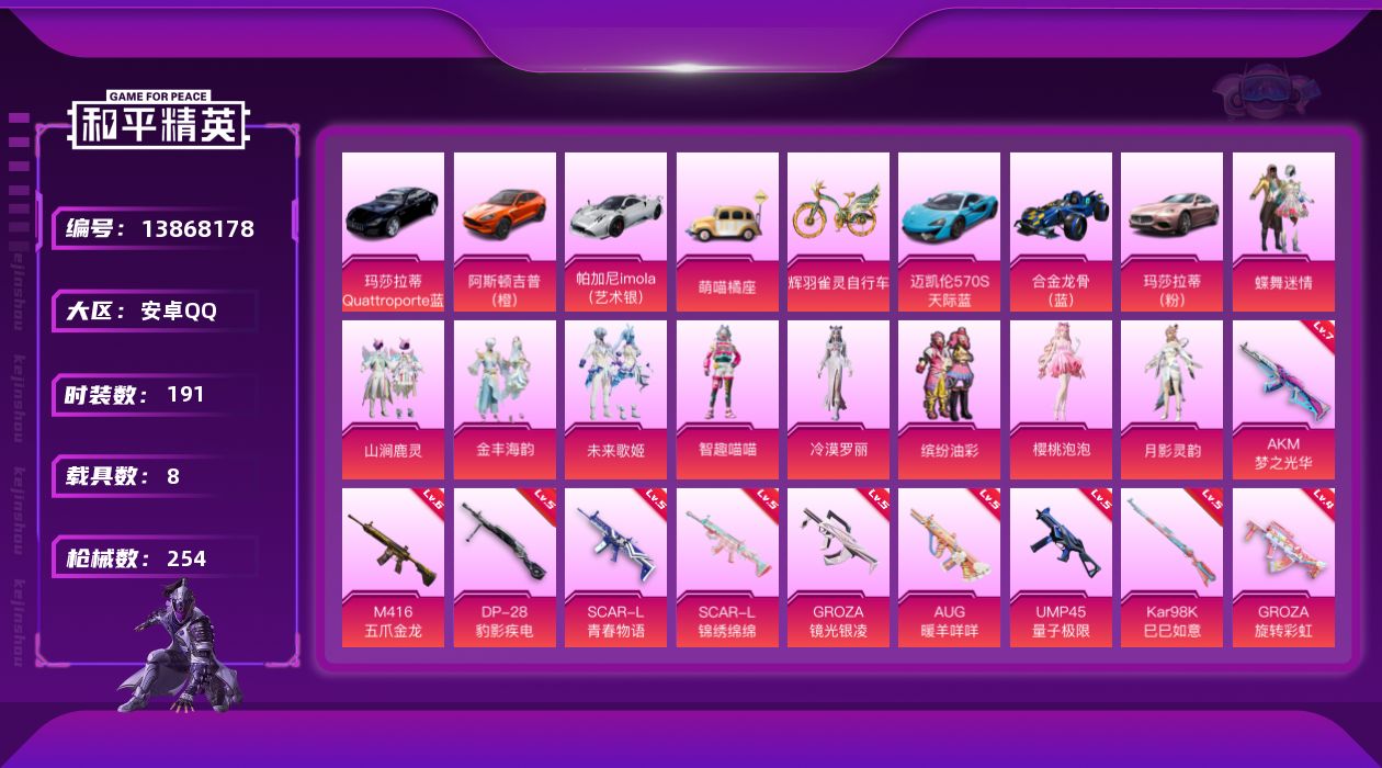 [13868178]安卓 手Q-10粉装-14特效枪-8载具-5粉色飞行器-99378热力值-14王牌印记-191套装-254枪皮 【热门品类】:粉装-梦幻火箭,粉装-缤纷油彩,套装-浪漫天命,套装-都市猎人,套装-派对舞王,套装-小丑鱼,套装-胖达圆圆,套装-龟仙人,套装-暗影哥特,套装-浪漫波比,角色-Mark.06,熔岩游骑兵面罩,熔岩游骑兵连帽夹克 【粉色载具】:阿斯顿马丁DBX(橙),玛莎拉蒂Quattroporte(夜幕蓝),玛莎拉蒂Ghibli(粉),迈凯伦570S(天际蓝),帕加尼imola(艺术银),合金龙骨(蓝),萌喵橘座,辉羽雀灵自行车 【粉色套装】:粉装-蝶舞迷情,粉装-梦幻火箭,粉装-缤纷油彩,粉装-山涧鹿灵,粉装-未来歌姬,粉装-金丰海韵,角色-月影灵韵,角色-樱桃泡泡,角色-冷漠罗丽,角色-智趣喵喵 【粉色枪皮等级】:AKM-梦之光华(七级),SCAR-L-青春物语(五级),SCAR-L-锦绣绵绵(五级),M416-五爪金龙(六级),GROZA-旋转彩虹(四级),GROZA-镜光银凌(五级),AUG-暖羊咩咩(五级),UMP45-量子极限(五级),Kar98K-创世·救赎(四级),Kar98K-巳巳如意(五级),Kar98K-圣域龙灵(三级),M24-翩跹演武(四级),Mk14-甜梦熊击(五级),DP-28-豹影疾电(五级) 【粉色枪皮】:AKM-梦之光华,SCAR-L-青春物语,SCAR-L-锦绣绵绵,M416-五爪金龙,GROZA-旋转彩虹,GROZA-镜光银凌,AUG-暖羊咩咩,UMP45-量子极限,Kar98K-创世·救赎,Kar98K-巳巳如意,Kar98K-圣域龙灵,M24-翩跹演武,Mk14-甜梦熊击,DP-28-豹影疾电 【粉色飞行器】:梦幻火箭飞行器,星夜魔法师飞行翼,圣域金龙飞行器,雀灵庇佑飞行器,智趣喵喵飞行器 【粉色降落伞】:至尊龙雀降落伞,梦幻火箭降落伞,香水柠檬降落伞,怪笑疯兔降落伞,星夜魔法师降落伞,甜蜜草莓降落伞,旋转彩虹降落伞,青空秋雨降落伞,苔丝玫瑰降落伞,第五大道降落伞,纯梦嫁纱降落伞,仲夏莫吉托降落伞,天星战神降落伞,金丰海韵降落伞,脆鲨七海降落伞,圣域龙灵降落伞,圣斗士星矢降落伞,百变魔方降落伞,星穹咏叹调降落伞,智趣喵喵降落伞,绯穹魔姬降落伞 【稀有套装】:套装-龟仙人,玩偶服-憨乐熊二,套装-巳巳如意,套装-