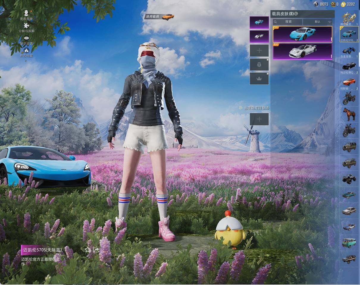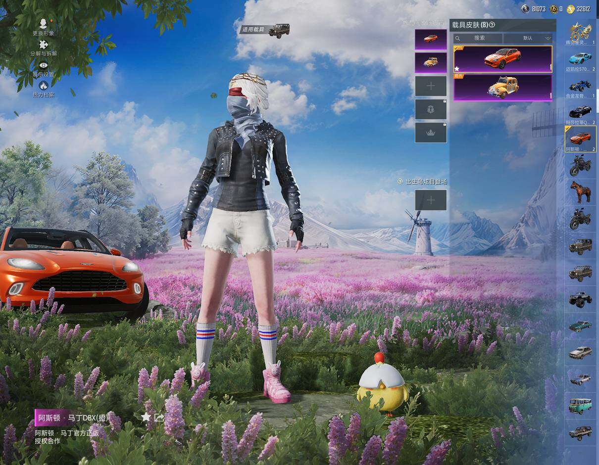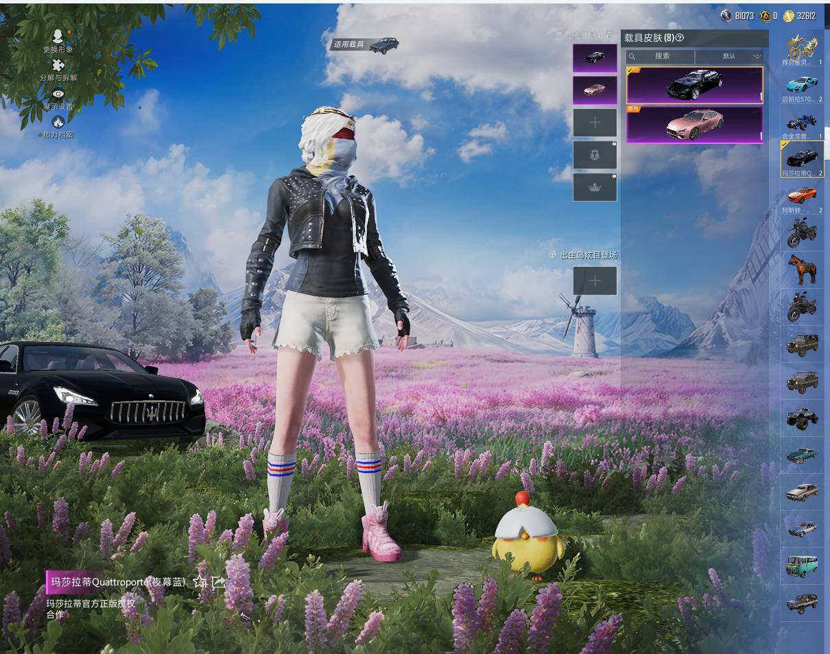 【粉色载具】:阿斯顿马丁DBX(橙),玛莎拉蒂Quattroporte(夜幕蓝),玛莎拉蒂Ghibli(粉),迈凯伦570S(天际蓝),帕加尼imola(艺术银),合金龙骨(蓝),萌喵橘座,辉羽雀灵自行车