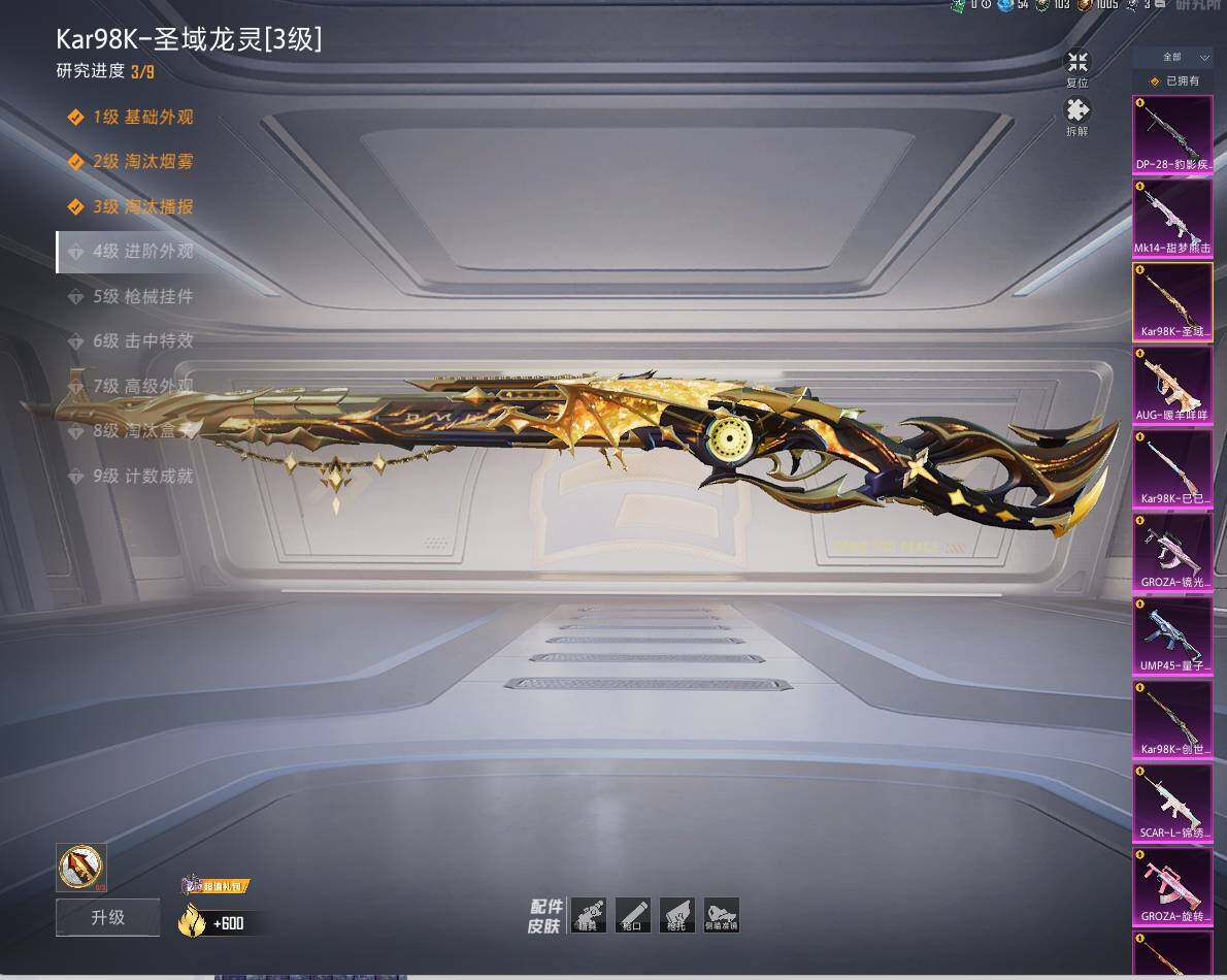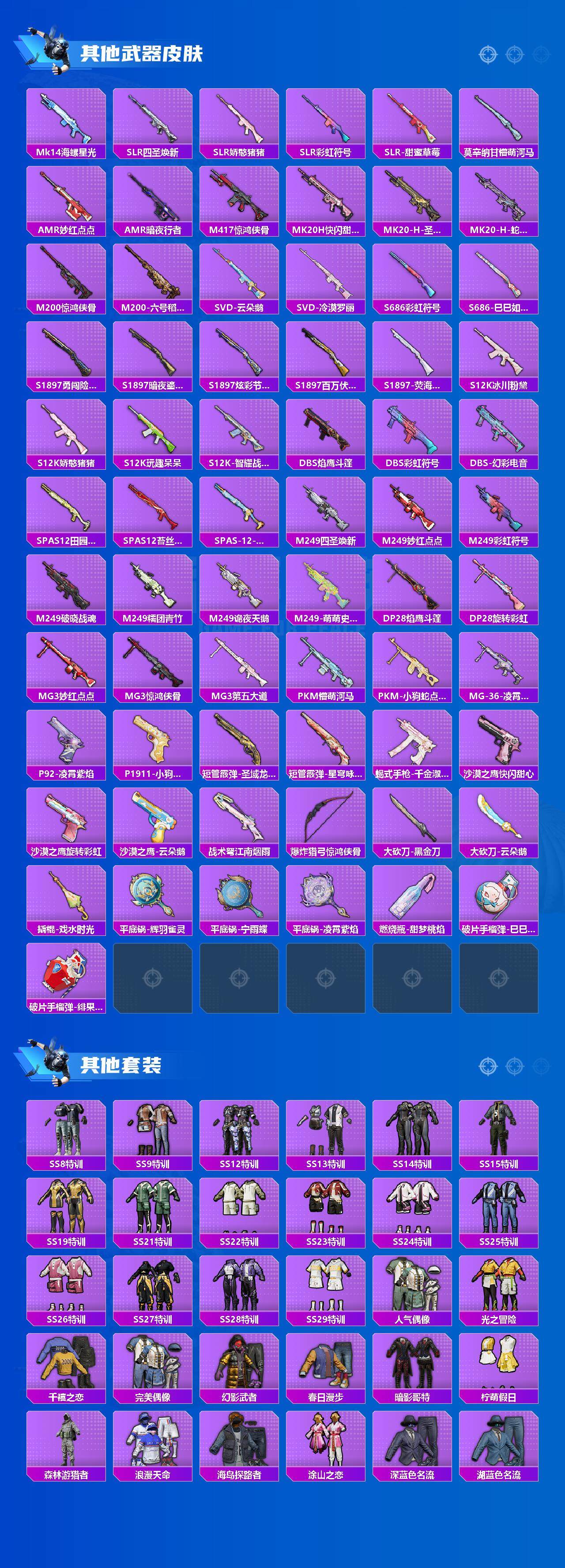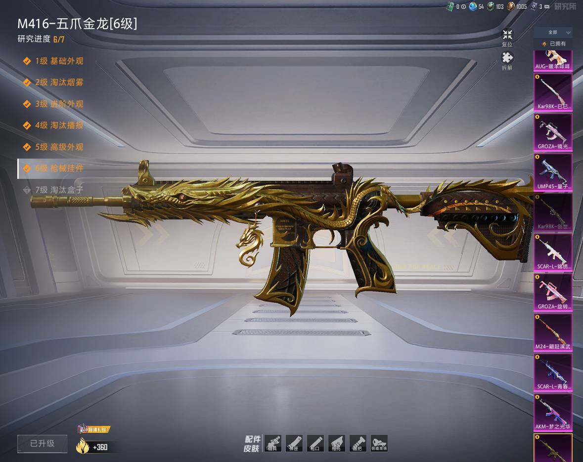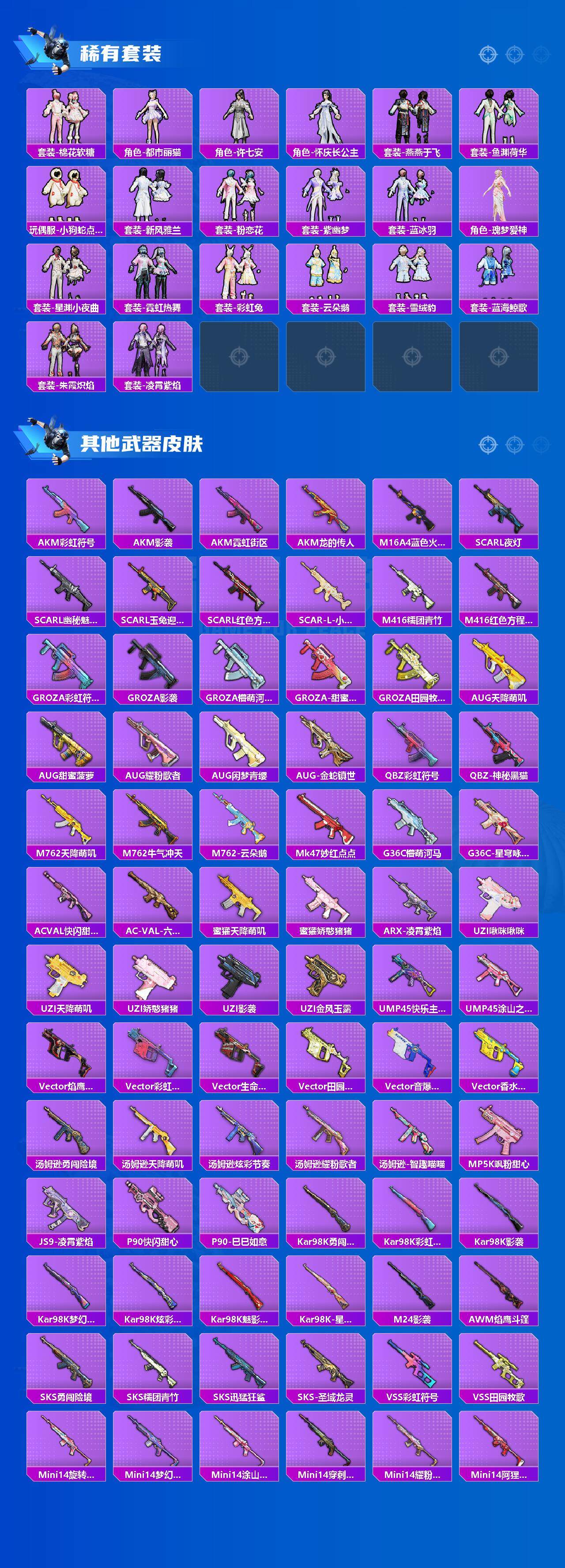 AKM-梦之光华,SCAR-L-青春物语,M416-五爪金龙,GROZA-旋转彩虹,GROZA-镜光银凌,AUG-暖羊咩咩,UMP45-量子极限,Kar98K-创世·救赎,Kar98K-巳巳如意,Kar98K-圣域龙灵,M24-翩跹演武