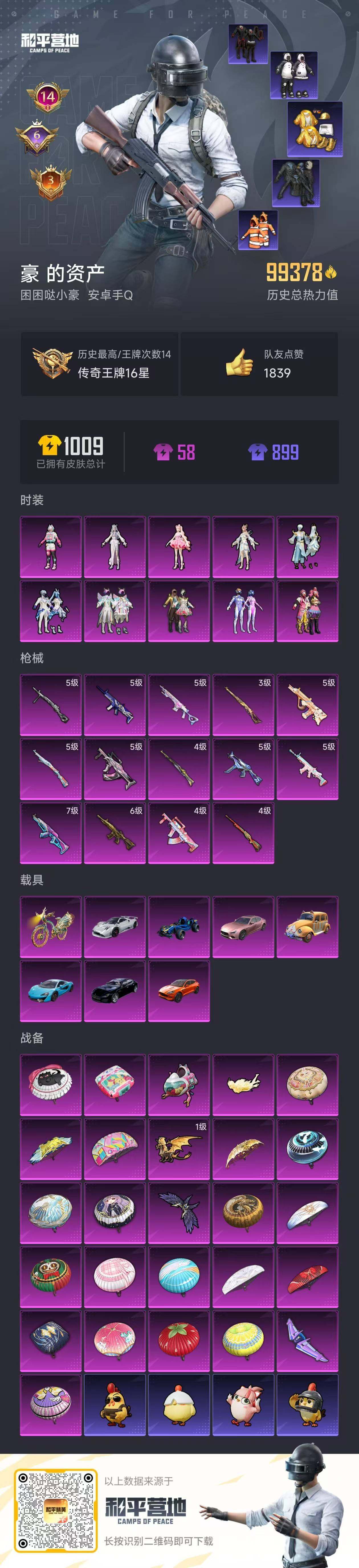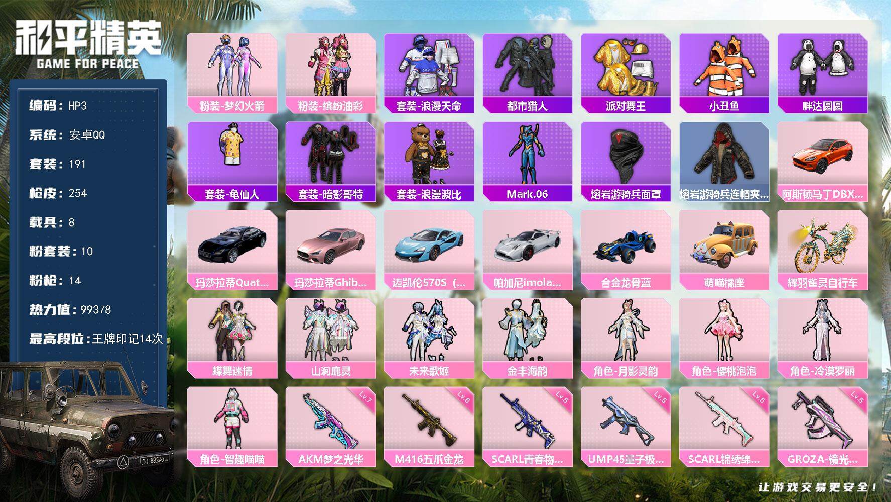 [13868178]安卓 手Q-10粉装-14特效枪-8载具-5粉色飞行器-99378热力值-14王牌印记-191套装-254枪皮