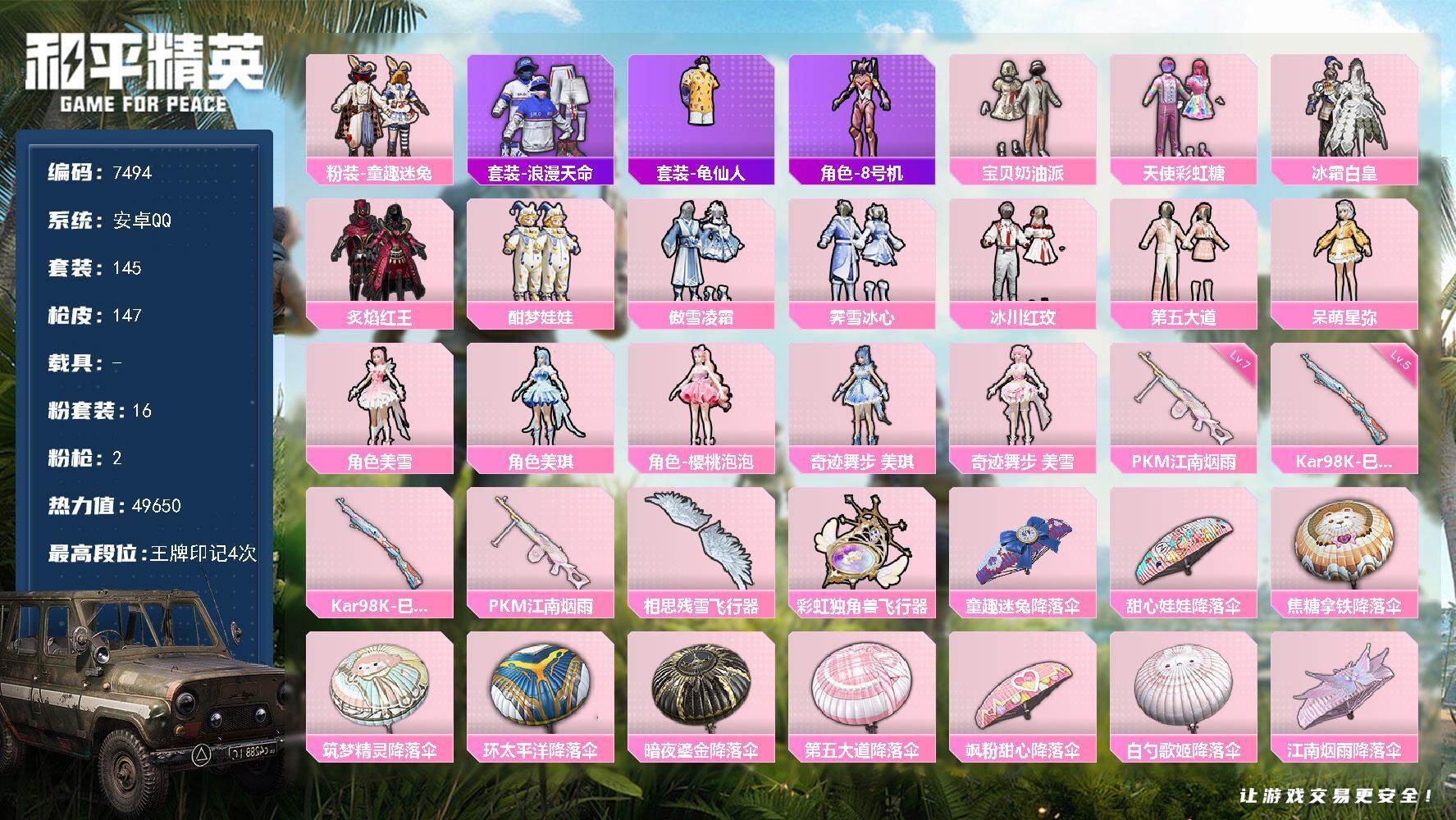 [13868166]安卓 手Q-16粉装-2特效枪-0载具-2粉色飞行器-49650热力值-4王牌印记-145套装-147枪皮
