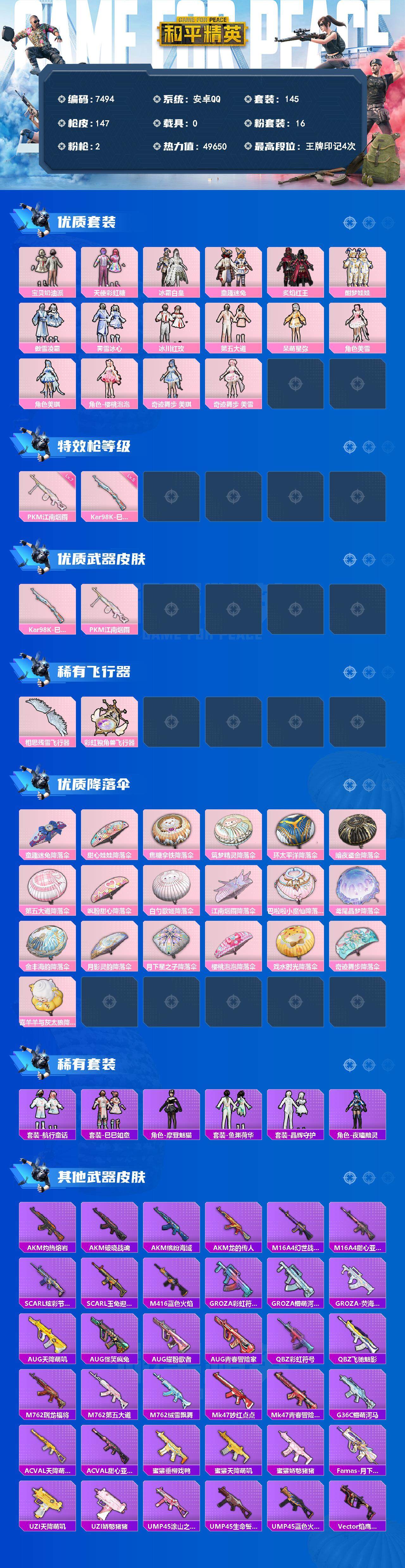 [13868166]安卓 手Q-16粉装-2特效枪-0载具-2粉色飞行器-49650热力值-4王牌印记-145套装-147枪皮 【热门品类】:粉装-童趣迷兔,套装-浪漫天命,套装-龟仙人,角色-8号机 【粉色套装】:粉装-宝贝奶油派,粉装-天使彩虹糖,粉装-冰霜白皇,粉装-童趣迷兔,粉装-炙焰红王,粉装-酣梦娃娃,粉装-傲雪凌霜,粉装-霁雪冰心,粉装-冰川红玫,粉装-第五大道,角色-呆萌星弥,角色-美雪,角色-美琪,角色-樱桃泡泡,角色-奇迹舞步 美琪,角色-奇迹舞步 美雪 【粉色枪皮等级】:Kar98K-巳巳如意(五级),PKM-江南烟雨(七级) 【粉色枪皮】:Kar98K-巳巳如意,PKM-江南烟雨 【粉色飞行器】:相思残雪飞行器,彩虹独角兽飞行器 【粉色降落伞】:童趣迷兔降落伞,甜心娃娃降落伞,焦糖拿铁降落伞,筑梦精灵降落伞,环太平洋降落伞,暗夜鎏金降落伞,第五大道降落伞,飒粉甜心降落伞,白勺歌姬降落伞,江南烟雨降落伞,巴啦啦小魔仙降落伞,鸢尾晶梦降落伞,金丰海韵降落伞,月影灵韵降落伞,月下星之子降落伞,樱桃泡泡降落伞,戏水时光降落伞,奇迹舞步降落伞,喜羊羊与灰太狼降落伞 【稀有套装】:套装-龟仙人,套装-航行童话,套装-巳巳如意,角色-摩登魅猫,套装-鱼渊荷华,套装-晶辉守护,角色-夜瞳黯灵 【稀有枪皮】:AKM-灼热熔岩,AKM-破晓战魂,AKM-缤纷海域,AKM-龙的传人,M16A4-幻世战舞者,M16A4-甜心亚梦,SCAR-L-炫彩节奏,SCAR-L-玉兔迎春,M416-蓝色火焰,GROZA-彩虹符号,GROZA-懵萌河马,GROZA-荧海星豚,AUG-天降萌叽,AUG-怪笑疯兔,AUG-耀粉歌者,AUG-青春冒险家,QBZ-彩虹符号,QBZ-飞驰魅影,M762-瑞龙福将,M762-第五大道,M762-绒雪飘舞,Mk47-妙红点点,Mk47-青春冒险家,G36C-懵萌河马,AC-VAL-天降萌叽,AC-VAL-甜心亚梦,蜜獾-垂柳戏鸭,蜜獾-天降萌叽,蜜獾-娇憨猪猪,Famas-月下星之子,UZI-天降萌叽,UZI-娇憨猪猪,UMP45-涂山之恋,UMP45-生命誓言,UMP45-蓝色火焰,Vector-焰鹰斗篷,Vector-夜灯,Vector-枪炮玫瑰,Vector-田园牧歌,汤姆逊-暗夜鎏金,汤姆逊-耀粉歌者,野牛-青春冒险家,P90-筑梦精灵,P90-飞驰魅影