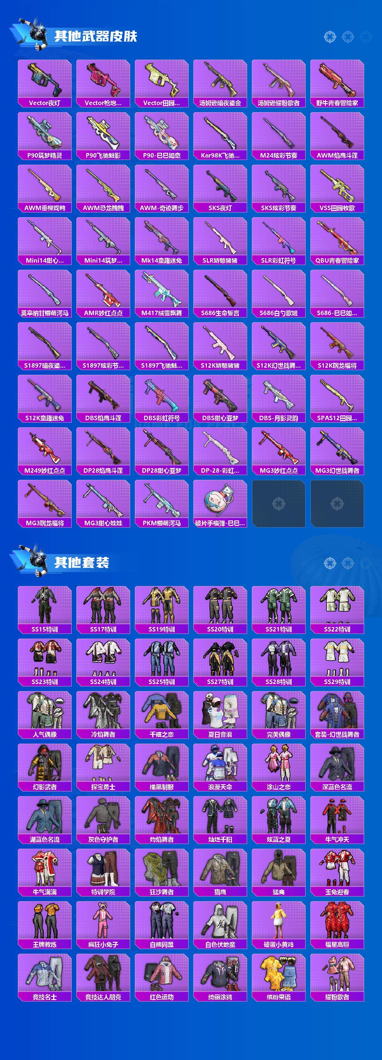 【稀有枪皮】:AKM-灼热熔岩,AKM-破晓战魂,AKM-缤纷海域,AKM-龙的传人,M16A4-幻世战舞者,M16A4-甜心亚梦,SCAR-L-炫彩节奏,SCAR-L-玉兔迎春,M416-蓝色火焰,GROZA-彩虹符号,GROZA-懵萌河马,GROZA-荧海星豚,AUG-天降萌叽,AUG-怪笑疯兔,AUG-耀粉歌者,AUG-青春冒险家,QBZ-彩虹符号,QBZ-飞驰魅影,M762-瑞龙福将,M762-第五大道,M762-绒雪飘舞,Mk47-妙红点点,Mk47-青春冒险家,G36C-懵萌河马,AC-VAL-天降萌叽,AC-VAL-甜心亚梦,蜜獾-垂柳戏鸭,蜜獾-天降萌叽,蜜獾-娇憨猪猪,Famas-月下星之子,UZI-天降萌叽,UZI-娇憨猪猪,UMP45-涂山之恋,UMP45-生命誓言,UMP45-蓝色火焰,Vector-焰鹰斗篷,Vector-夜灯,Vector-枪炮玫瑰,Vector-田园牧歌,汤姆逊-暗夜鎏金,汤姆逊-耀粉歌者,野牛-青春冒险家,P90-筑梦精灵,P90-飞驰魅影
