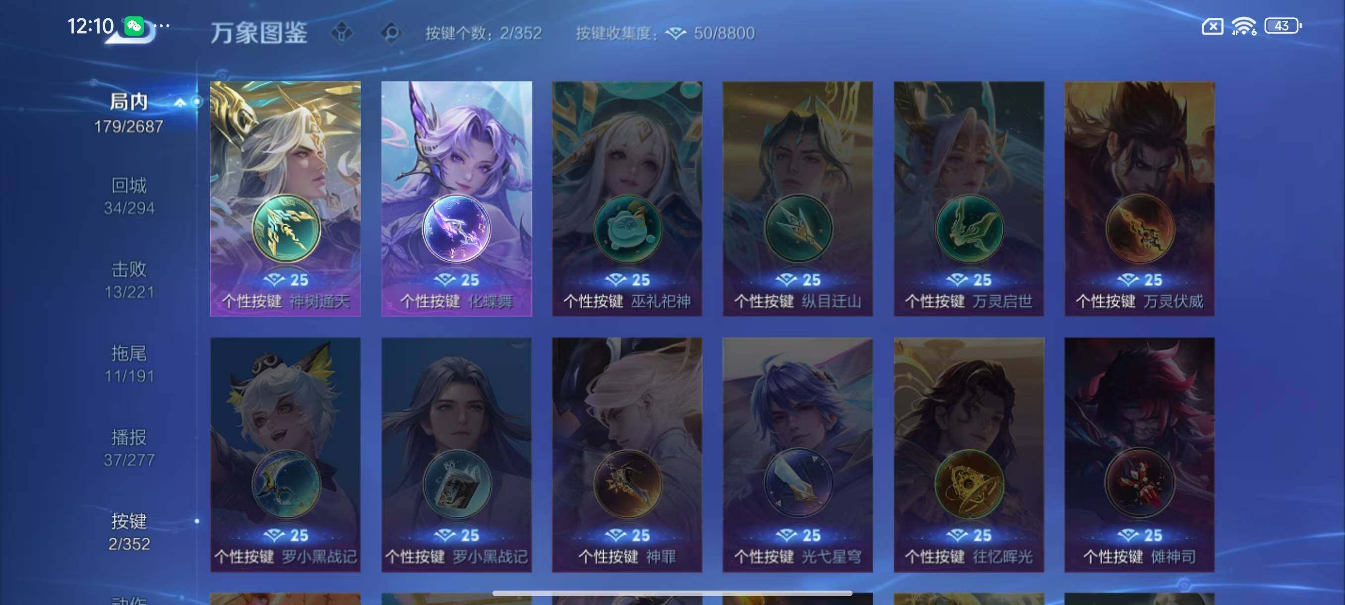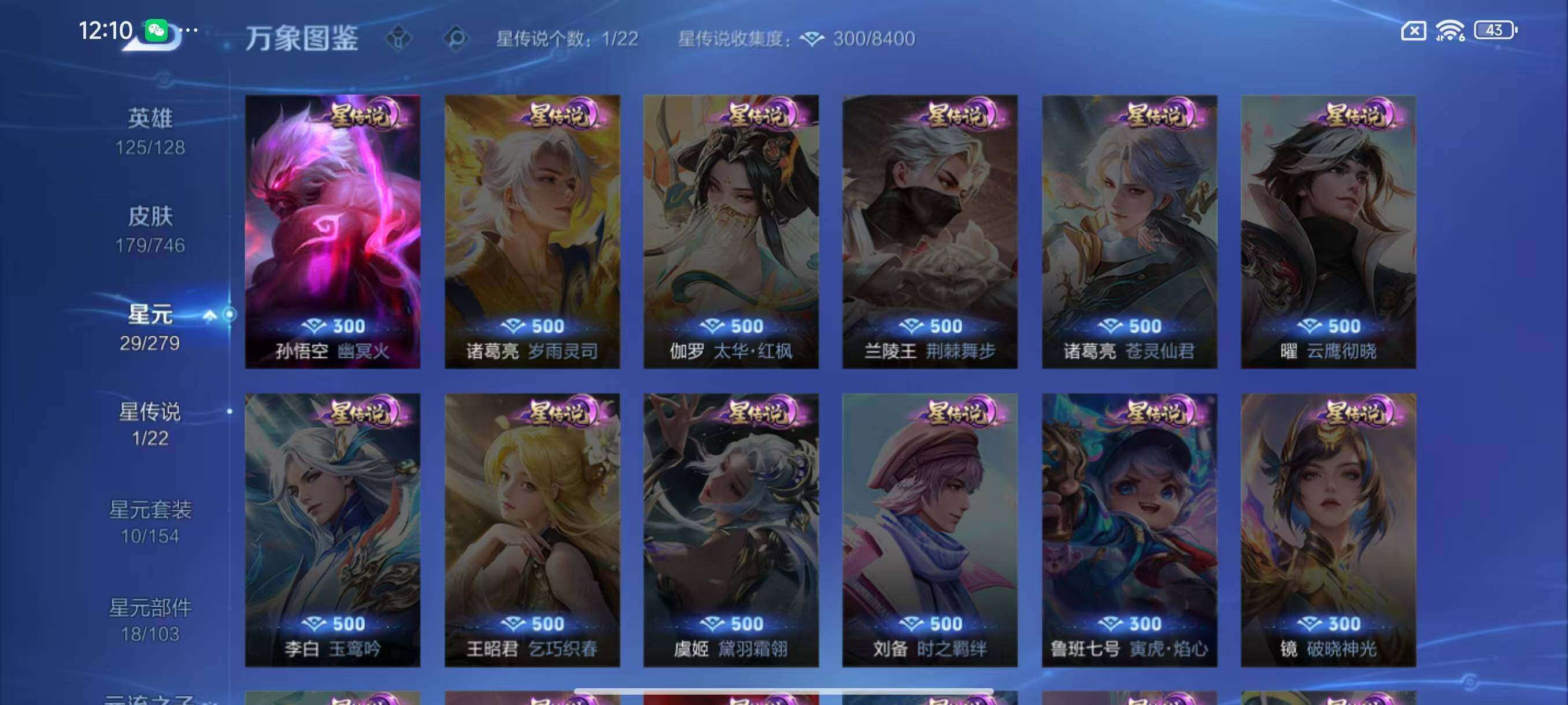 - [11688492]V7 2珍品传说 11传说 124英雄 194皮肤 可修改实名 女号 珍品传说:怪盗基德,器灵·落星盏 传说皮:落雪白狼,续相思,李逍遥,淬星耀世,炽阳神光,音你心动-周瑜,时之恋人-刘备(电焊工) 珍宝阁皮:妄想食味,女武神 限定皮:愿照·千秋盛(女娲年限),鸣野蒿,至尊宝,补天,五谷丰年,天狼溯光者,祈雪灵祝(雪兔子),李小龙,逐梦之影,大圣娶亲,山海·玄木吟(马可年限) 史诗皮:星界战将,茶境仙,炽弈燎原,化蝶舞,紫霞仙子,电玩小子(小书包),特工魅影,电玩·爆裂旋风,江河有灵,百解令(蒙犽),蒙恬荣光圣徽,偶像歌手,末日机甲-吕布,节奏热浪,修罗,水果甜心,天才门将,星夜王子,心灵骇客,暗隐猎兽者,鬼剑武藏,舞动绿茵,纤云弄巧,逐浪之夏,水晶猎龙者,金属风暴,原初追逐者,鹰眼统帅,王者之锤,魅力维加斯,黎明之约,赏金猎手,无心