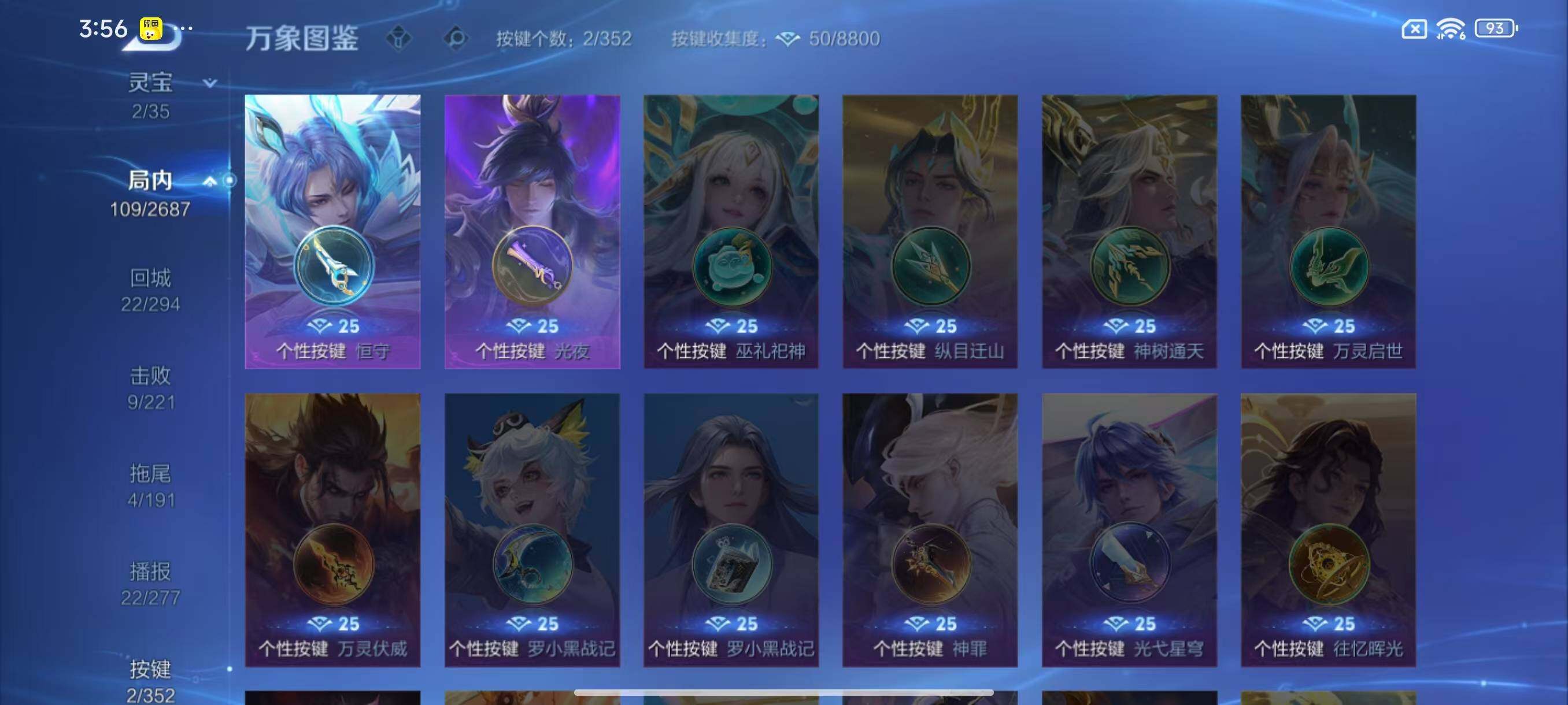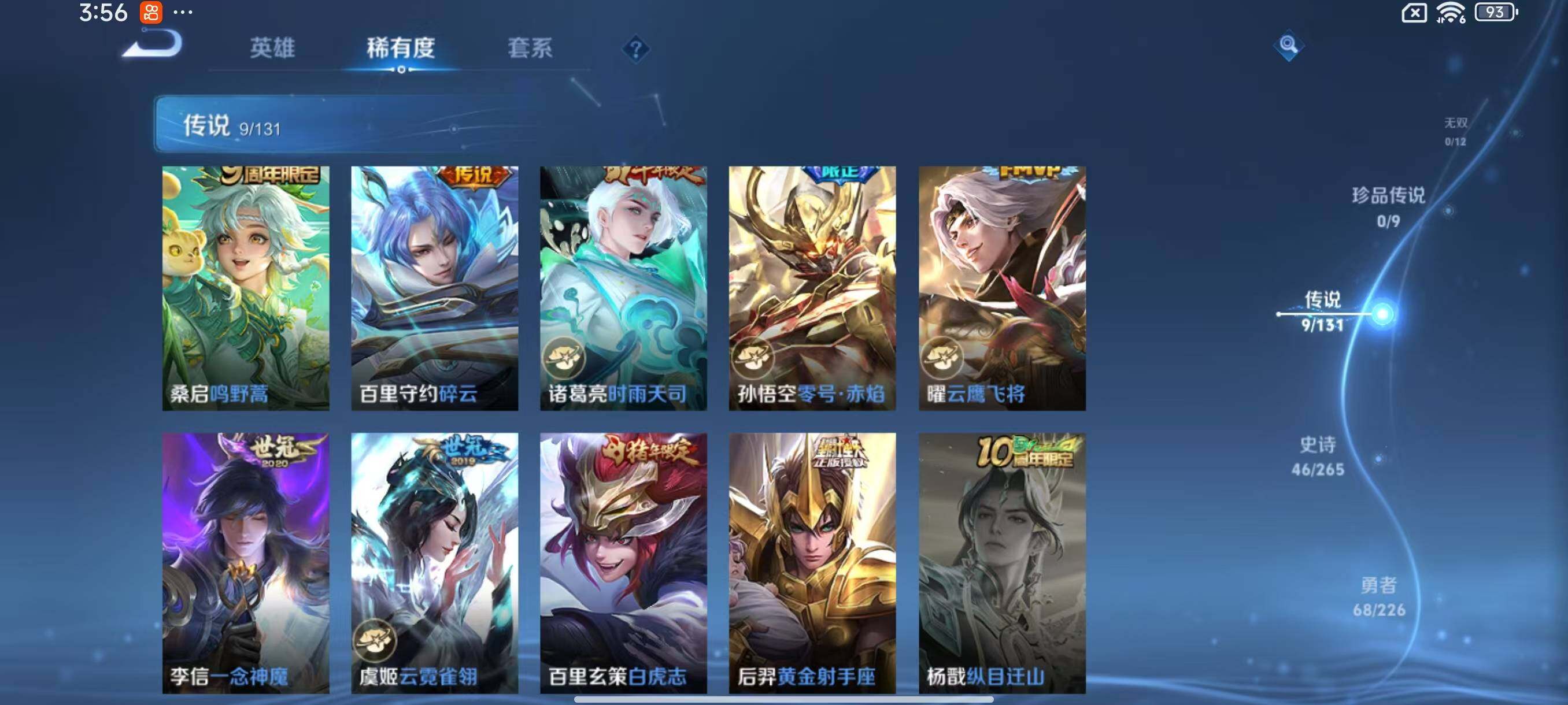 - PX_2104973-Q/最强王者/319皮肤/126英雄/2典藏/0珍品无双/0无双/0珍品传说/34传说/89史诗/10稀有英雄 【2 典藏皮肤】全息碎影 孙悟空,无限飓风号 夏侯惇, 【34 传说皮肤】胖达荣荣 梦奇,武圣 关羽,启明星使 虞姬,云霓雀翎 虞姬,逐花归海 澜,飞鸢探春 李元芳,白虎志 百里玄策,零号·赤焰 孙悟空,地狱火 孙悟空,云鹰飞将 曜,补天 女娲,觅芳踪 艾琳,猫影幻