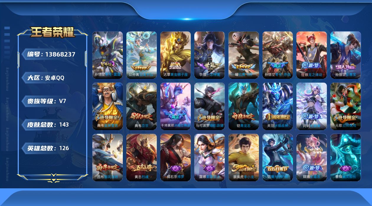 - PX_2094335-安卓QQ 247皮 贵族7级 1典藏 2珍品传说 30传说 75史诗【荣耀典藏】九霄神辉【珍品传说】器灵·落星盏,怪盗基德【传说皮肤】时之恋人,黄金射手座,无尽星芒,黄金天蝎座,挚爱花嫁,玄雷天君,末日机甲,齐天大圣,乘龙·淬吴钩,挚爱之约,末日机甲,地狱之眼,久胜战神,云鹰飞将,一念神魔,飞鸢探春,鸣野蒿,愿照·九州拓,逐花归海,冠军飞将,启明星使,云霓雀翎,寅虎·赤拳,猫