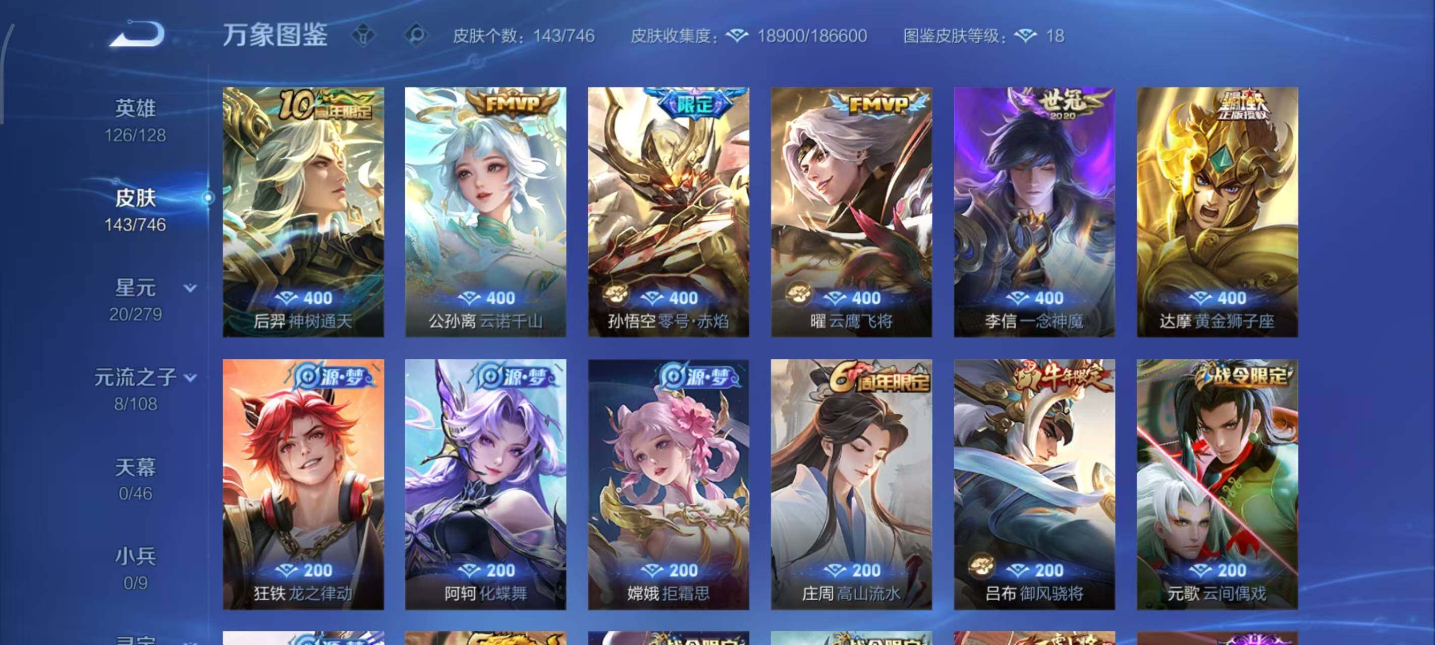 【传说皮肤】:后羿神树通天,公孙离云诺千山,孙悟空零号赤焰,曜云鹰飞将,李信一念神魔,达摩黄金狮子座