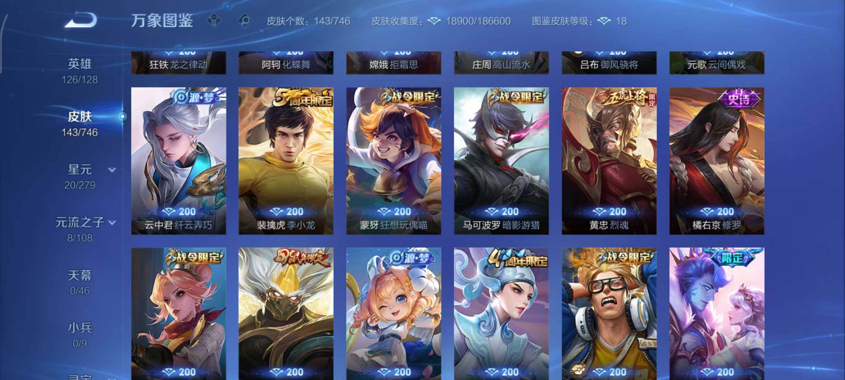 【限定皮肤】:白起狰,狄仁杰阴阳师,虞姬凯尔特女王,赵云皇家上将,嬴政白昼王子,孙尚香蔷薇恋人,庄周高山流水,阿轲迷踪丽影,吕布猎兽之王,吕布御风骁将,元歌云间偶戏,夏侯惇朔风刀,甄姬游园惊梦,典韦蓝屏警告,典韦岱宗,马可波罗暗影游猎,狄仁杰魔术师,狄仁杰万华元夜,项羽海滩派对,老夫子醍醐杖,关羽冰锋战神,程咬金演武夺筹,刘邦夺宝奇兵,亚瑟潮玩骑士王,孙悟空至尊宝,孙悟空零号赤焰,牛魔御旌,钟馗驱傩正仪,女娲朔望之晖,干将莫邪冰霜恋舞曲,雅典娜单词大作战,蔡文姬繁星吟游,鬼谷子原初探秘者,黄忠烈魂,铠青龙志,苏烈千军破阵,弈星混沌棋,明世隐疑决卦,裴擒虎李小龙,狂铁御狮,米莱狄御霄,云中君纤云弄巧,盾山御銮,猪八戒西部大镖客,上官婉儿梁祝,嫦娥拒霜思,蒙犽狂想玩偶喵
