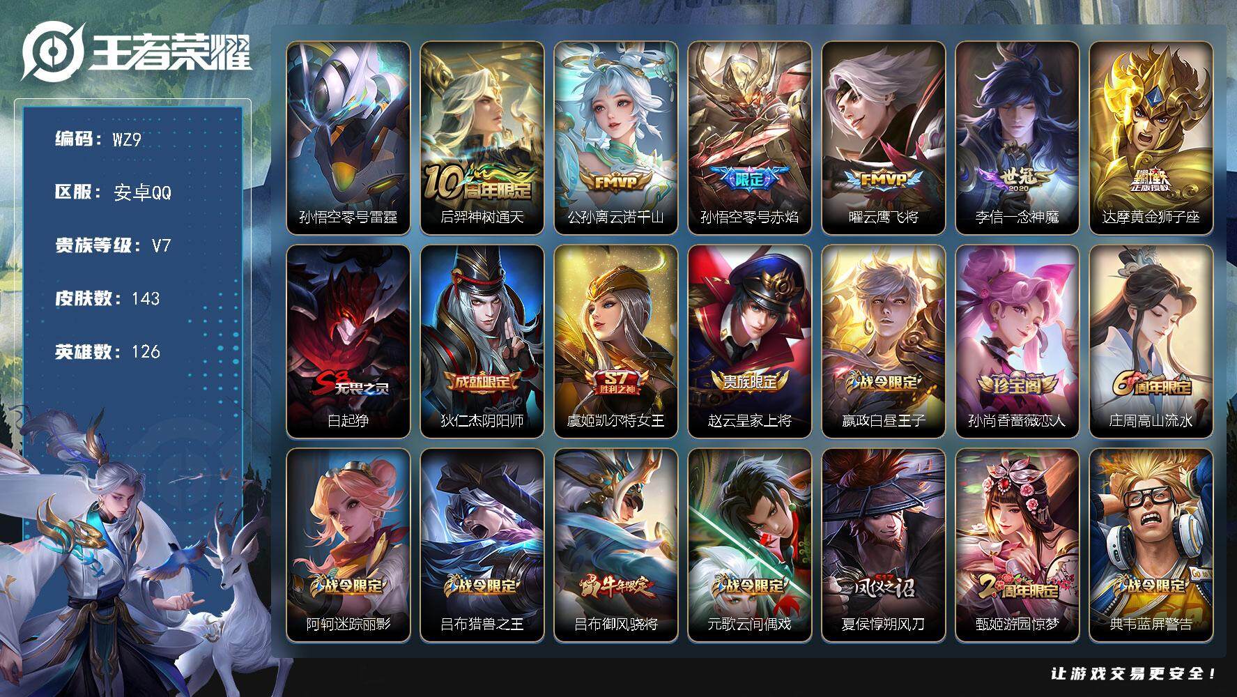 - [12248174]【特价急出/详情看图】:安卓Q-V10-至尊星耀II段位-126英雄-486皮肤-3典藏-3无双-1珍品传说-49传说-160史诗 【荣耀典藏】:武则天英雄,夏侯惇无限飓风号,花木兰九霄神辉,虞姬神鉴启示录 【无双皮肤】:武则天神器明辉仪,韩信群星魔术团,诸葛亮天机白泽 【珍品传说】:暃朽木白哉 【传说皮肤】:干将莫邪千山共赴,大司命死亡执政官,司马懿九山相柳,桑启鸣野蒿,亚连落雪白狼,赵云乘龙铭钟鼎,艾琳觅芳踪,吕布遇见神鼓,云缨鹤归松栖,张飞百相守梦,花木兰燃星之曲,孙悟空齐天大圣,小乔山海琳琅生,曜山海苍雷引,李信山海炽霜斩,吕布怒海麟威,橘右京枫霜尽,露娜启示之音,女娲补天,裴擒虎寅虎赤拳,鲁班七号寅虎瑞焰,貂蝉遇见胡旋,赵云淬星耀世,曜李逍遥 ,铠绛天战甲,镜炽阳神光,虞姬启明星使,孙悟空零号赤焰,关羽武圣,曜云鹰飞将,李信一念神魔,刘备时之恋人,伽罗太华,貂蝉猫影幻舞,张良黄金白羊座,干将莫邪久胜战神,虞姬云霓雀翎,百里玄策白虎志,花木兰冠军飞将,梦奇胖达荣荣,杨戬永曜之星,诸葛亮武陵仙君,貂蝉仲夏夜之梦,李白凤求凰,孙尚香末日机甲,宫本武藏地狱之眼,孙悟空地狱火,吕布天魔缭乱,武则天海洋之心 【限定皮肤】:白起狰,虞姬夏日便利店,姜子牙天穹之誓,杨戬破阵退雄兵,狄仁杰阴阳师,廉颇寅虎御盾,小乔山海琳琅生,赵云皇家上将,赵云引擎之心,赵云龙胆,墨子神迹守卫,嬴政白昼王子,鲁班七号狮舞东方,鲁班七号乒乒小将,鲁班七号寅虎瑞焰,庄周玄嵩,庄周高山流水,高渐离玩趣恶龙,阿轲迷踪丽影,钟无艳超时空战士,孙膑寅虎展翼,扁鹊奇幻香踪,白起夜都怪侠,芈月重明,芈月幻夜卜梦,吕布天魔缭乱,吕布猎兽之王,吕布御风骁将,吕布遇见神鼓,周瑜赤莲之焰,元歌云间偶戏,元歌无心,夏侯惇朔风刀,甄姬幽恒,甄姬女儿国国王,甄姬游园惊梦,甄姬落雪兰心,曹操烛龙,曹操天狼征服者,典韦穷奇,典韦蓝屏警告,典韦岱宗,马可波罗逐梦之星,马可波罗暗影游猎,马可波罗山海玄木吟,狄仁杰魔术师,狄仁杰万华元夜,达摩星际陆战队,达摩沙漠行僧,项羽海滩派对,老夫子醍醐杖,老夫子航海奇遇记,关羽冰锋战神,关羽武圣,关羽百相守梦,貂蝉逐梦之音,貂蝉遇见胡旋,程咬金演武夺筹,露娜一生所爱,露娜启示之音,刘邦夺宝奇兵,韩信飞衡,王昭君凤凰于飞,王昭君午后时光,兰陵王驯魔猎人,兰陵王金庭之子,花木兰青春决赛季,花木