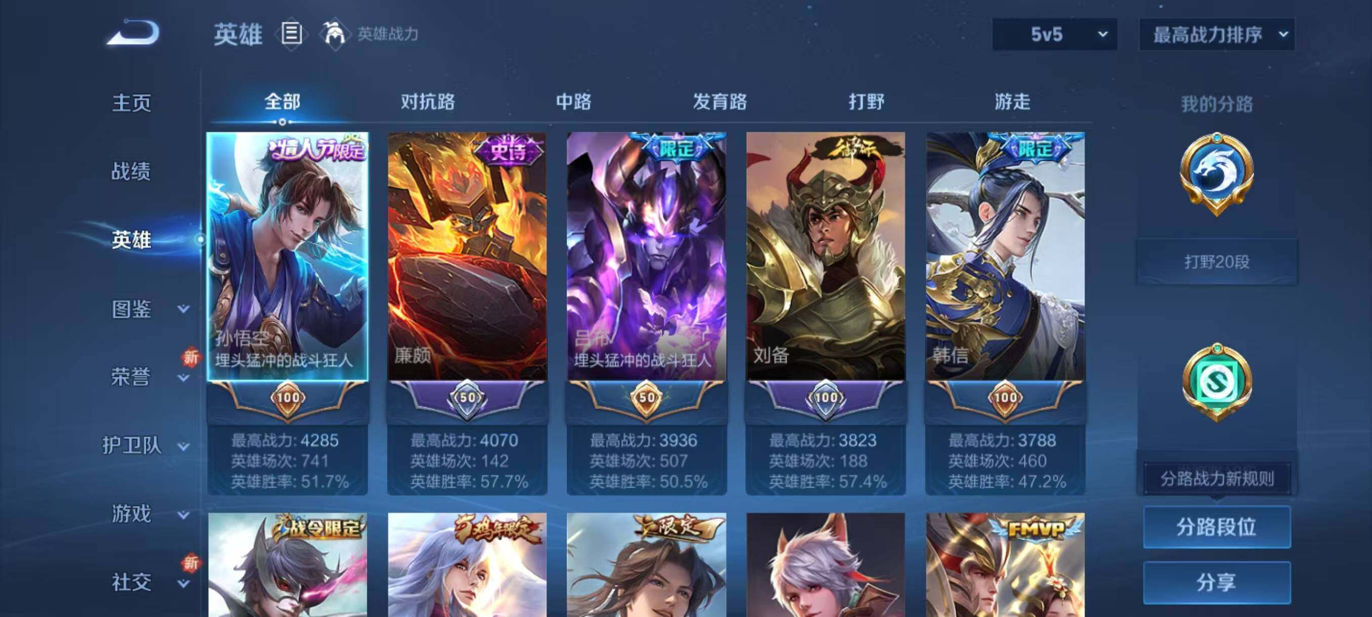 - [11296336]V5 2传说 106英雄 91皮肤 可修改实名 优质装备:末日机甲-孙尚香(绿蚂蚱),超时空战士-狄仁杰 限定皮:李小龙,冰霜恋舞曲 史诗皮:茶境仙,修罗,绅士熊喵,纤云弄巧,繁星吟游(呼啦呼啦),拒霜思,逐浪之夏,鹰眼统帅,未来纪元-赵云