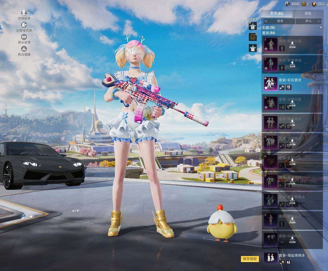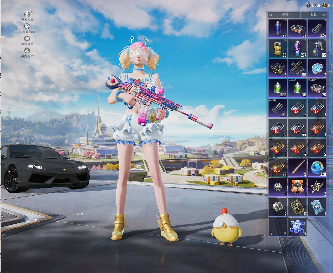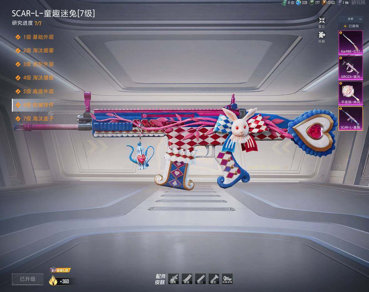 【粉色枪皮等级】:SCAR-L-童趣迷兔(七级),GROZA-镜光银凌(五级),Kar98K-巳巳如意(五级),平底锅-林间仙鹿(七级)