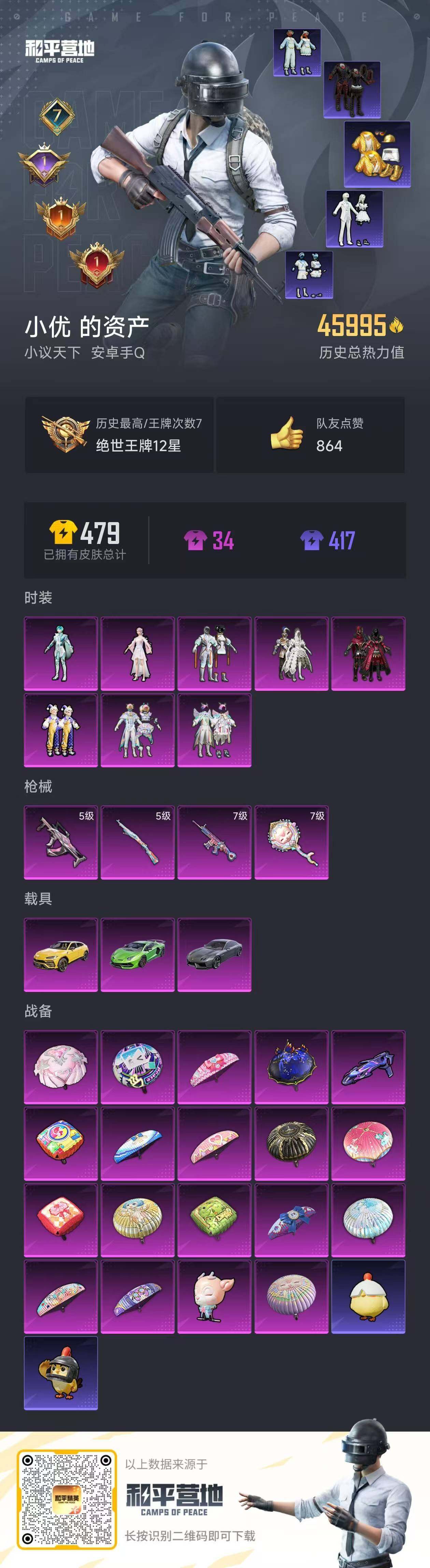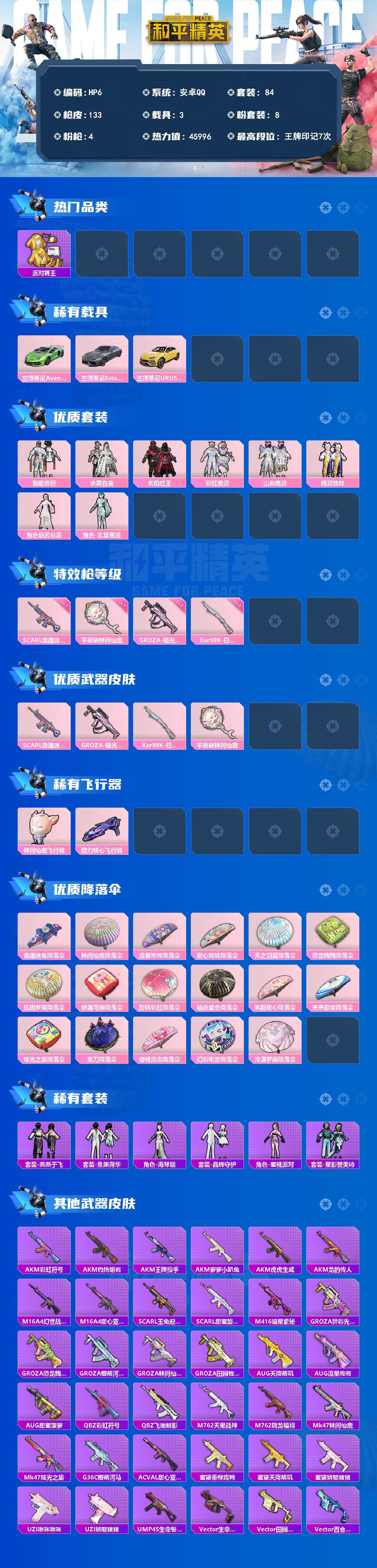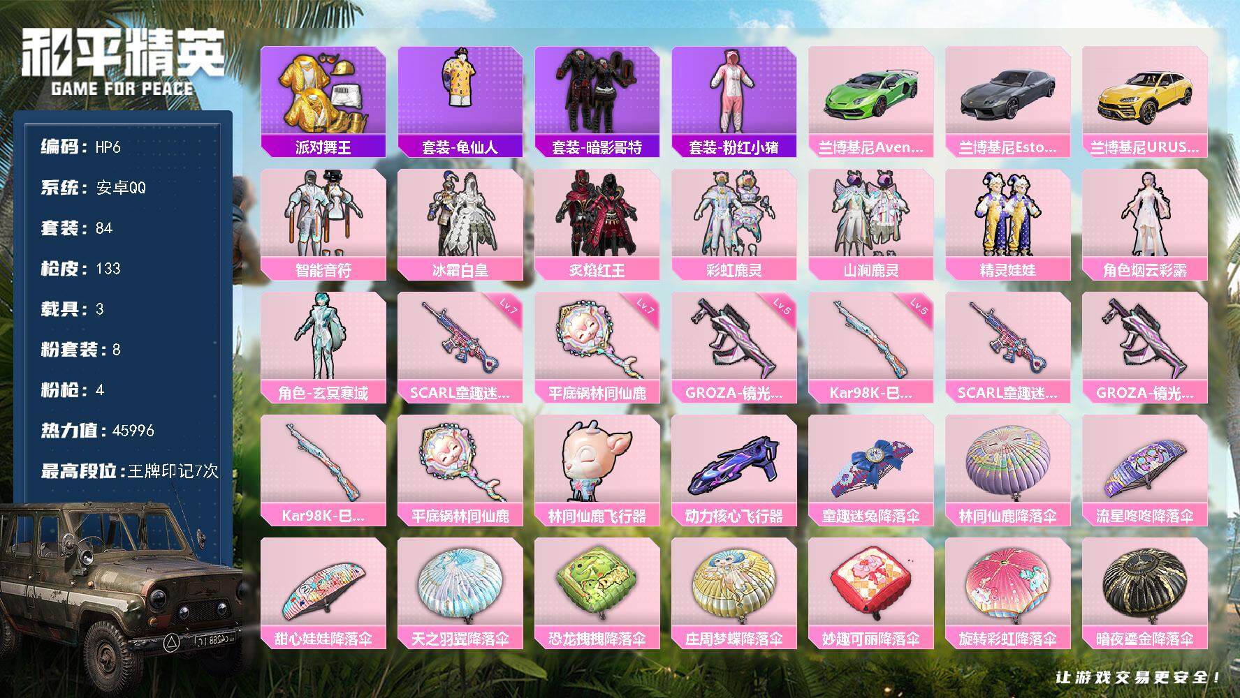 [13868271]安卓 手Q-8粉装-4特效枪-3载具-2粉色飞行器-45996热力值-7王牌印记-84套装-133枪皮 【热门品类】:套装-派对舞王,套装-龟仙人,套装-暗影哥特,套装-粉红小猪 【粉色载具】:兰博基尼Aventador SVJ(翡翠绿),兰博基尼Estoque(银翼灰),兰博基尼URUS(明艳黄) 【粉色套装】:粉装-智能音符,粉装-冰霜白皇,粉装-炙焰红王,粉装-彩虹鹿灵,粉装-山涧鹿灵,粉装-精灵娃娃,角色-烟云彩露,角色-玄冥寒域 【粉色枪皮等级】:SCAR-L-童趣迷兔(七级),GROZA-镜光银凌(五级),Kar98K-巳巳如意(五级),平底锅-林间仙鹿(七级) 【粉色枪皮】:SCAR-L-童趣迷兔,GROZA-镜光银凌,Kar98K-巳巳如意,平底锅-林间仙鹿 【粉色飞行器】:林间仙鹿飞行器,动力核心飞行器 【粉色降落伞】:童趣迷兔降落伞,林间仙鹿降落伞,流星咚咚降落伞,甜心娃娃降落伞,天之羽翼降落伞,恐龙拽拽降落伞,庄周梦蝶降落伞,妙趣可丽降落伞,旋转彩虹降落伞,暗夜鎏金降落伞,飒粉甜心降落伞,未来歌姬降落伞,炫光之旅降落伞,鬼刀降落伞,樱桃泡泡降落伞,幻彩电音降落伞,冷漠罗丽降落伞 【稀有套装】:套装-龟仙人,套装-燕燕于飞,套装-鱼渊荷华,角色-海琴烟,套装-晶辉守护,角色-蜜桃派对,套装-星影赞美诗 【稀有枪皮】:AKM-彩虹符号,AKM-灼热熔岩,AKM-王牌投手,AKM-萝萝小趴兔,AKM-虎虎生威,AKM-龙的传人,M16A4-幻世战舞者,M16A4-甜心亚梦,SCAR-L-玉兔迎春,SCAR-L-甜蜜旋律,M416-暗星紫秘,GROZA-异彩先驱,GROZA-恐龙拽拽,GROZA-懵萌河马,GROZA-林间仙鹿,GROZA-田园牧歌,AUG-天降萌叽,AUG-流星咚咚,AUG-甜蜜菠萝,QBZ-彩虹符号,QBZ-飞驰魅影,M762-天星战神,M762-瑞龙福将,Mk47-林间仙鹿,Mk47-炫光之旅,G36C-懵萌河马,AC-VAL-甜心亚梦,蜜獾-垂柳戏鸭,蜜獾-天降萌叽,蜜獾-娇憨猪猪,UZI-啾咪啾咪,UZI-娇憨猪猪,UMP45-生命誓言,Vector-生命誓言,Vector-田园牧歌,Vector-百合蜜语,Vector-魅影蝠王,汤姆逊-天降萌叽,汤姆逊-异彩先驱,汤姆逊-林间仙鹿,汤姆逊-樱桃泡泡,MP5K-异彩先驱,A