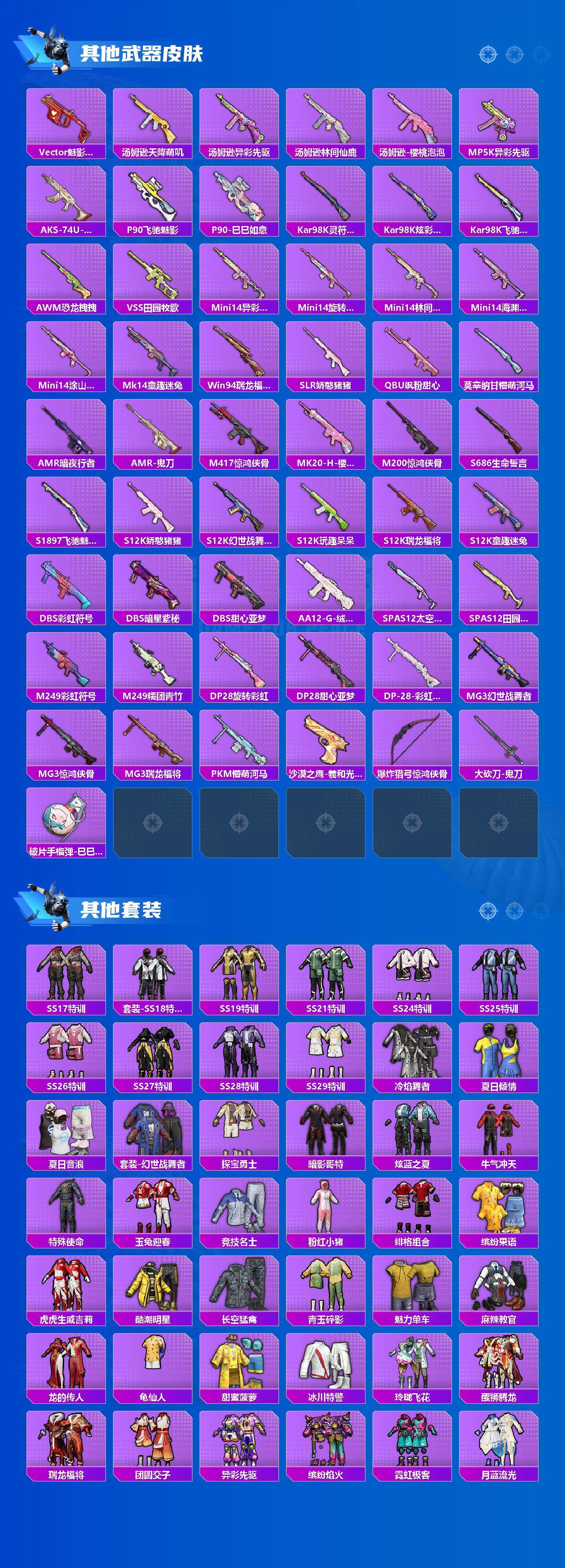 【稀有枪皮】:AKM-彩虹符号,AKM-灼热熔岩,AKM-王牌投手,AKM-萝萝小趴兔,AKM-虎虎生威,AKM-龙的传人,M16A4-幻世战舞者,M16A4-甜心亚梦,SCAR-L-玉兔迎春,SCAR-L-甜蜜旋律,M416-暗星紫秘,GROZA-异彩先驱,GROZA-恐龙拽拽,GROZA-懵萌河马,GROZA-林间仙鹿,GROZA-田园牧歌,AUG-天降萌叽,AUG-流星咚咚,AUG-甜蜜菠萝,QBZ-彩虹符号,QBZ-飞驰魅影,M762-天星战神,M762-瑞龙福将,Mk47-林间仙鹿,Mk47-炫光之旅,G36C-懵萌河马,AC-VAL-甜心亚梦,蜜獾-垂柳戏鸭,蜜獾-天降萌叽,蜜獾-娇憨猪猪,UZI-啾咪啾咪,UZI-娇憨猪猪,UMP45-生命誓言,Vector-生命誓言,Vector-田园牧歌,Vector-百合蜜语,Vector-魅影蝠王,汤姆逊-天降萌叽,汤姆逊-异彩先驱,汤姆逊-林间仙鹿,汤姆逊-樱桃泡泡,MP5K-异彩先驱,A