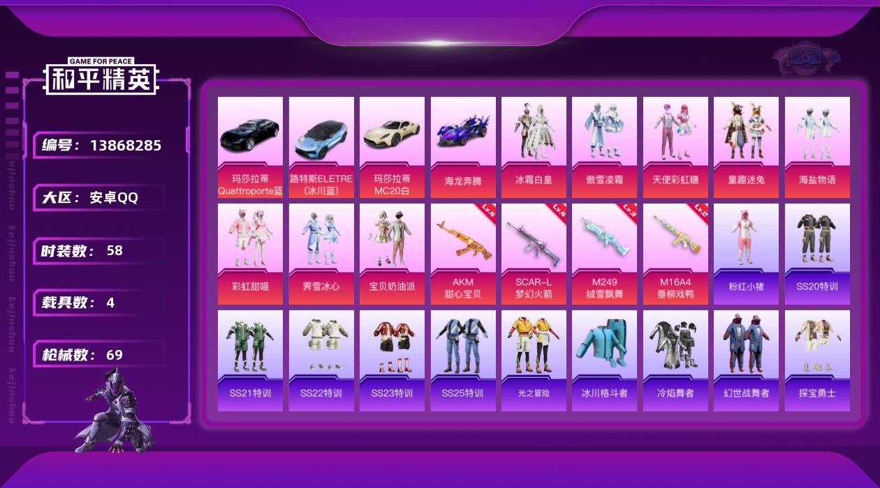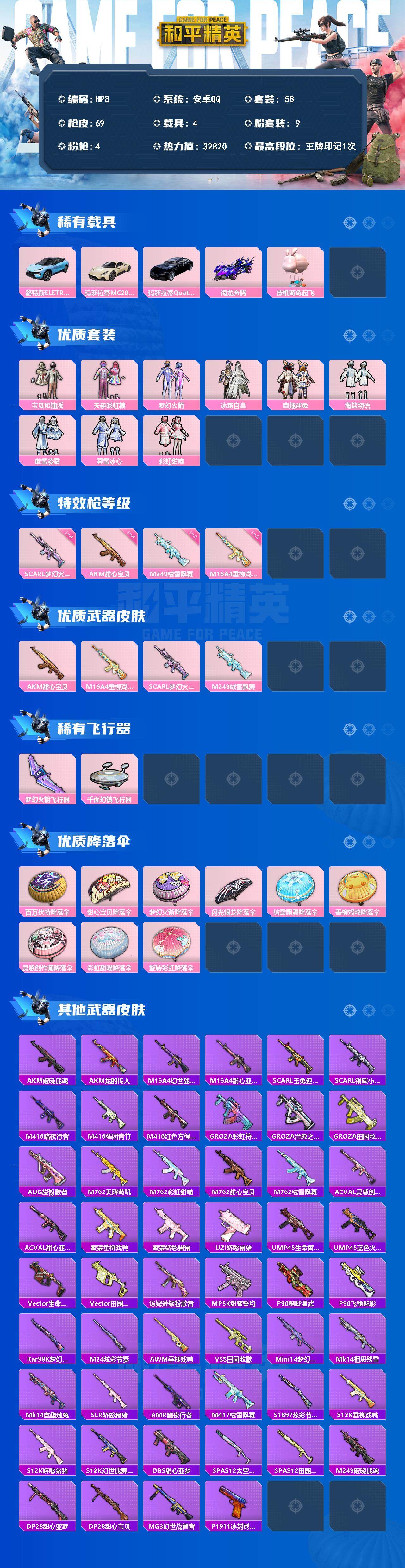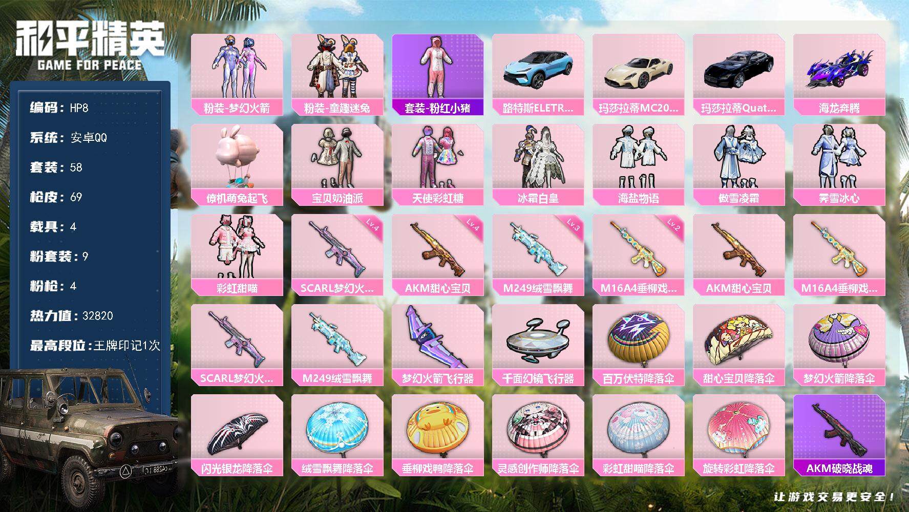 [13868285]安卓 手Q-9粉装-4特效枪-4载具-2粉色飞行器-32820热力值-1王牌印记-58套装-69枪皮 【热门品类】:粉装-梦幻火箭,粉装-童趣迷兔,套装-粉红小猪 【粉色载具】:路特斯ELETRE(冰川蓝),玛莎拉蒂MC20(星石白),玛莎拉蒂Quattroporte(夜幕蓝),海龙奔腾,僚机-萌兔起飞 【粉色套装】:粉装-宝贝奶油派,粉装-天使彩虹糖,粉装-梦幻火箭,粉装-冰霜白皇,粉装-童趣迷兔,粉装-海盐物语,粉装-傲雪凌霜,粉装-霁雪冰心,粉装-彩虹甜喵 【粉色枪皮等级】:AKM-甜心宝贝(四级),M16A4-垂柳戏鸭(二级),SCAR-L-梦幻火箭(四级),M249-绒雪飘舞(三级) 【粉色枪皮】:AKM-甜心宝贝,M16A4-垂柳戏鸭,SCAR-L-梦幻火箭,M249-绒雪飘舞 【粉色飞行器】:梦幻火箭飞行器,千面幻镜飞行器 【粉色降落伞】:百万伏特降落伞,甜心宝贝降落伞,梦幻火箭降落伞,闪光银龙降落伞,绒雪飘舞降落伞,垂柳戏鸭降落伞,灵感创作师降落伞,彩虹甜喵降落伞,旋转彩虹降落伞 【稀有枪皮】:AKM-破晓战魂,AKM-龙的传人,M16A4-幻世战舞者,M16A4-甜心亚梦,SCAR-L-玉兔迎春,SCAR-L-银碳小老虎,M416-暗夜行者,M416-糯团青竹,M416-红色方程式,GROZA-彩虹符号,GROZA-治愈之星,GROZA-田园牧歌,AUG-耀粉歌者,M762-天降萌叽,M762-彩虹甜喵,M762-甜心宝贝,M762-绒雪飘舞,AC-VAL-灵感创作师,AC-VAL-甜心亚梦,蜜獾-垂柳戏鸭,蜜獾-娇憨猪猪,UZI-娇憨猪猪,UMP45-生命誓言,UMP45-蓝色火焰,Vector-生命誓言,Vector-田园牧歌,汤姆逊-耀粉歌者,MP5K-甜蜜誓约,P90-翩跹演武,P90-飞驰魅影,Kar98K-梦幻火箭,M24-炫彩节奏,AWM-垂柳戏鸭,VSS-田园牧歌,Mini14-梦幻火箭,Mk14-相思残雪,Mk14-童趣迷兔,SLR-娇憨猪猪,AMR-暗夜行者,M417-绒雪飘舞,S1897-炫彩节奏,S12K-垂柳戏鸭,S12K-娇憨猪猪,S12K-幻世战舞者,DBS-甜心亚梦,SPAS-12-太空嘟嘟,SPAS-12-田园牧歌,M249-破晓战魂,DP-28-甜心亚梦,DP-28-甜心宝贝,MG3-幻世战舞者,P1911-冰