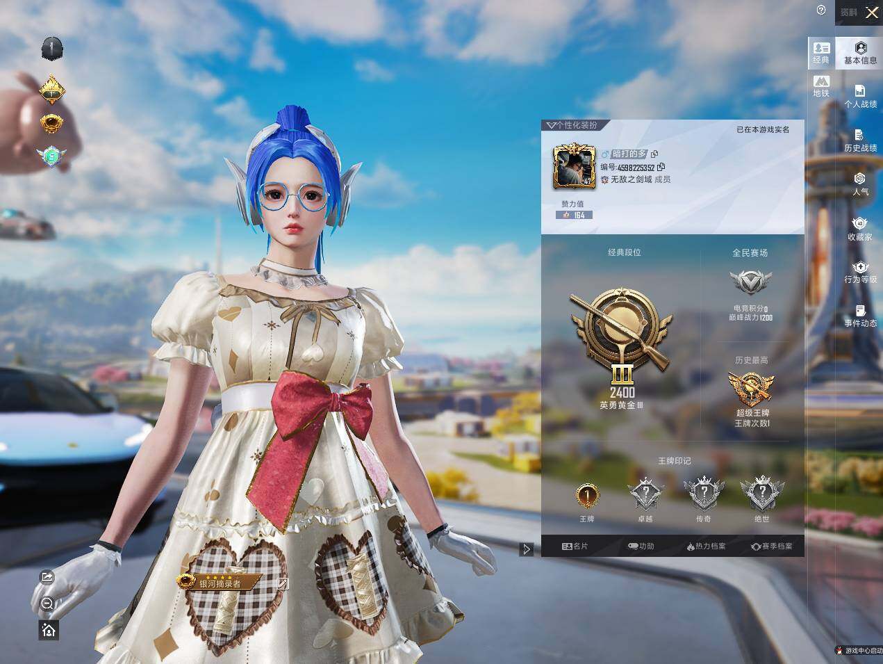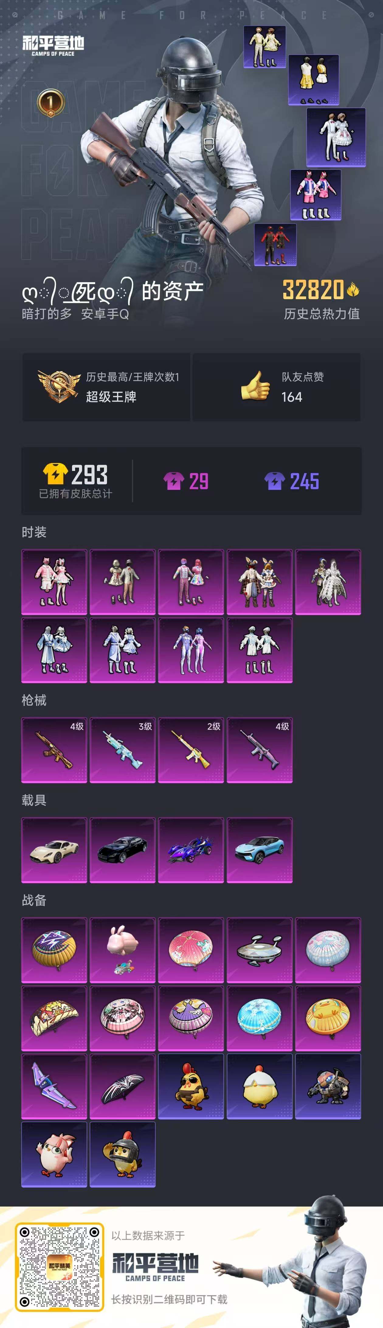 - PX_2078132- 苹果手Q-16王牌印记-4粉装-8特效枪-3载具-73574热力值-168套装-208枪皮-0卓越印记-0传奇印记 【4粉装】,繁龙极客,恐龙拽拽,碧影闪光,萨利娅 【8特效枪】AKM-梦之光华-7级 SCAR-L-锦绣绵绵-5级 M416-风花雪月-7级 GROZA-镜光银凌-5级 AUG-暖羊咩咩-5级 Kar98K-巳巳如意-5级 AMR-智耀战神-2级 P90-沙丘