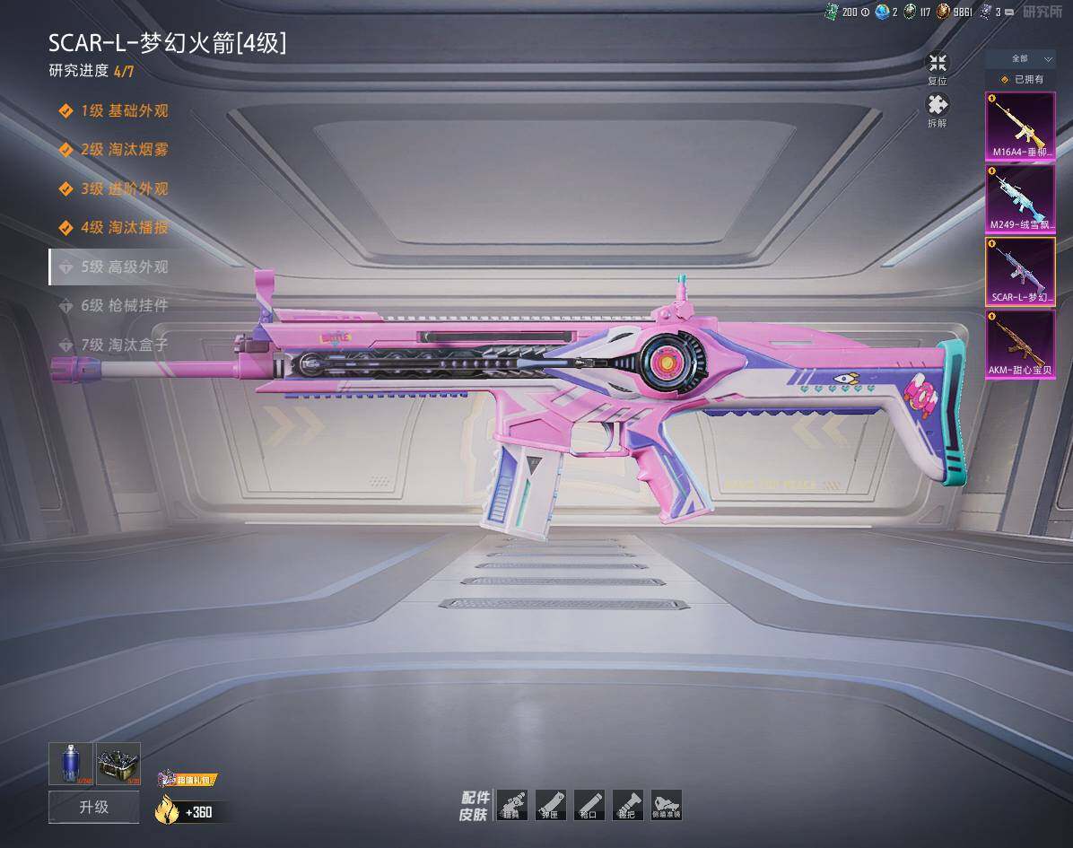 【粉色枪皮等级】:AKM-甜心宝贝(四级),M16A4-垂柳戏鸭(二级),SCAR-L-梦幻火箭(四级),M249-绒雪飘舞(三级)