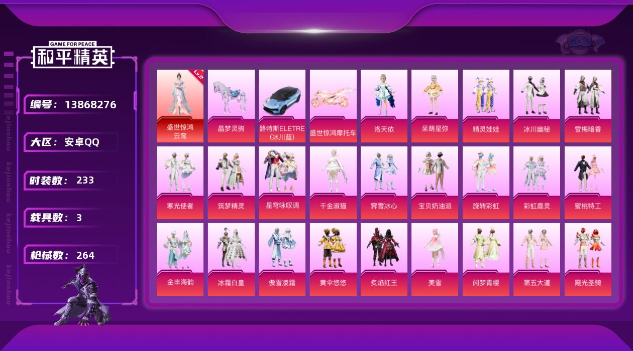 [13868276]安卓 手Q-1神装-33粉装-16特效枪-3载具-6粉色飞行器-101652热力值-15王牌印记-233套装-264枪皮 【红色神装等级】:盛世惊鸿-云鸾(二级) 【红色角色神装】:盛世惊鸿-云鸾 【热门品类】:粉装-梦幻火箭,粉装-童趣迷兔,粉装-缤纷油彩,套装-浪漫天命,套装-胖达圆圆,套装-龟仙人,套装-暗影哥特,套装-粉红小猪,套装-红红火火,套装-糯粉咩咩,套装-红熊茄茄 【粉色载具】:路特斯ELETRE(冰川蓝),盛世惊鸿摩托车,晶梦灵驹 【粉色套装】:粉装-宝贝奶油派,粉装-梦幻火箭,粉装-缤纷油彩,粉装-放客神游,粉装-新星烈龙,粉装-花间之火,粉装-冰霜白皇,粉装-童趣迷兔,粉装-炙焰红王,粉装-蜜桃特工,粉装-彩虹鹿灵,角色-洛天依,粉装-黄伞悠悠,粉装-黑伞漫漫,粉装-精灵娃娃,粉装-筑梦精灵,粉装-傲雪凌霜,粉装-霁雪冰心,粉装-旋转彩虹,粉装-冰川幽秘,粉装-冰川红玫,粉装-霞光圣骑,粉装-寒光使者,粉装-第五大道,粉装-雪梅暗香,超级赛亚人-孙悟空,角色-呆萌星弥,粉装-闲梦青缨,角色-美雪,角色-鸢尾晶梦,粉装-金丰海韵,角色-千金淑猫,粉装-星穹咏叹调 【粉色枪皮等级】:AKM-甜心宝贝(七级),AKM-星际浪客(一级),SCAR-L-甜梦小狐(六级),M416-至情至圣(六级),GROZA-旋转彩虹(四级),UZI-畅跳缤纷(四级),UMP45-相思残雪(五级),Vector-灵感创作师(四级),汤姆逊-冰川粉黛(四级),Kar98K-巳巳如意(五级),Mk14-盛世惊鸿(二级),AMR-智耀战神(一级),M417-第五大道(一级),MG3-洛神天依(五级),爆炸猎弓-雪梅暗香(三级),破片手榴弹-瓶中星球(六级) 【粉色枪皮】:AKM-甜心宝贝,AKM-星际浪客,SCAR-L-甜梦小狐,M416-至情至圣,GROZA-旋转彩虹,UZI-畅跳缤纷,UMP45-相思残雪,Vector-灵感创作师,汤姆逊-冰川粉黛,Kar98K-巳巳如意,Mk14-盛世惊鸿,AMR-智耀战神,M417-第五大道,MG3-洛神天依,爆炸猎弓-雪梅暗香,破片手榴弹-瓶中星球 【粉色飞行器】:酣梦熊熊飞行器,梦幻火箭飞行器,天之羽翼飞行器,璀璨巨星飞行器,凤舞九天飞行器,圣域金龙飞行器 【粉色降落伞】:春暖花开降落伞,梦幻火箭降落伞,童趣迷兔降落伞,林间仙