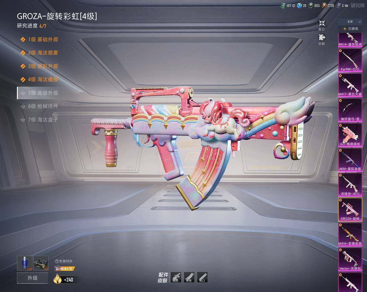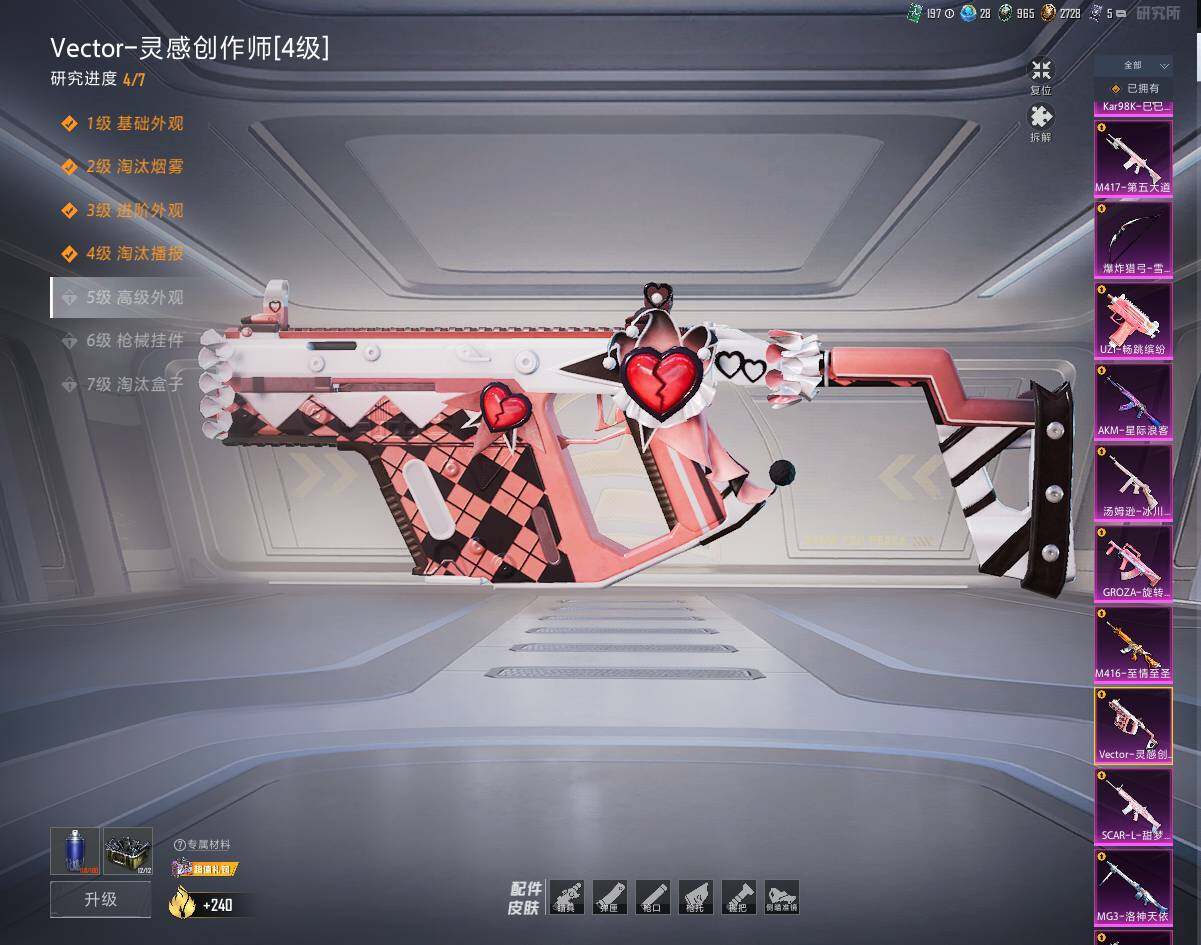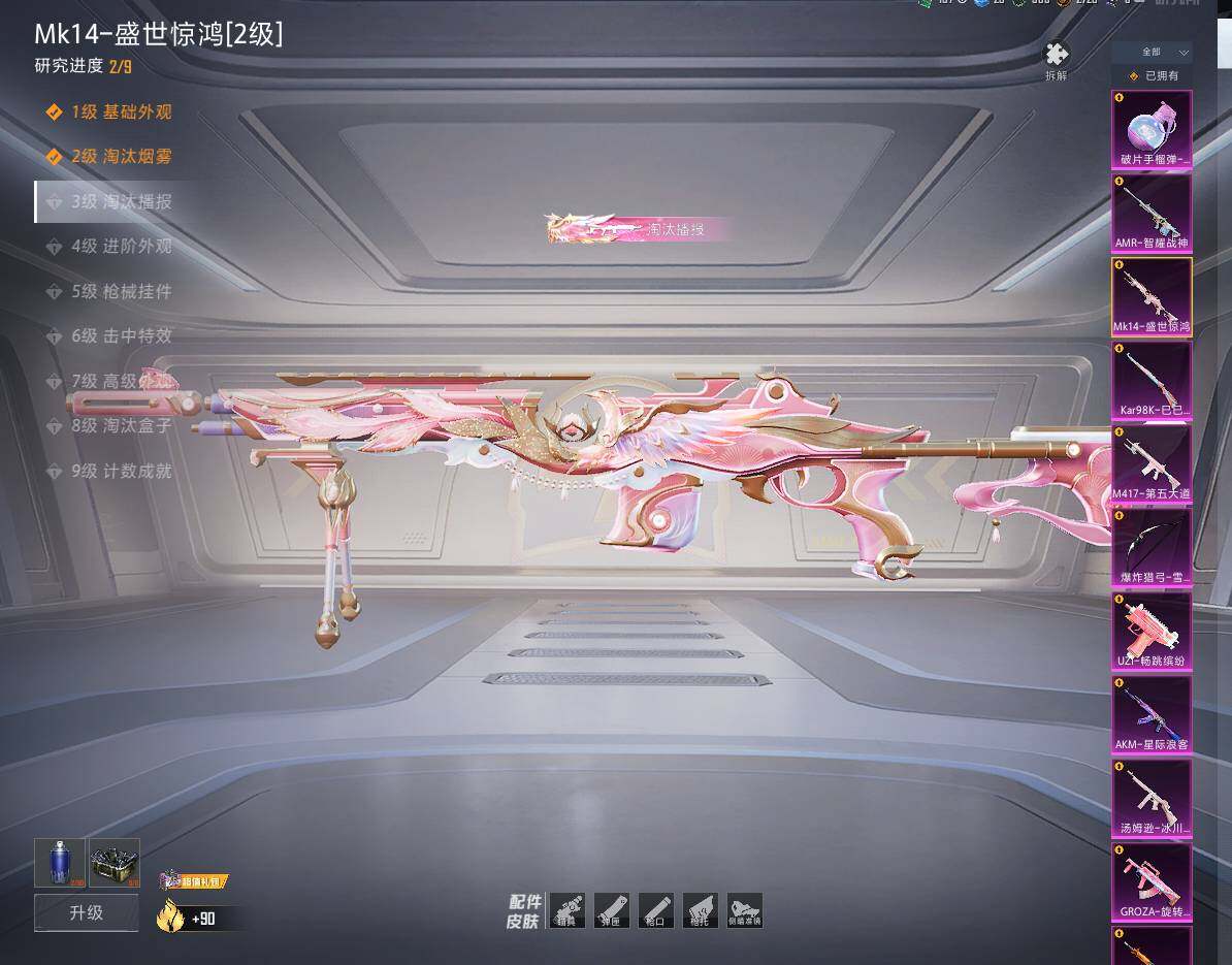 【粉色枪皮等级】:AKM-甜心宝贝(七级),AKM-星际浪客(一级),SCAR-L-甜梦小狐(六级),M416-至情至圣(六级),GROZA-旋转彩虹(四级),UZI-畅跳缤纷(四级),UMP45-相思残雪(五级),Vector-灵感创作师(四级),汤姆逊-冰川粉黛(四级),Kar98K-巳巳如意(五级),Mk14-盛世惊鸿(二级),AMR-智耀战神(一级),M417-第五大道(一级),MG3-洛神天依(五级),爆炸猎弓-雪梅暗香(三级),破片手榴弹-瓶中星球(六级)