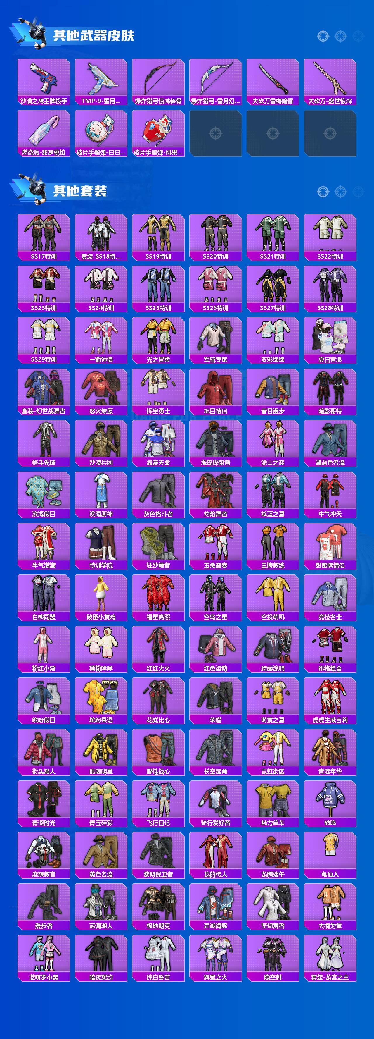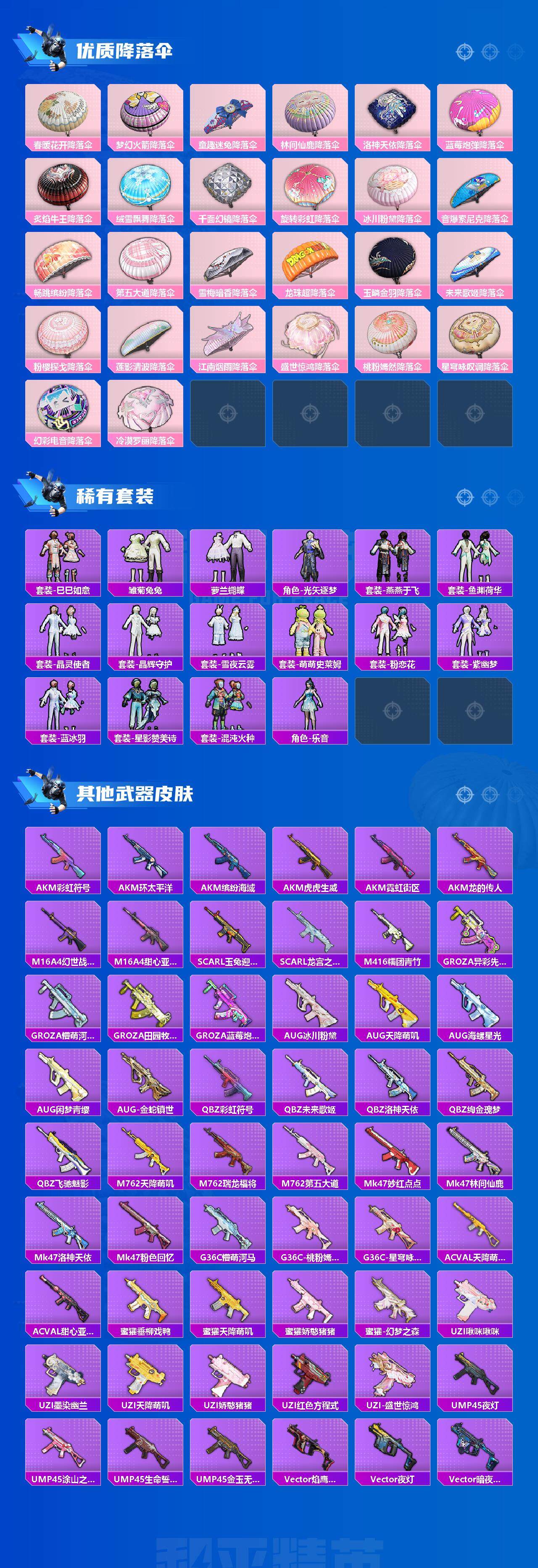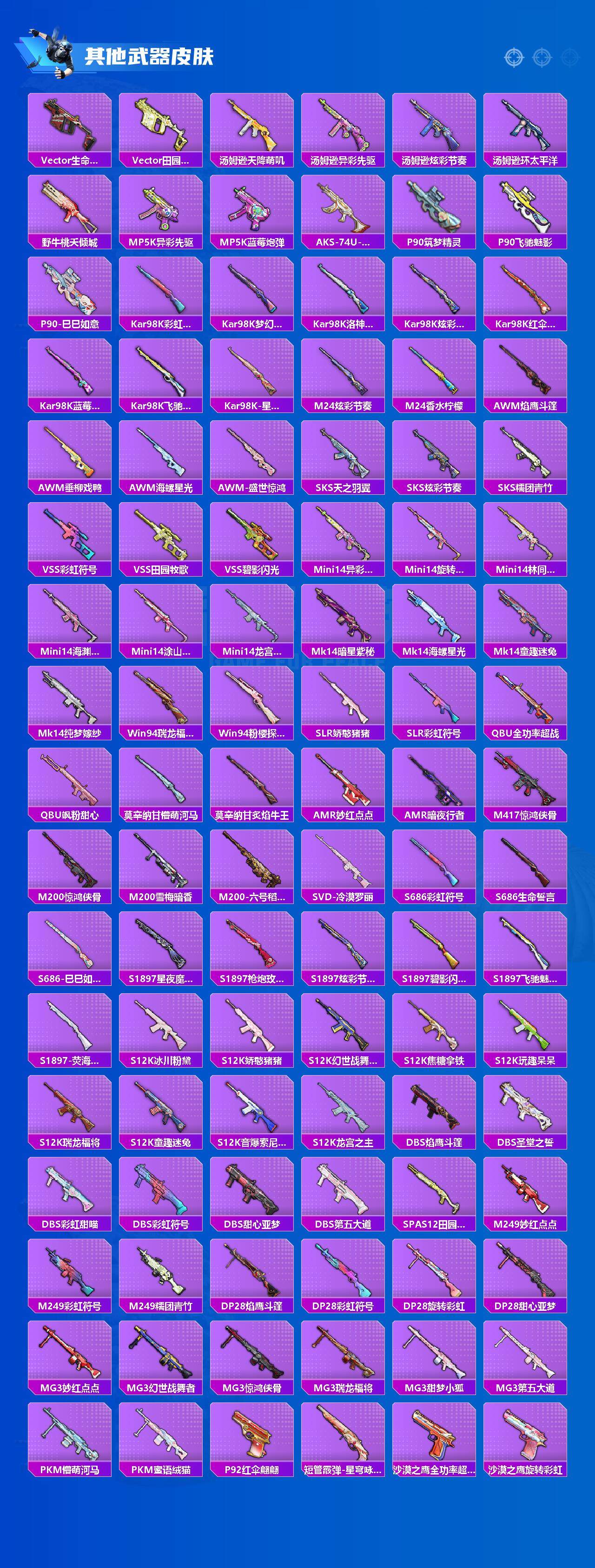 AKM-甜心宝贝,AKM-星际浪客,SCAR-L-甜梦小狐,M416-至情至圣,GROZA-旋转彩虹,UZI-畅跳缤纷,UMP45-相思残雪,Vector-灵感创作师,汤姆逊-冰川粉黛,Kar98K-巳巳如意,Mk14-盛世惊鸿,M417-第五大道,MG3-洛神天依,爆炸猎弓-雪梅暗香