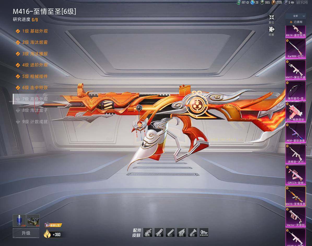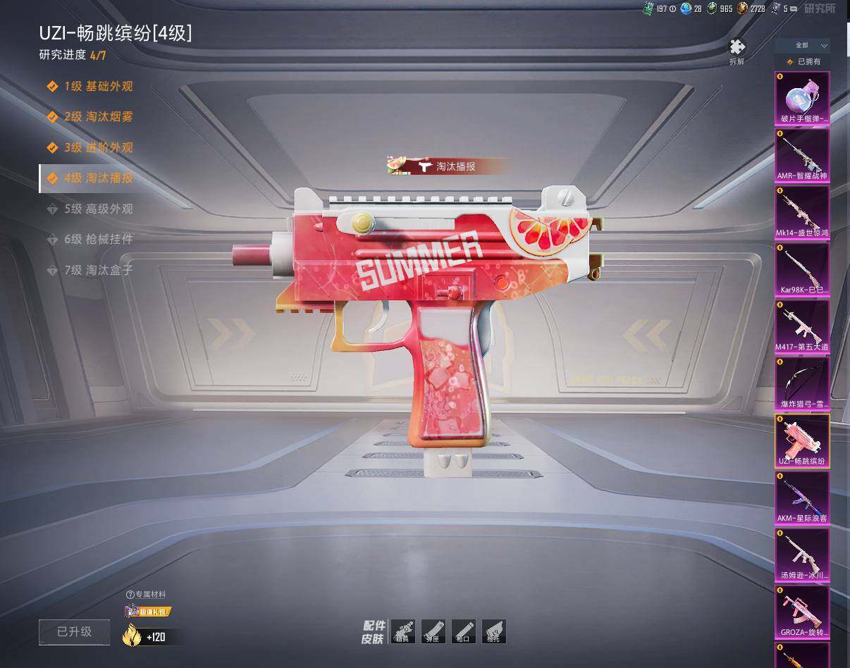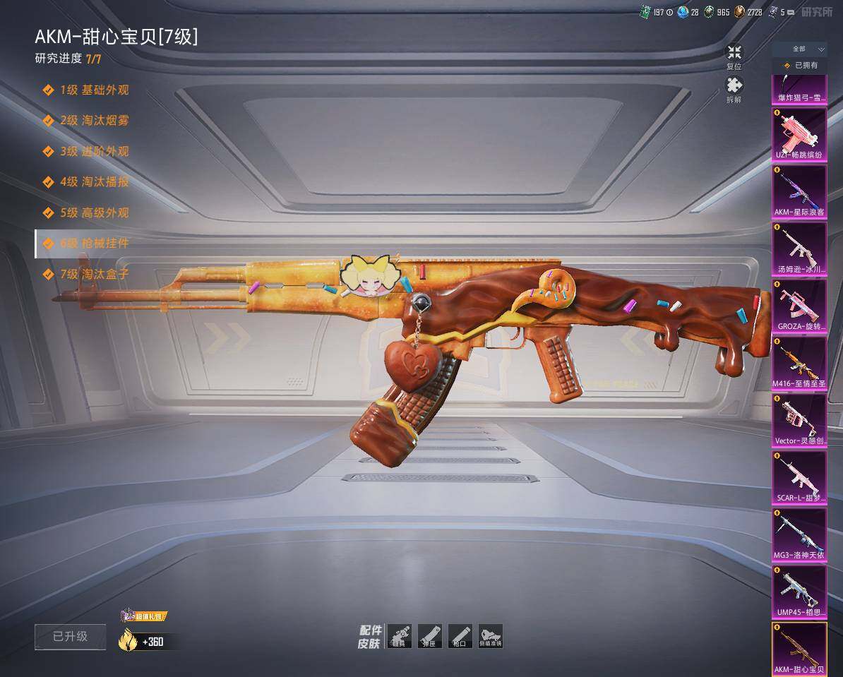 AKM-甜心宝贝,AKM-星际浪客,SCAR-L-甜梦小狐,M416-至情至圣,GROZA-旋转彩虹,UZI-畅跳缤纷,UMP45-相思残雪,Vector-灵感创作师,汤姆逊-冰川粉黛,Kar98K-巳巳如意,Mk14-盛世惊鸿,M417-第五大道,MG3-洛神天依,爆炸猎弓-雪梅暗香