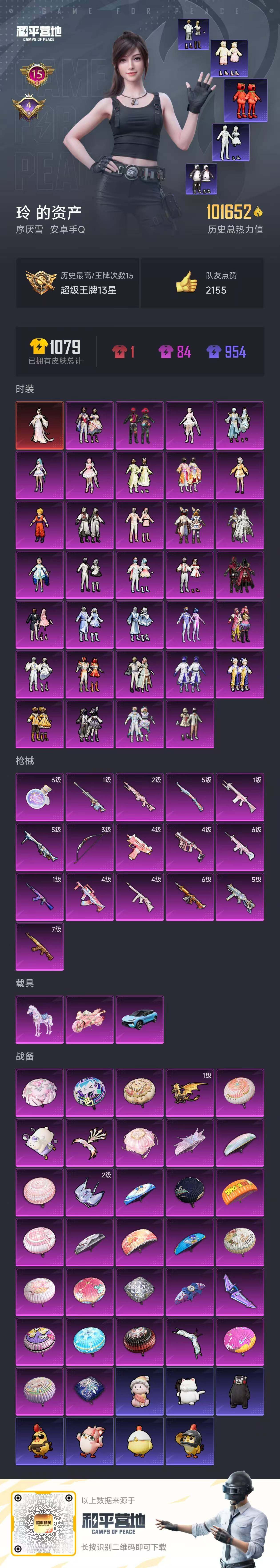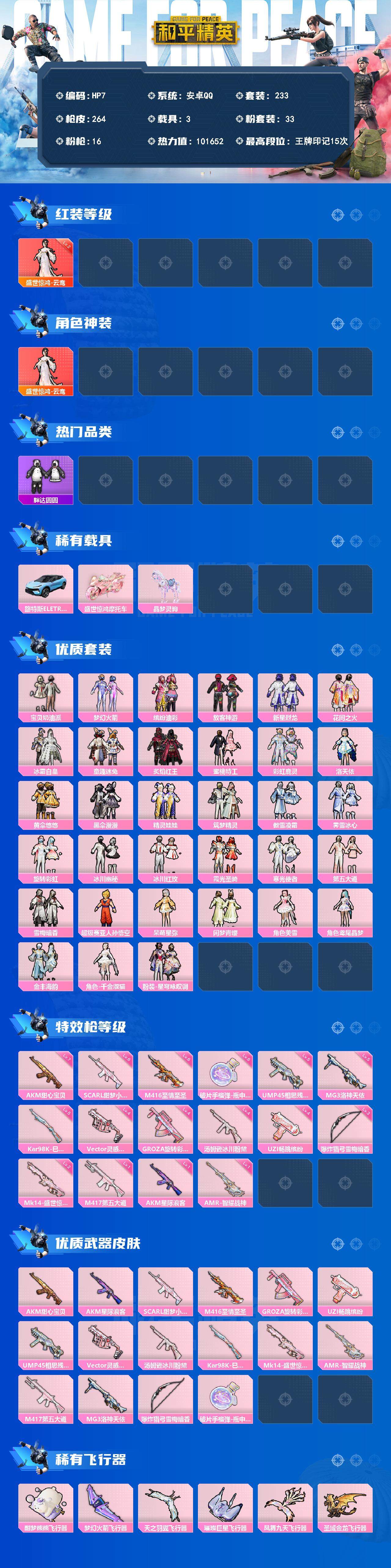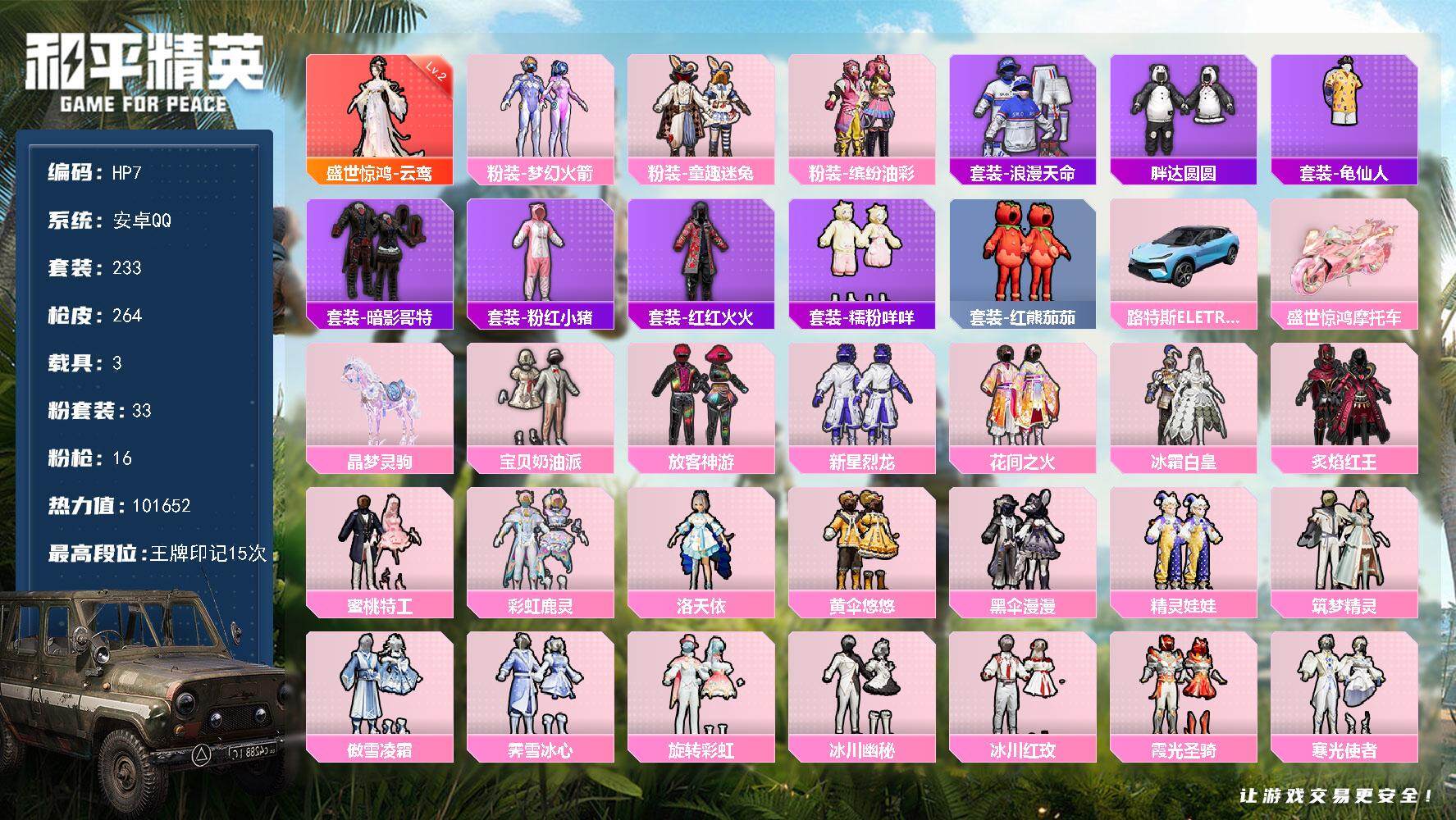 [13868276]安卓 手Q-1神装-33粉装-16特效枪-3载具-6粉色飞行器-101652热力值-15王牌印记-233套装-264枪皮