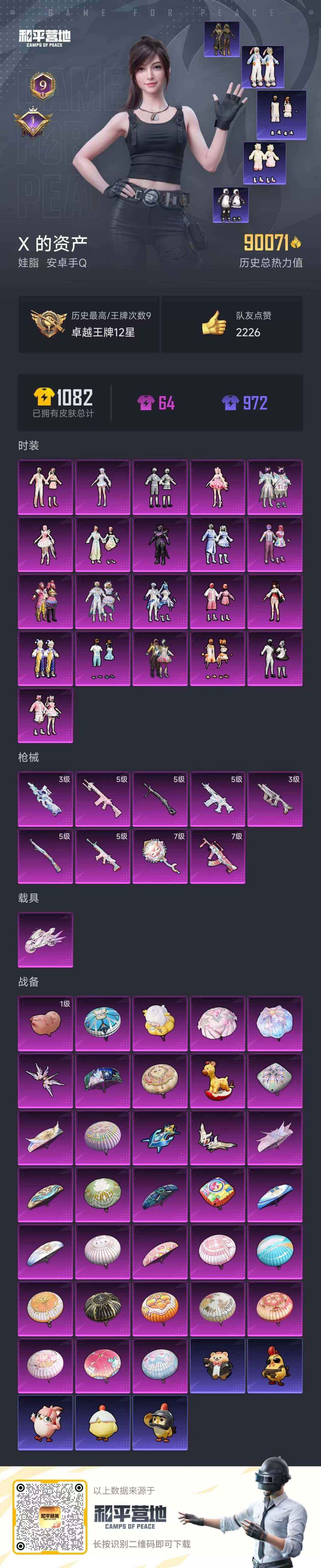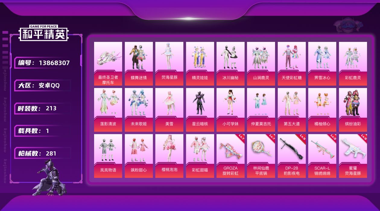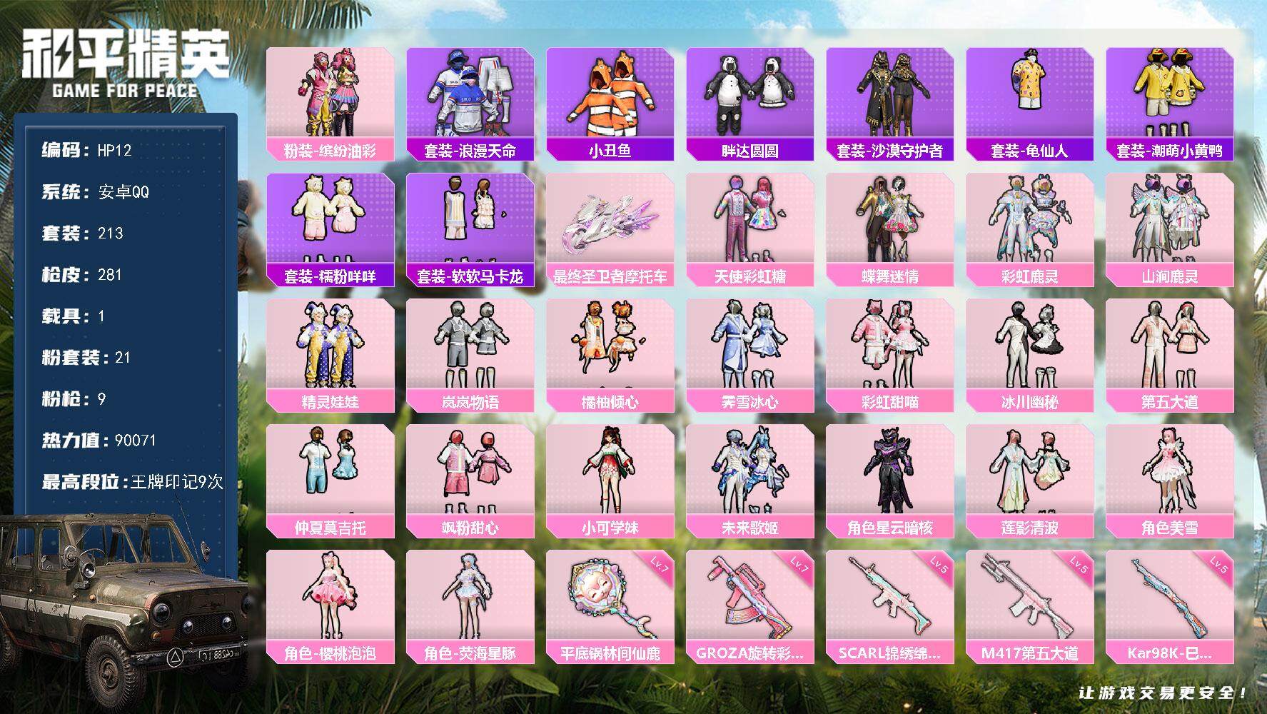 [13868307]安卓 手Q-21粉装-9特效枪-1载具-5粉色飞行器-90071热力值-9王牌印记-213套装-281枪皮
