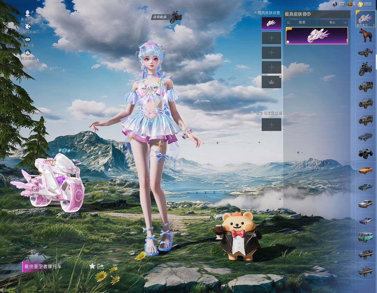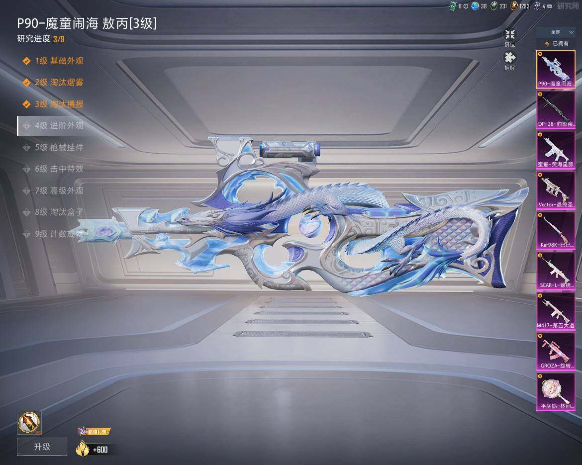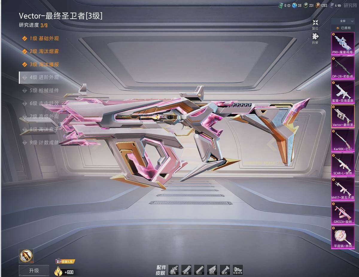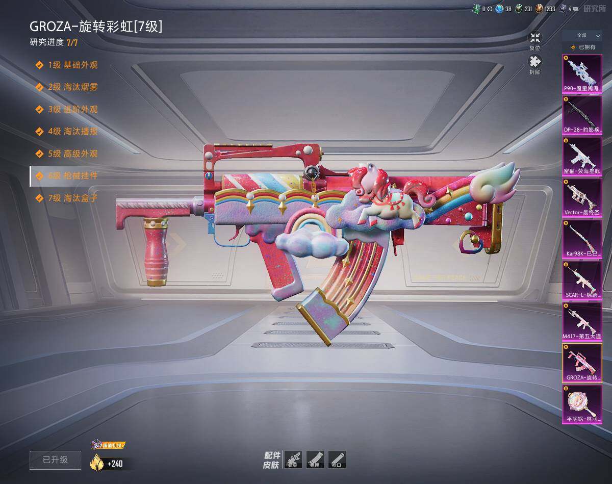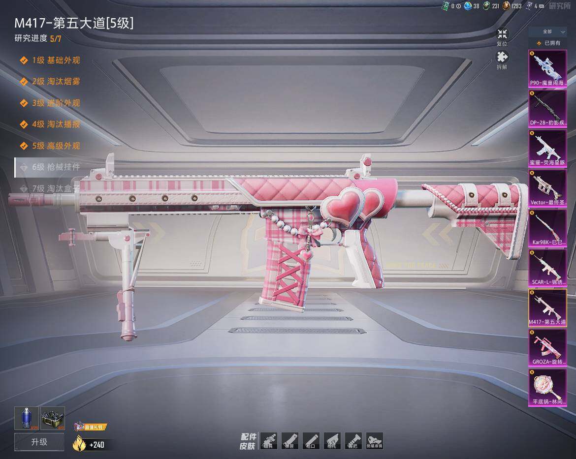 【粉色枪皮等级】:SCAR-L-锦绣绵绵(五级),GROZA-旋转彩虹(七级),蜜獾-荧海星豚(五级),Vector-最终圣卫者(三级),P90-魔童闹海 敖丙(三级),Kar98K-巳巳如意(五级),M417-第五大道(五级),DP-28-豹影疾电(五级),平底锅-林间仙鹿(七级)