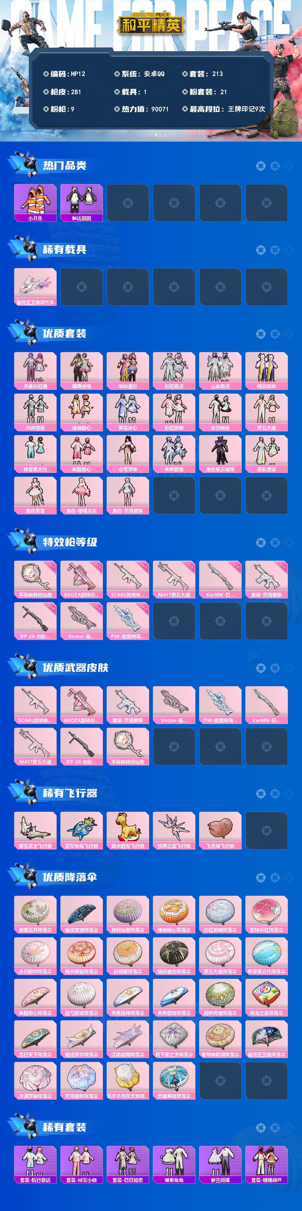 [13868307]安卓 手Q-21粉装-9特效枪-1载具-5粉色飞行器-90071热力值-9王牌印记-213套装-281枪皮 【热门品类】:粉装-缤纷油彩,套装-浪漫天命,套装-小丑鱼,套装-胖达圆圆,套装-沙漠守护者,套装-龟仙人,套装-潮萌小黄鸭,套装-糯粉咩咩,套装-软软马卡龙 【粉色载具】:最终圣卫者摩托车 【粉色套装】:粉装-天使彩虹糖,粉装-蝶舞迷情,粉装-缤纷油彩,粉装-彩虹鹿灵,粉装-山涧鹿灵,粉装-精灵娃娃,粉装-岚岚物语,粉装-橘柚倾心,粉装-霁雪冰心,粉装-彩虹甜喵,粉装-冰川幽秘,粉装-第五大道,粉装-仲夏莫吉托,粉装-飒粉甜心,角色-小可学妹,粉装-未来歌姬,角色-星云暗核,粉装-莲影清波,角色-美雪,角色-樱桃泡泡,角色-荧海星豚 【粉色枪皮等级】:SCAR-L-锦绣绵绵(五级),GROZA-旋转彩虹(七级),蜜獾-荧海星豚(五级),Vector-最终圣卫者(三级),P90-魔童闹海 敖丙(三级),Kar98K-巳巳如意(五级),M417-第五大道(五级),DP-28-豹影疾电(五级),平底锅-林间仙鹿(七级) 【粉色枪皮】:SCAR-L-锦绣绵绵,GROZA-旋转彩虹,蜜獾-荧海星豚,Vector-最终圣卫者,P90-魔童闹海 敖丙,Kar98K-巳巳如意,M417-第五大道,DP-28-豹影疾电,平底锅-林间仙鹿 【粉色飞行器】:星空武士飞行器,冠军兔兔飞行器,戏水时光飞行器,终晖之翼飞行器,飞天猪飞行器 【粉色降落伞】:春暖花开降落伞,暗夜玫瑰降落伞,林间仙鹿降落伞,橘柚倾心降落伞,彩虹甜喵降落伞,旋转彩虹降落伞,冰川粉黛降落伞,桃夭倾城降落伞,启明星降落伞,暗夜鎏金降落伞,第五大道降落伞,仲夏莫吉托降落伞,飒粉甜心降落伞,白勺歌姬降落伞,天星战神降落伞,未来歌姬降落伞,闲梦青缨降落伞,炫光之旅降落伞,龙行天下降落伞,镜域双华降落伞,江南烟雨降落伞,月下星之子降落伞,星穹咏叹调降落伞,最终圣卫者降落伞,冷漠罗丽降落伞,荧海星豚降落伞,喜羊羊与灰太狼降落伞,异瞳寒姬降落伞 【稀有套装】:套装-龟仙人,套装-航行童话,套装-绒宝小鹅,套装-巳巳如意,套装-雏菊兔兔,套装-萝兰蝴蝶,套装-糖糖葫芦,套装-青团波波,套装-棉花软糖,角色-都市丽猫,套装-燕燕于飞,套装-鱼渊荷华,套装-雪夜云雾,套装-晨曦轻云,套装-粉恋花,套装-紫幽梦,套装-蓝冰羽,角色