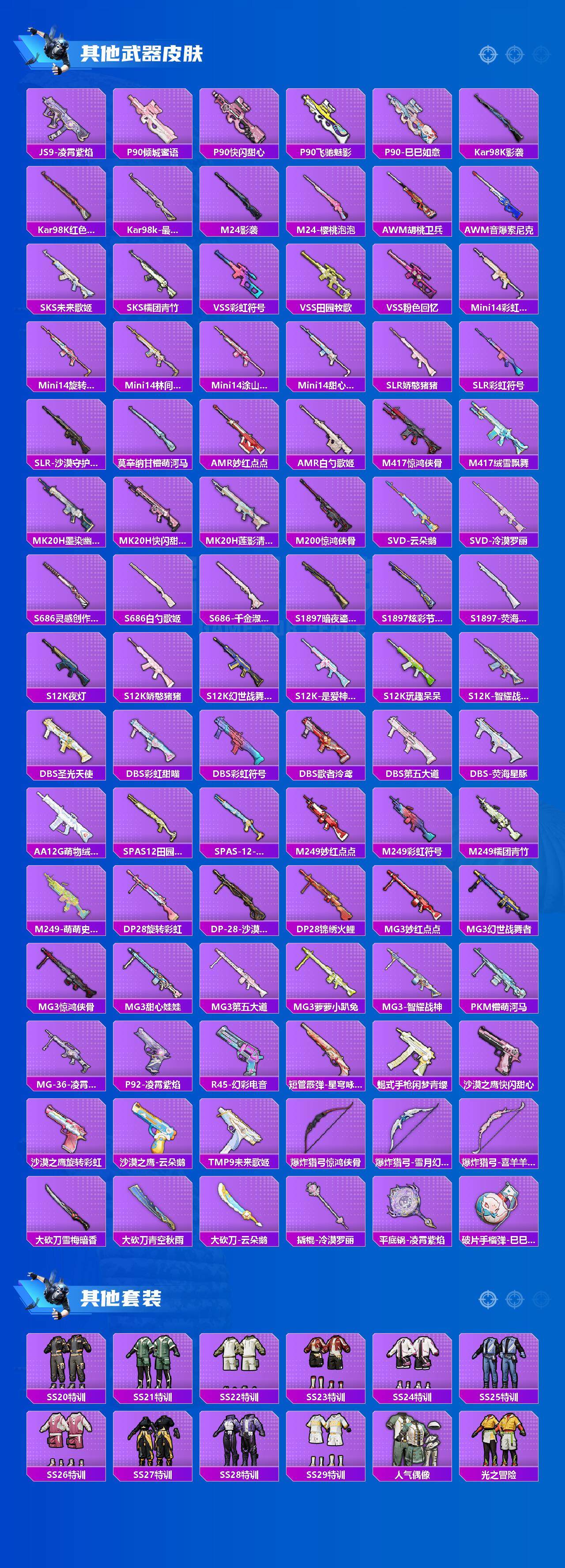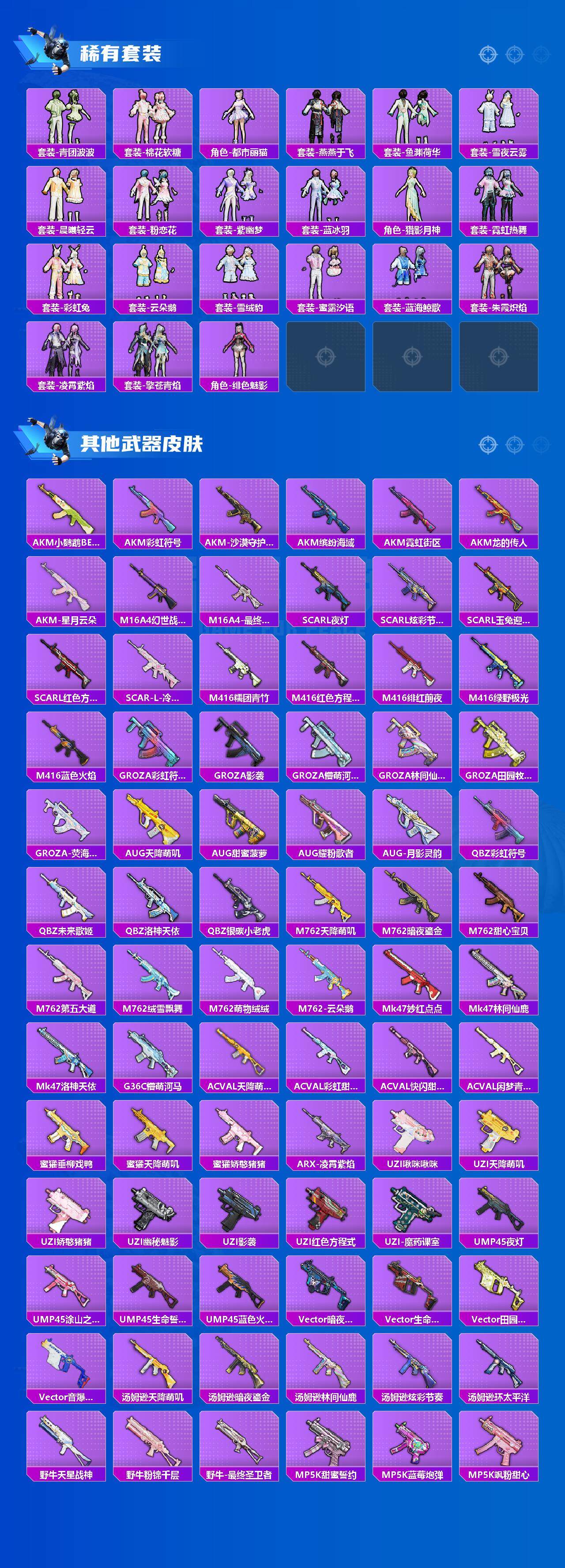 - [11407980]【商品标题】:安卓 手Q-3粉装-6特效枪-0载具-50922热力值-5印记-126套装-161枪皮 【特效枪等级】:AKM-绿萝繁花(五级),SCAR-L-锦绣绵绵(五级),M762-青锋波束(五级),Kar98K-巳巳如意(五级),SPAS-12-蜜语绒猫(七级),PKM-守护天翼(七级) 【优质套装】:角色-复仇流浪者,玩偶服-猪猪侠,粉装-英伦信使 【稀有套装】:套装-龟仙人,套装-巳巳如意,套装-雏菊兔兔,套装-萝兰蝴蝶,套装-小熊娃娃,角色-达芬奇,套装-先驱飞行员,套装-糖糖葫芦,套装-青团波波,套装-霓虹热舞 【优质武器皮肤】:AKM-绿萝繁花,SCAR-L-锦绣绵绵,M762-青锋波束,Kar98K-巳巳如意,SPAS-12-蜜语绒猫,PKM-守护天翼 【稀有武器皮肤】:AKM-彩虹符号,AKM-环太平洋,AKM-破晓战魂,AKM-胡桃卫兵,AKM-萌趣颜团子,AKM-虎虎生威,AKM-龙的传人,M16A4-幻世战舞者,M16A4-甜心亚梦,SCAR-L-炫彩节奏,SCAR-L-玉兔迎春,SCAR-L-红色方程式,SCAR-L-青丘仙客,M416-糯团青竹,M416-红色方程式,M416-蓝色火焰,GROZA-彩虹符号,AUG-天降萌叽,AUG-怪笑疯兔,AUG-耀粉歌者,AUG-闲梦青缨,QBZ-洛神天依,QBZ-飞驰魅影,M762-天降萌叽,Mk47-妙红点点,AC-VAL-天降萌叽,AC-VAL-快闪甜心,AC-VAL-甜心亚梦,蜜獾-天降萌叽,蜜獾-娇憨猪猪,UZI-啾咪啾咪,UZI-天降萌叽,UZI-娇憨猪猪,UMP45-夜灯,UMP45-涂山之恋,UMP45-生命誓言,UMP45-蓝色火焰,Vector-焰鹰斗篷,Vector-生命誓言,Vector-创世·救赎,汤姆逊-环太平洋,汤姆逊-耀粉歌者,MP5K-怪笑疯兔,P90-快闪甜心,P90-飞驰魅影,P90-巳巳如意,Kar98K-六号树人,Kar98K-彩虹符号,Kar98K-炫彩节奏,Kar98K-红色方程式,Kar98K-飞驰魅影,AWM-焰鹰斗篷,SKS-糯团青竹,Mini14-耀粉歌者,Mk14-是爱神辣,SLR-娇憨猪猪,SLR-彩虹符号,AMR-妙红点点,M417-惊鸿侠骨,MK20-H-快闪甜心,MK20-H-莲影清波,M200-惊鸿侠骨,S686-彩虹符号,S68