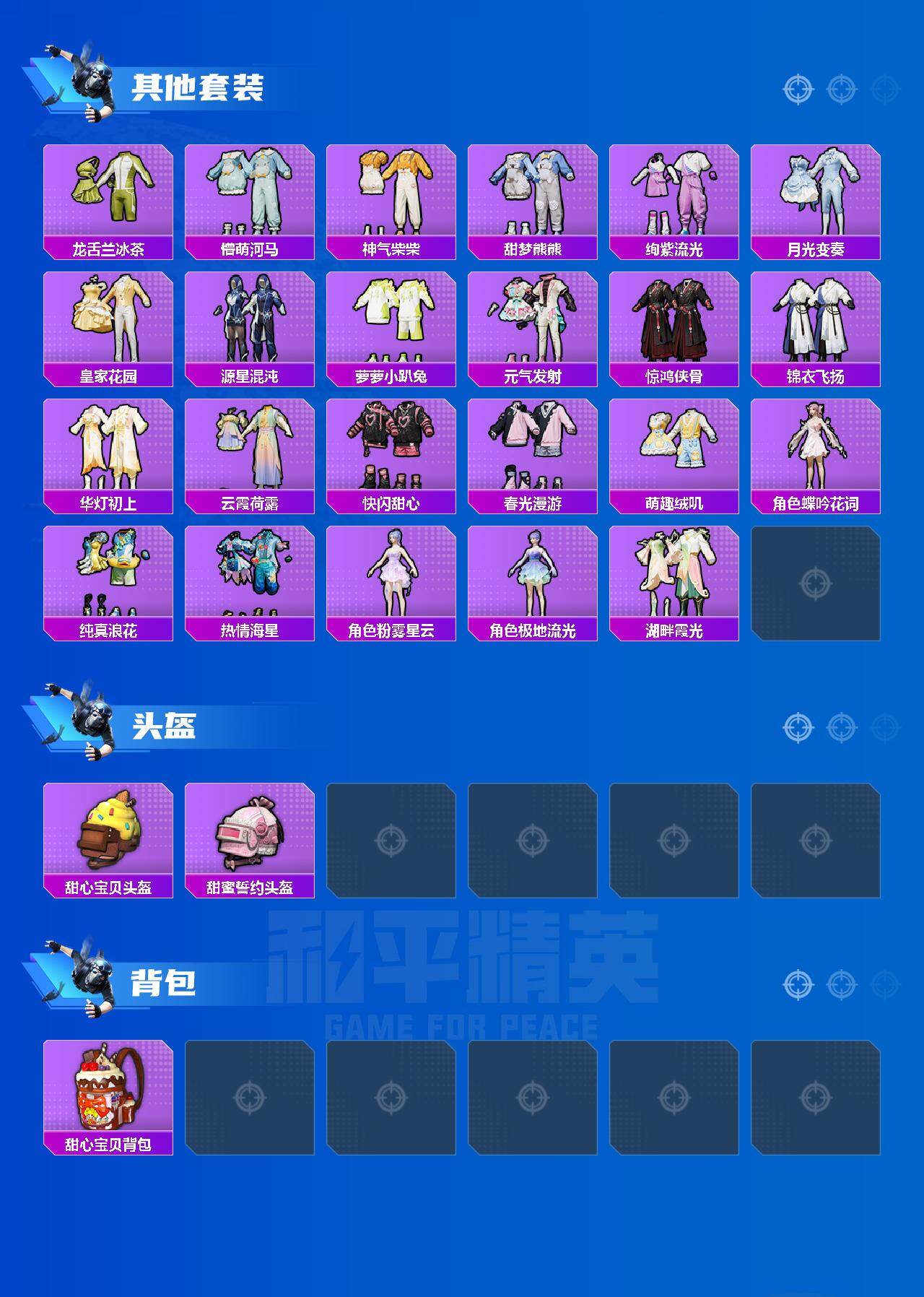 套装-蝶舞迷情,套装-精灵娃娃,套装-冰川幽秘,套装-山涧鹿灵,套装-天使彩虹糖,套装-霁雪冰心,套装-彩虹鹿灵,套装-莲影清波,套装-未来歌姬,角色-美雪,角色-星云暗核,角色-小可学妹,套装-仲夏莫吉托,套装-第五大道,套装-橘柚倾心,套装-缤纷油彩,岚岚物语套装,套装-飒粉甜心,角色-樱桃泡泡,套装-彩虹甜喵