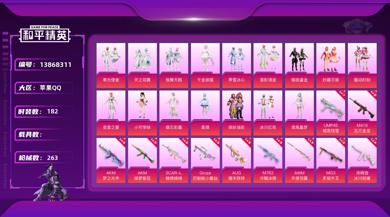 [13868311]苹果 手Q-16粉装-15特效枪-0载具-2粉色飞行器-90094热力值-14王牌印记-182套装-263枪皮 【热门品类】:粉装-缤纷油彩,套装-浪漫天命,套装-奇异狩猎者,套装-龟仙人,套装-暗影哥特,套装-粉红小猪 【粉色套装】:粉装-独舞天鹅,粉装-缤纷油彩,粉装-馨动时刻,粉装-天之羽翼,粉装-妙趣可丽,粉装-霁雪冰心,粉装-冰川红玫,粉装-寒光使者,粉装-暗夜鎏金,角色-小可学妹,粉装-莲影清波,角色-圣堂之誓,角色-烟云彩露,角色-美琪,角色-鸢尾晶梦,角色-千金淑猫 【粉色枪皮等级】:AKM-梦之光华(五级),AKM-绿萝繁花(五级),SCAR-L-锦绣绵绵(五级),M416-五爪金龙(六级),GROZA-巴啦啦小魔仙(五级),AUG-暖羊咩咩(五级),M762-冷魅冰骑(五级),UMP45-相思残雪(七级),汤姆逊-冰川粉黛(四级),Kar98K-巳巳如意(四级),M24-莲影清波(四级),AWM-天使羽翼(五级),DP-28-千金淑猫(四级),DP-28-豹影疾电(三级),MG3-炙焰牛王(五级) 【粉色枪皮】:AKM-梦之光华,AKM-绿萝繁花,SCAR-L-锦绣绵绵,M416-五爪金龙,GROZA-巴啦啦小魔仙,AUG-暖羊咩咩,M762-冷魅冰骑,UMP45-相思残雪,汤姆逊-冰川粉黛,Kar98K-巳巳如意,M24-莲影清波,AWM-天使羽翼,DP-28-千金淑猫,DP-28-豹影疾电,MG3-炙焰牛王 【粉色飞行器】:相思残雪飞行器,镜域双华-灵镜之阶 【粉色降落伞】:天之羽翼降落伞,碧影闪光降落伞,筑梦精灵降落伞,炙焰牛王降落伞,垂柳戏鸭降落伞,彩虹甜喵降落伞,旋转彩虹降落伞,白勺歌姬降落伞,莲影清波降落伞,镜光幻境降落伞,圣堂之誓降落伞,花傲天降落伞,蜜语绒猫降落伞,镜域双华降落伞,江南烟雨降落伞,巴啦啦小魔仙降落伞,精灵梦叶罗丽降落伞,金丰海韵降落伞,千金淑猫降落伞 【稀有套装】:套装-龟仙人,套装-巳巳如意,套装-雏菊兔兔,套装-萝兰蝴蝶,套装-小熊娃娃,套装-糖糖葫芦,套装-青团波波,套装-棉花软糖,角色-都市丽猫,角色-摩登魅猫,套装-燕燕于飞,套装-鱼渊荷华,角色-风玲,套装-朱霞炽焰,套装-凌霄紫焰,玩偶服-喜羊羊 【稀有枪皮】:AKM-夜灯,AKM-奇异狩猎者,AKM-彩虹符号,AKM-江南烟雨,AKM-灼热熔岩,A