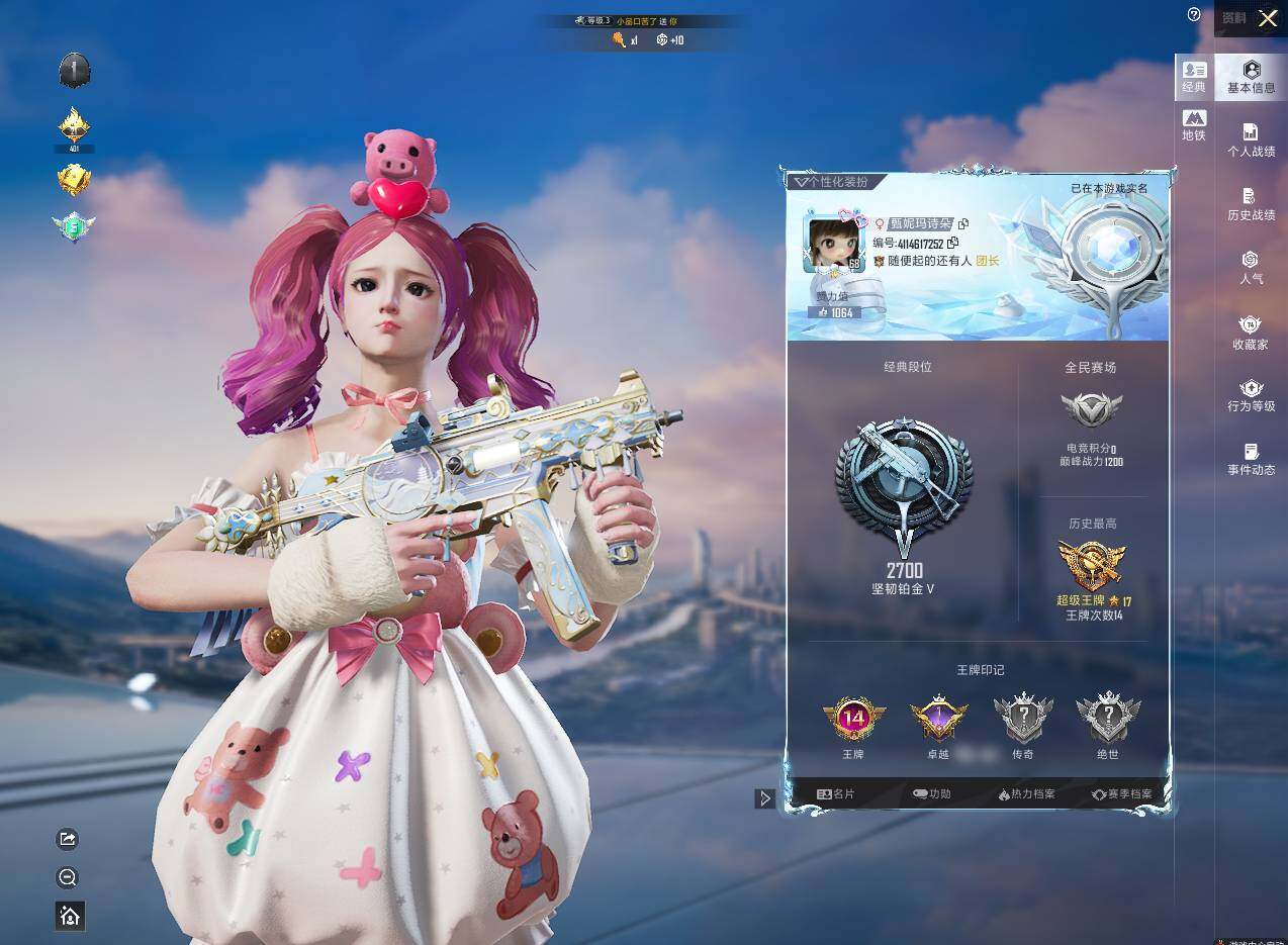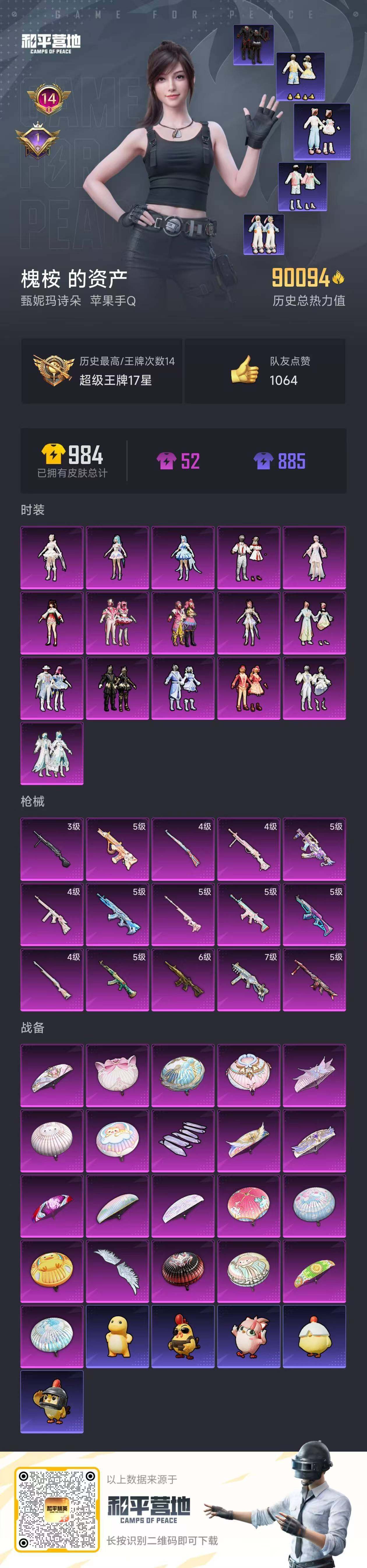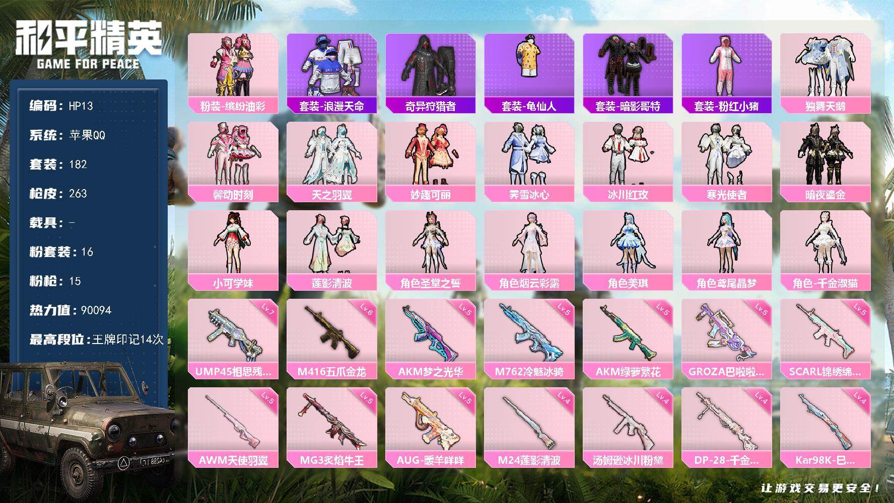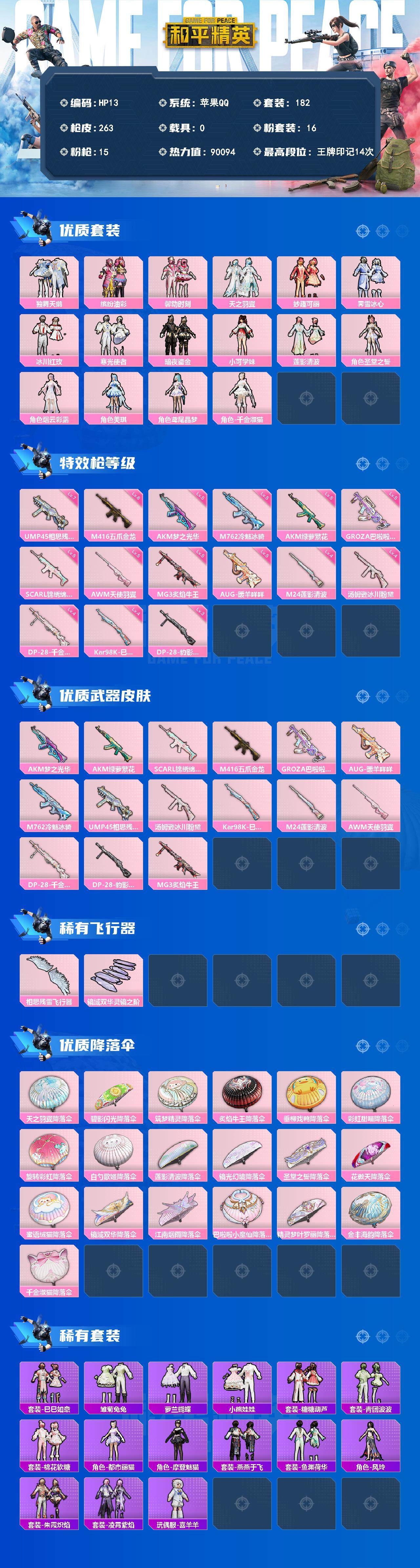 [13868311]苹果 手Q-16粉装-15特效枪-0载具-2粉色飞行器-90094热力值-14王牌印记-182套装-263枪皮