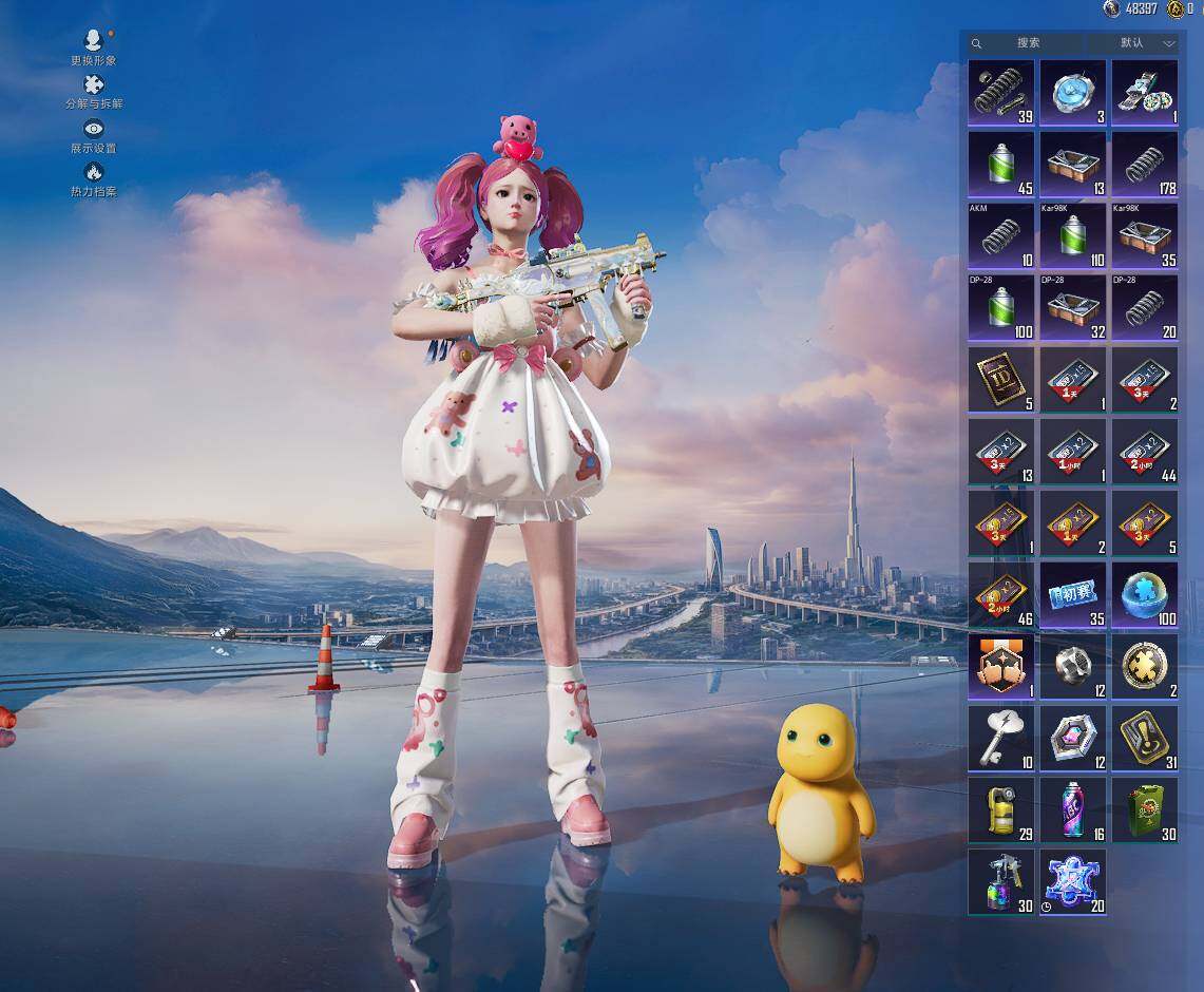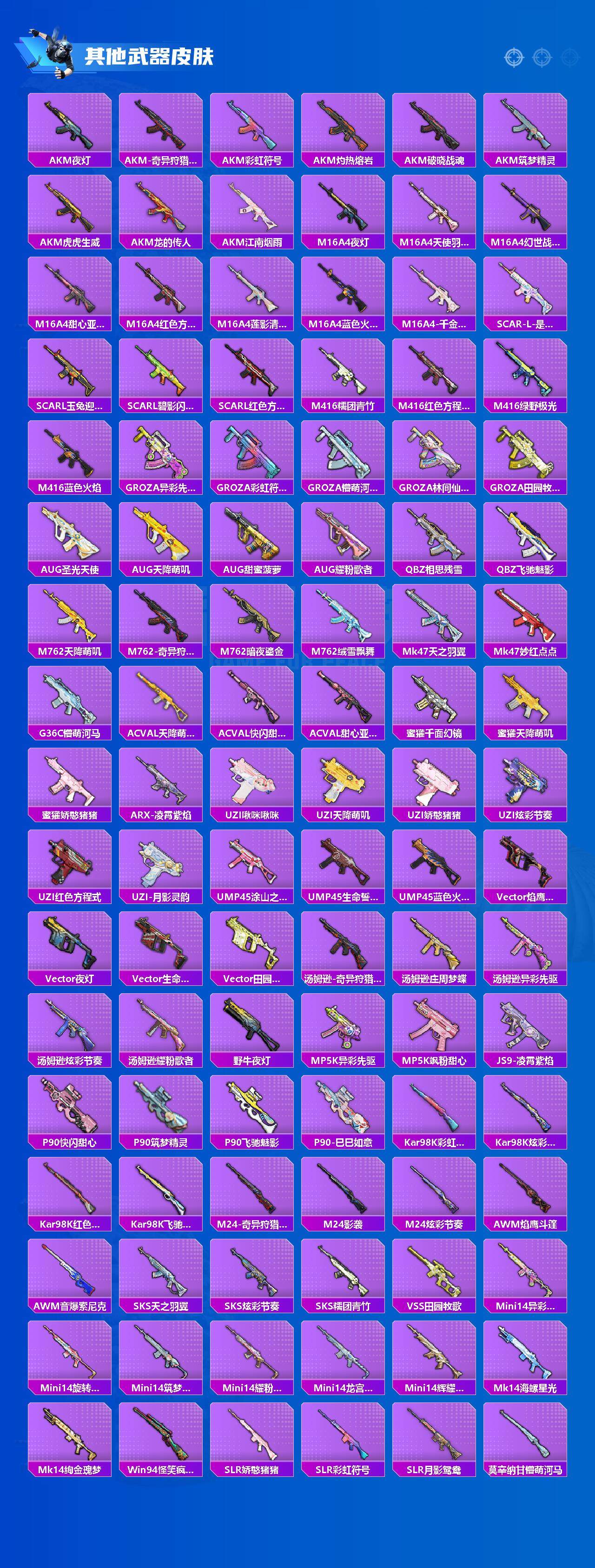 【粉色枪皮】:AKM-梦之光华,AKM-绿萝繁花,SCAR-L-锦绣绵绵,M416-五爪金龙,GROZA-巴啦啦小魔仙,AUG-暖羊咩咩,M762-冷魅冰骑,UMP45-相思残雪,汤姆逊-冰川粉黛,Kar98K-巳巳如意,M24-莲影清波,AWM-天使羽翼,DP-28-千金淑猫,DP-28-豹影疾电,MG3-炙焰牛王