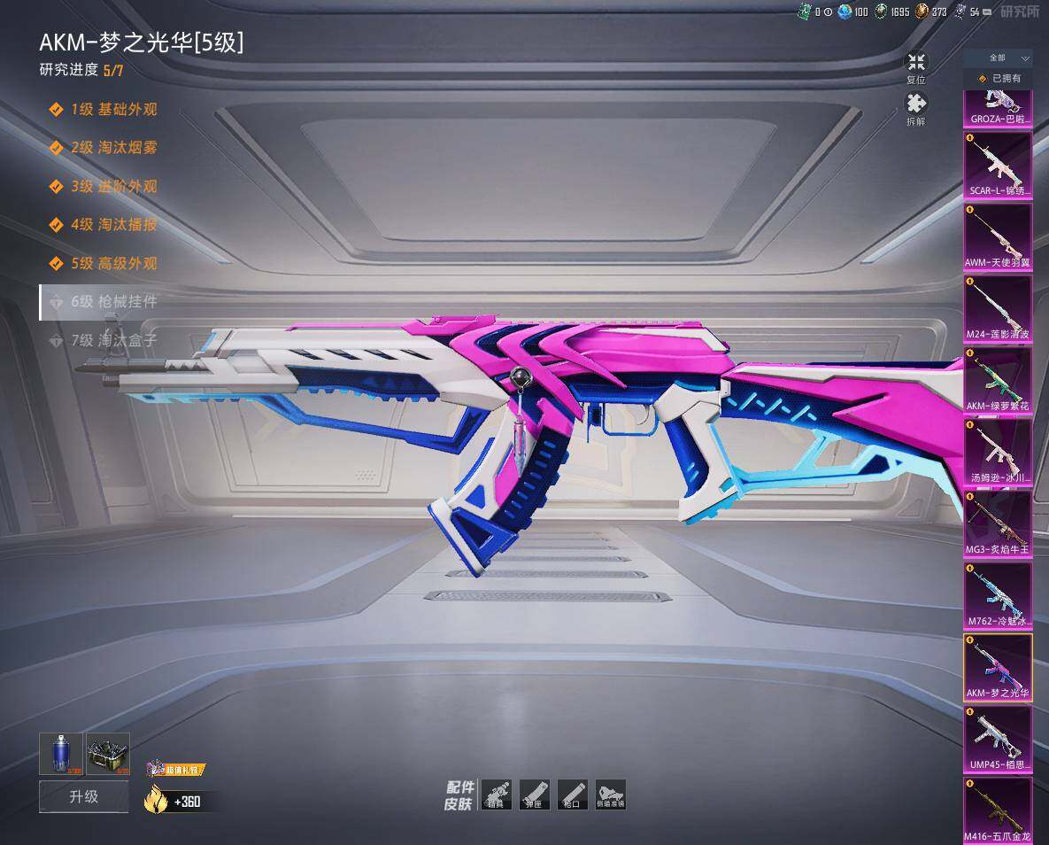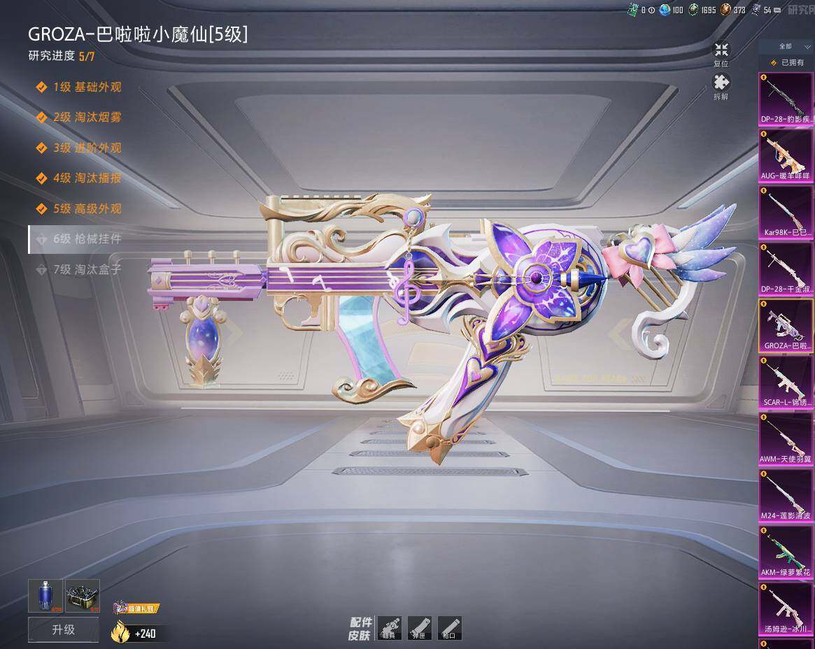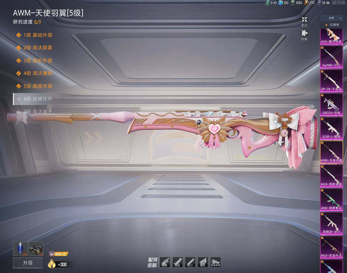 【粉色枪皮等级】:AKM-梦之光华(五级),AKM-绿萝繁花(五级),SCAR-L-锦绣绵绵(五级),M416-五爪金龙(六级),GROZA-巴啦啦小魔仙(五级),AUG-暖羊咩咩(五级),M762-冷魅冰骑(五级),UMP45-相思残雪(七级),汤姆逊-冰川粉黛(四级),Kar98K-巳巳如意(四级),M24-莲影清波(四级),AWM-天使羽翼(五级),DP-28-千金淑猫(四级),DP-28-豹影疾电(三级),MG3-炙焰牛王(五级)