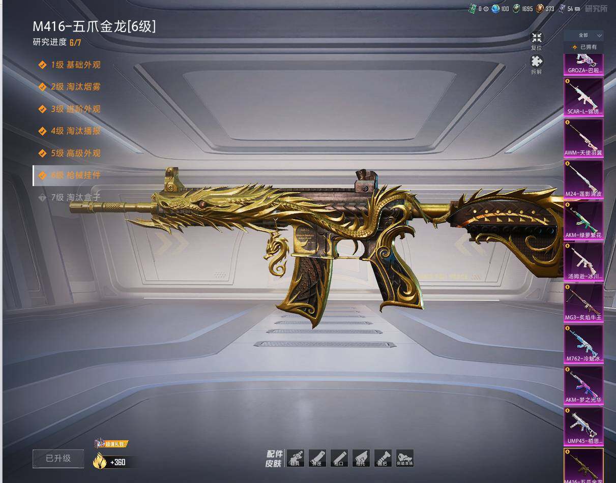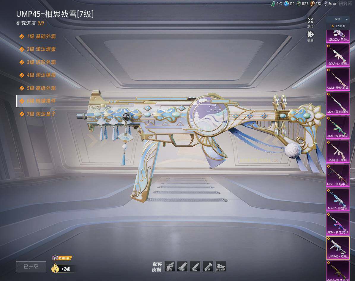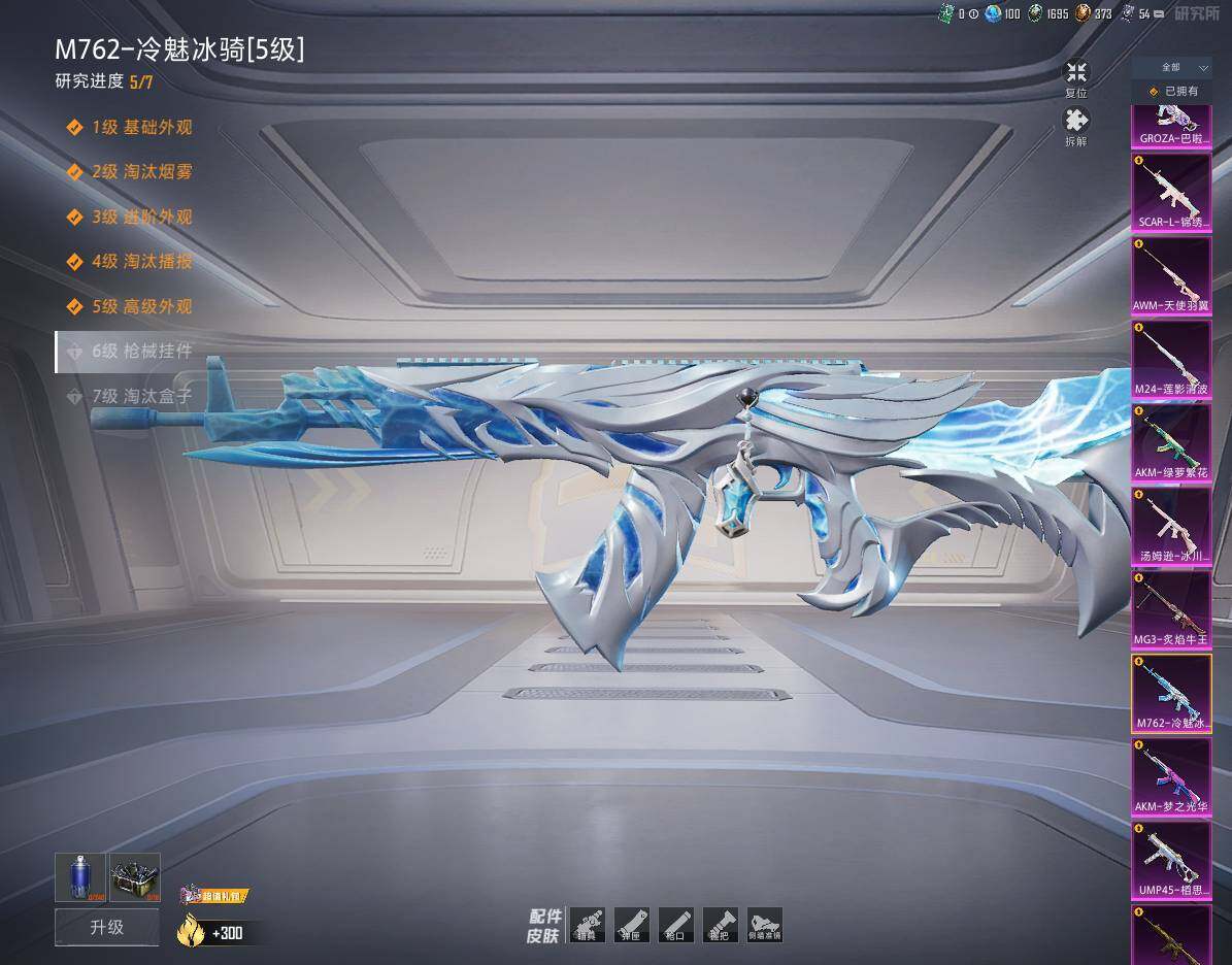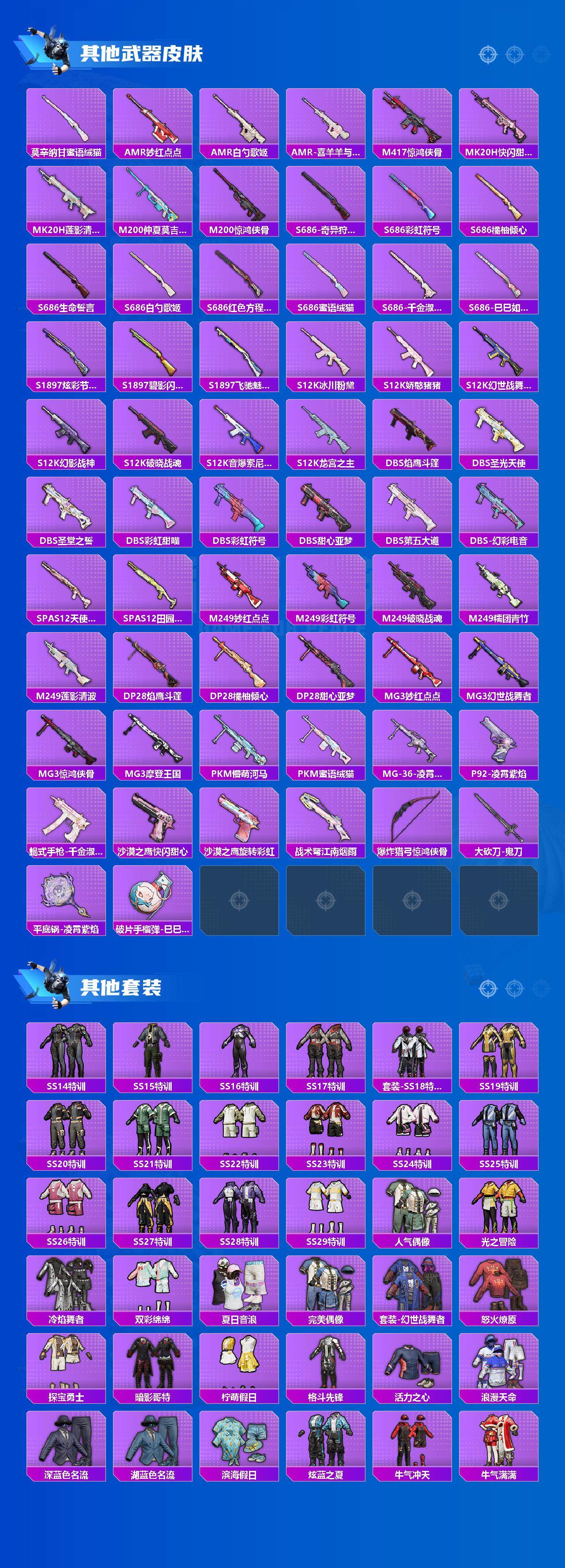 AKM-梦之光华,AKM-绿萝繁花,M416-五爪金龙,GROZA-巴啦啦小魔仙,AUG-暖羊咩咩,M762-冷魅冰骑,UMP45-相思残雪,汤姆逊-冰川粉黛,Kar98K-巳巳如意,M24-莲影清波,AWM-天使羽翼,DP-28-千金淑猫,MG3-炙焰牛王