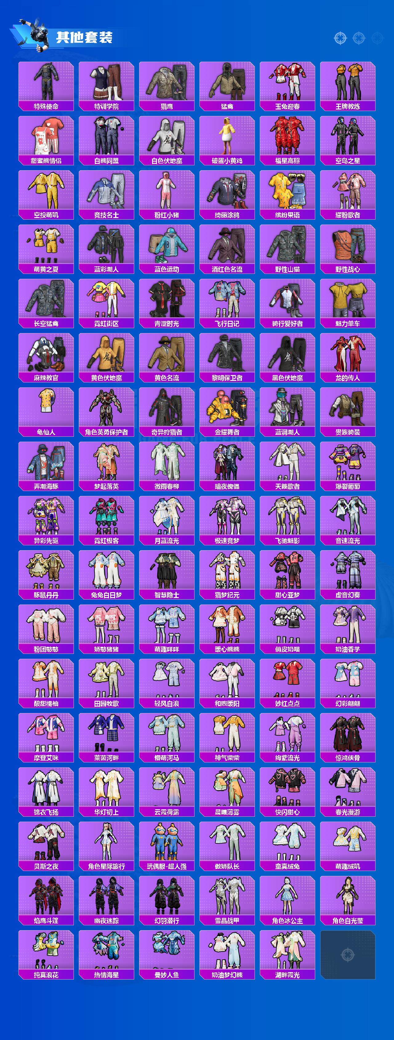 【粉色套装】:粉装-独舞天鹅,粉装-缤纷油彩,粉装-馨动时刻,粉装-天之羽翼,粉装-妙趣可丽,粉装-霁雪冰心,粉装-冰川红玫,粉装-寒光使者,粉装-暗夜鎏金,角色-小可学妹,粉装-莲影清波,角色-圣堂之誓,角色-烟云彩露,角色-美琪,角色-鸢尾晶梦,角色-千金淑猫