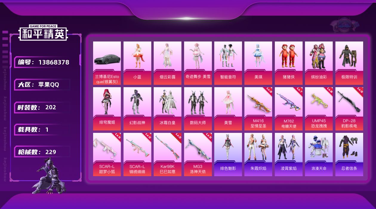 [13868378]苹果 手Q-无敌战神框-14粉装-8特效枪-1载具-3粉色飞行器-82815热力值-13王牌印记-202套装-229枪皮