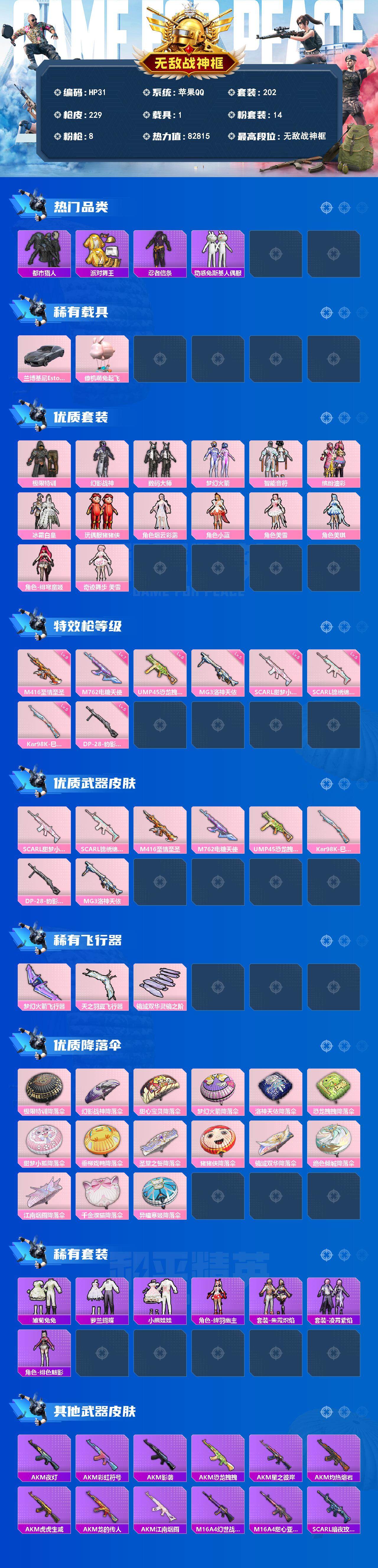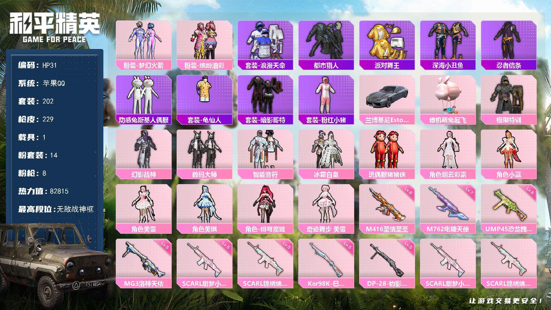 [13868378]苹果 手Q-无敌战神框-14粉装-8特效枪-1载具-3粉色飞行器-82815热力值-13王牌印记-202套装-229枪皮 【热门品类】:粉装-梦幻火箭,粉装-缤纷油彩,套装-浪漫天命,套装-都市猎人,套装-派对舞王,套装-深海小丑鱼,套装-忍者信条,套装-动感兔斯基人偶服,套装-龟仙人,套装-暗影哥特,套装-粉红小猪 【粉色载具】:兰博基尼Estoque(银翼灰),僚机-萌兔起飞 【粉色套装】:粉装-极限特训,粉装-幻影战神,粉装-数码大师,粉装-梦幻火箭,粉装-智能音符,粉装-缤纷油彩,粉装-冰霜白皇,玩偶服-猪猪侠,角色-烟云彩露,角色-小蓝,角色-美雪,角色-美琪,角色-绯穹魔姬,角色-奇迹舞步 美雪 【粉色枪皮等级】:SCAR-L-甜梦小狐(五级),SCAR-L-锦绣绵绵(五级),M416-至情至圣(九级),M762-电糖天使(七级),UMP45-恐龙拽拽(六级),Kar98K-巳巳如意(五级),DP-28-豹影疾电(五级),MG3-洛神天依(五级) 【粉色枪皮】:SCAR-L-甜梦小狐,SCAR-L-锦绣绵绵,M416-至情至圣,M762-电糖天使,UMP45-恐龙拽拽,Kar98K-巳巳如意,DP-28-豹影疾电,MG3-洛神天依 【粉色飞行器】:梦幻火箭飞行器,天之羽翼飞行器,镜域双华-灵镜之阶 【粉色降落伞】:极限特训降落伞,幻影战神降落伞,甜心宝贝降落伞,梦幻火箭降落伞,洛神天依降落伞,恐龙拽拽降落伞,甜梦小狐降落伞,垂柳戏鸭降落伞,圣堂之誓降落伞,猪猪侠降落伞,镜域双华降落伞,绝色倾城降落伞,江南烟雨降落伞,千金淑猫降落伞,异瞳寒姬降落伞 【稀有套装】:套装-龟仙人,套装-雏菊兔兔,套装-萝兰蝴蝶,套装-小熊娃娃,角色-绛羽幽主,套装-朱霞炽焰,套装-凌霄紫焰,角色-绯色魅影 【稀有枪皮】:AKM-夜灯,AKM-彩虹符号,AKM-影袭,AKM-恐龙拽拽,AKM-星之彼岸,AKM-江南烟雨,AKM-灼热熔岩,AKM-虎虎生威,AKM-龙的传人,M16A4-幻世战舞者,M16A4-甜心亚梦,SCAR-L-暗夜玫瑰,SCAR-L-炫彩节奏,SCAR-L-玉兔迎春,SCAR-L-银河战甲,M416-夜灯,M416-糯团青竹,M416-紫翼圣骑,M416-绯红前夜,GROZA-异彩先驱,GROZA-影袭,GROZA-恐龙拽拽,GROZA-懵萌河马,AUG