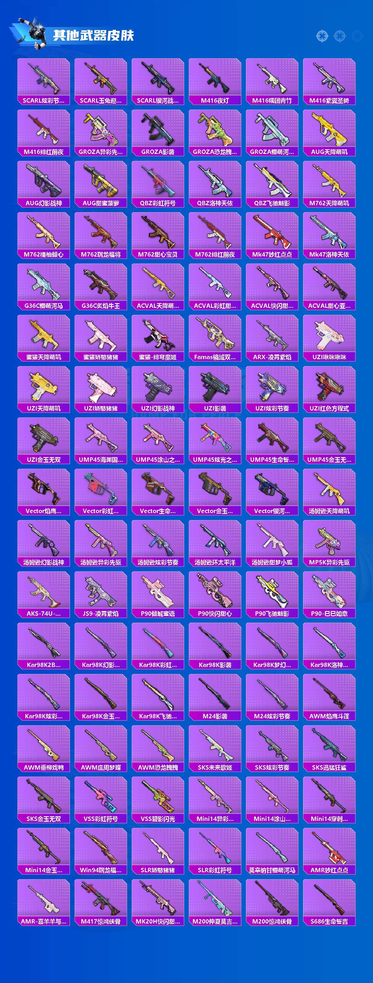 【粉色枪皮】:SCAR-L-甜梦小狐,SCAR-L-锦绣绵绵,M416-至情至圣,M762-电糖天使,UMP45-恐龙拽拽,Kar98K-巳巳如意,DP-28-豹影疾电,MG3-洛神天依