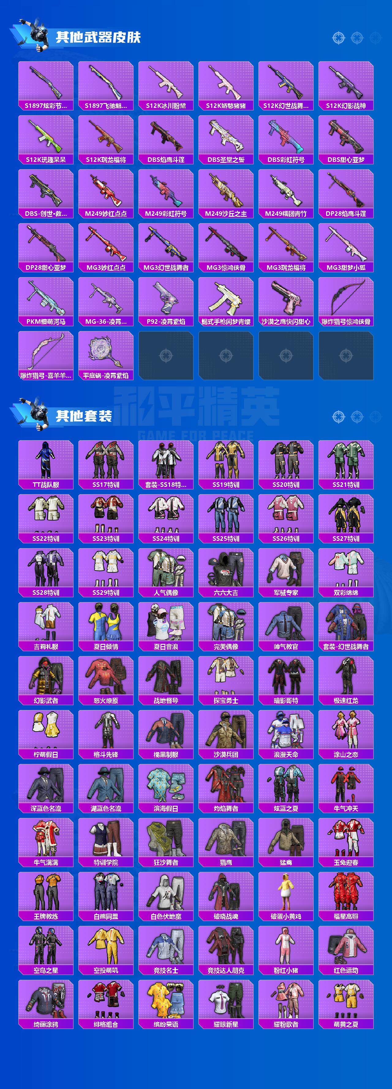 【稀有枪皮】:AKM-夜灯,AKM-彩虹符号,AKM-影袭,AKM-恐龙拽拽,AKM-星之彼岸,AKM-江南烟雨,AKM-灼热熔岩,AKM-虎虎生威,AKM-龙的传人,M16A4-幻世战舞者,M16A4-甜心亚梦,SCAR-L-暗夜玫瑰,SCAR-L-炫彩节奏,SCAR-L-玉兔迎春,SCAR-L-银河战甲,M416-夜灯,M416-糯团青竹,M416-紫翼圣骑,M416-绯红前夜,GROZA-异彩先驱,GROZA-影袭,GROZA-恐龙拽拽,GROZA-懵萌河马,AUG