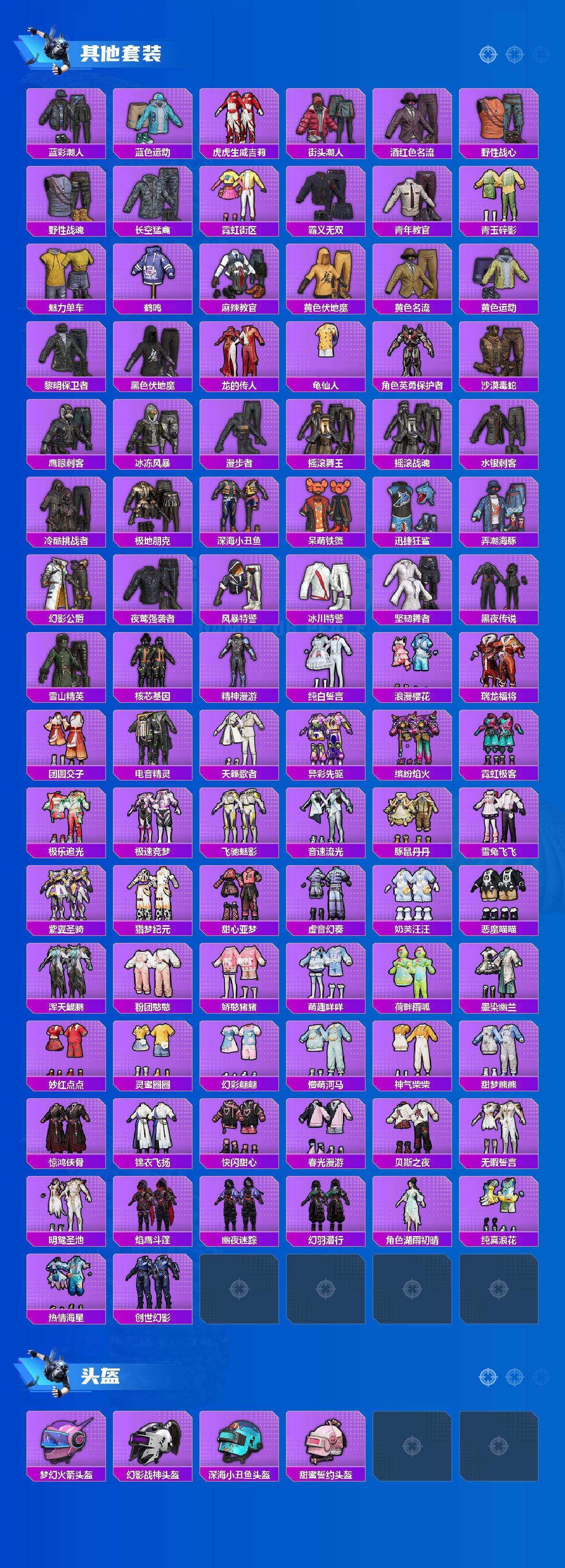 套装-浪漫天命,忍者信条套装,套装-龟仙人,套装-暗影哥特,套装-粉红小猪,套装-极速红龙,套装-狂沙舞者,套装-破蛋小黄鸡,角色-英勇保护者,套装-漫步者,套装-水银刺客,套装-弄潮海豚,套装-雪山精英,套装-纯白誓言,套装-瑞龙福将,套装-团圆交子,套装-豚鼠丹丹