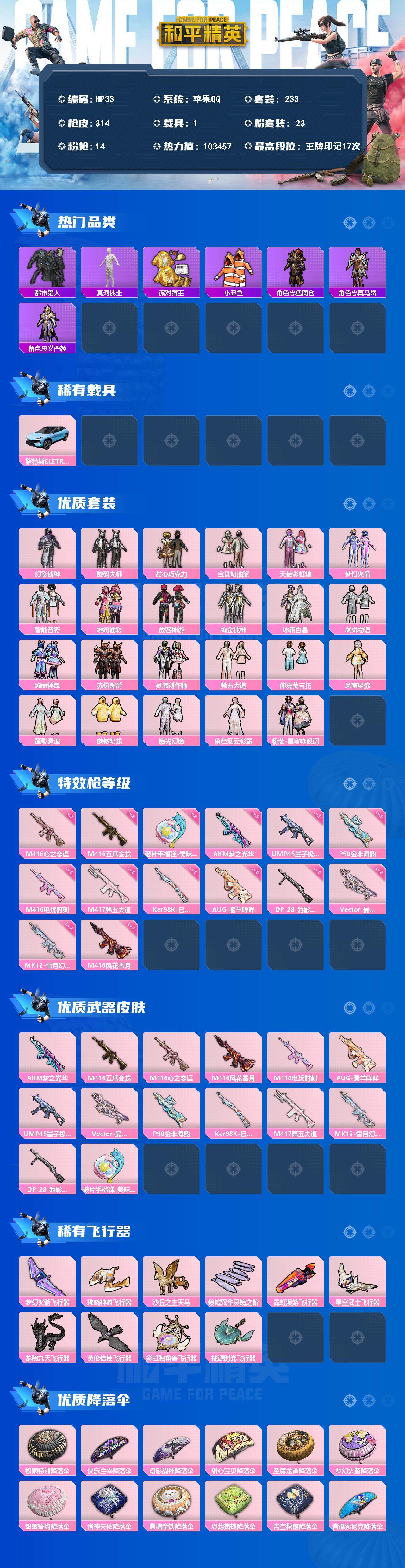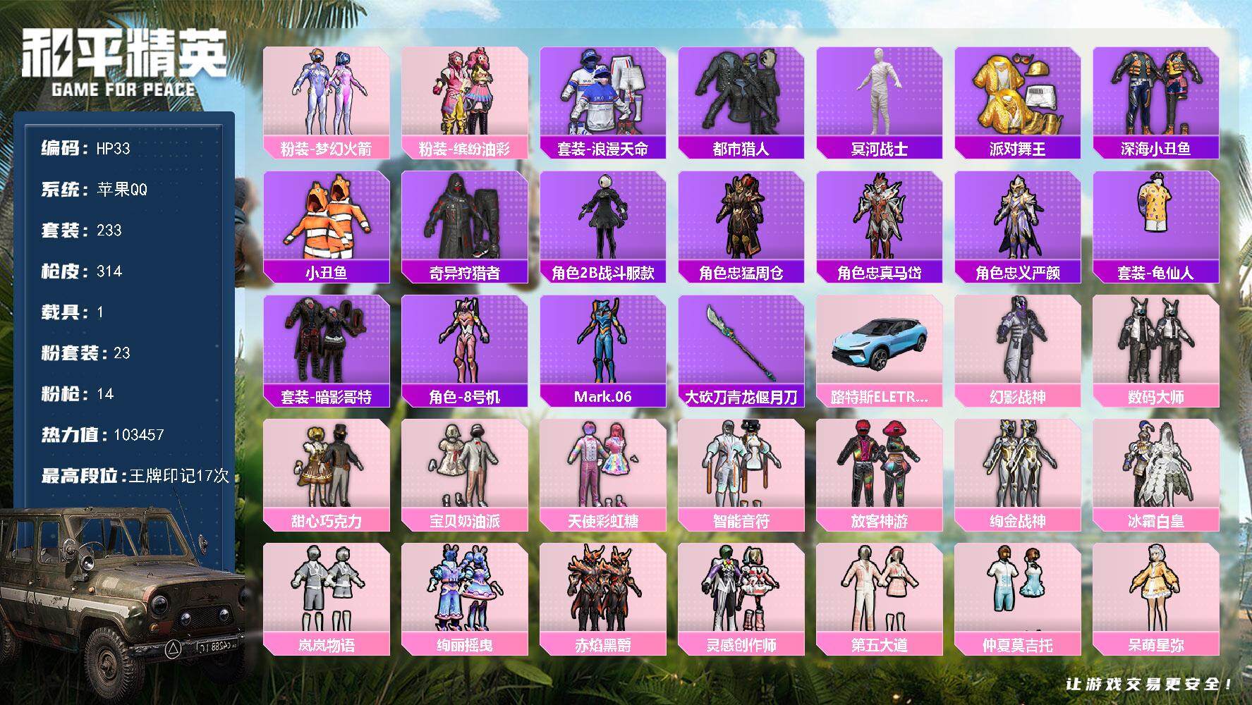 [13868389]苹果 手Q-23粉装-14特效枪-1载具-10粉色飞行器-103457热力值-17王牌印记-233套装-314枪皮