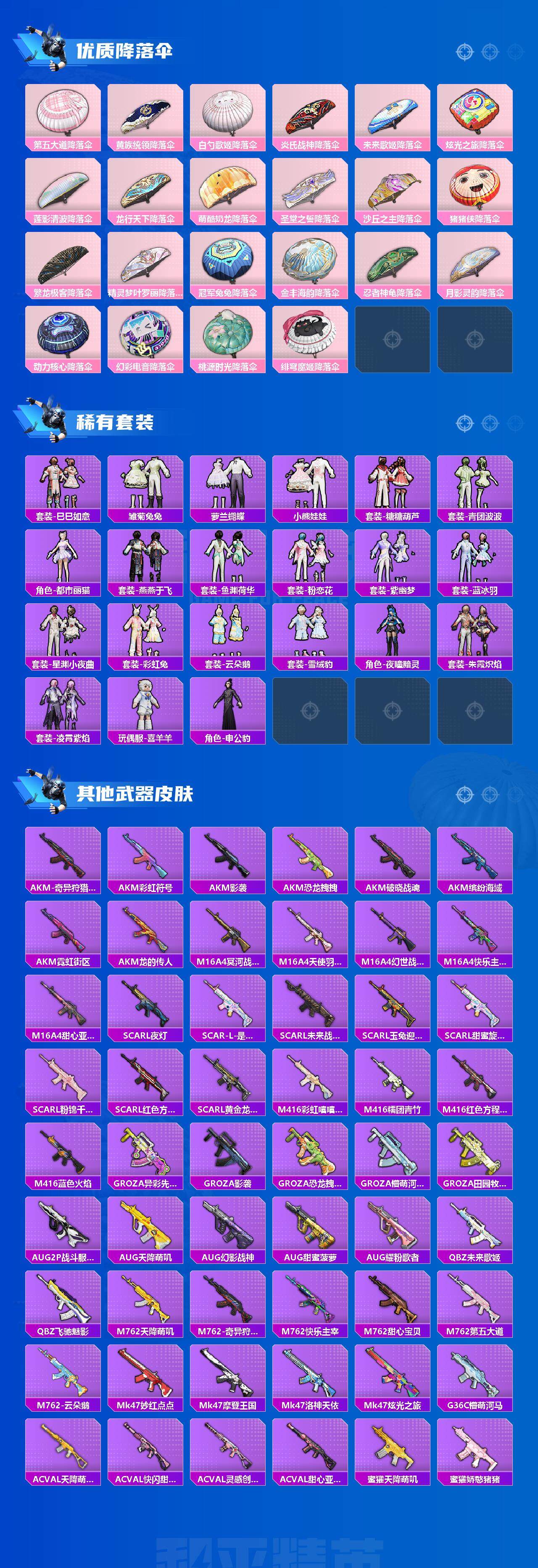 - [12587929]安卓 手Q-10粉装-4特效枪-3载具-0粉色飞行器-95749热力值-10王牌印记-222套装-278枪皮 【热门品类】:套装-浪漫天命,套装-动感兔斯基人偶服,套装-龟仙人,套装-暗影哥特,套装-浪漫波比,套装-粉红小猪 【粉色载具】:灵鼠银迹,萌喵橘座,俏皮小熊猫 【粉色套装】:粉装-花间之火,粉装-香水柠檬,粉装-海渊国主,粉装-傲雪凌霜,粉装-银红美神,粉装-暗夜鎏金,角色-呆萌星弥,粉装-未来歌姬,角色-猩猩队长,角色-荧海星豚 【粉色枪皮等级】:SCAR-L-青春物语(七级),M416-五爪金龙(七级),AUG-超新星(七级),Kar98K-巳巳如意(五级) 【粉色枪皮】:SCAR-L-青春物语,M416-五爪金龙,AUG-超新星,Kar98K-巳巳如意 【粉色降落伞】:极限特训降落伞,至尊龙雀降落伞,天启纪元降落伞,炫紫旋律降落伞,神秘黑猫降落伞,古堡领主降落伞,伏魔团降落伞,阿狸红降落伞,香水柠檬降落伞,暗夜玫瑰降落伞,洛神天依降落伞,蓝莓炮弹降落伞,甜心娃娃降落伞,碧影闪光降落伞,太空嘟嘟降落伞,彩虹甜喵降落伞,旋转彩虹降落伞,飒粉甜心降落伞,闲梦青缨降落伞,萌物绒绒降落伞,鬼刀降落伞,智耀战神降落伞 【稀有套装】:套装-龟仙人,套装-巳巳如意,套装-燕燕于飞,套装-鱼渊荷华,角色-海琴烟,套装-紫幽梦,套装-蓝冰羽,套装-星影赞美诗 【稀有枪皮】:AKM-夜灯,AKM-天启纪元,AKM-奇异狩猎者,AKM-彩虹符号,AKM-灼热熔岩,AKM-玉龙,AKM-生命誓言,AKM-萌趣颜团子,AKM-虎虎生威,AKM-霓虹街区,M16A4-九霄,M16A4-幻世战舞者,M16A4-机械英豪,M16A4-甜心亚梦,M16A4-蓝色火焰,M16A4-魔法学院,SCAR-L-暗夜玫瑰,SCAR-L-炫彩节奏,SCAR-L-玉兔迎春,SCAR-L-甜蜜誓约,M416-夜灯,M416-神秘黑猫,M416-糯团青竹,M416-红色方程式,M416-绯红前夜,GROZA-异彩先驱,GROZA-懵萌河马,GROZA-暗夜武装,GROZA-治愈之星,GROZA-田园牧歌,GROZA-蓝莓炮弹,GROZA-黑色刀锋,AUG-凝视深渊,AUG-天降萌叽,AUG-青春冒险家,QBZ-原初圣火,QBZ-彩虹符号,QBZ-洛神天依,QBZ-飞驰魅影,M762-天降萌叽,M762