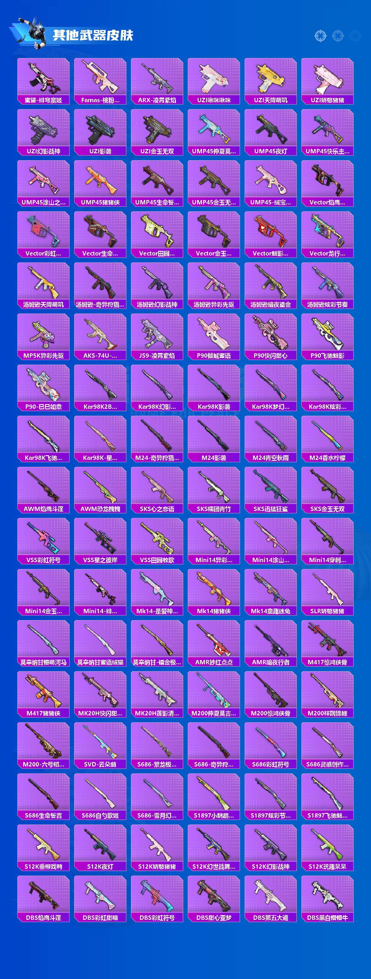 AKM-梦之光华,M416-五爪金龙,M416-心之恋语,M416-风花雪月,M416-电玩时刻,AUG-暖羊咩咩,UMP45-量子极限,P90-金丰海韵,Kar98K-巳巳如意,M417-第五大道,MK12-雪月幻音