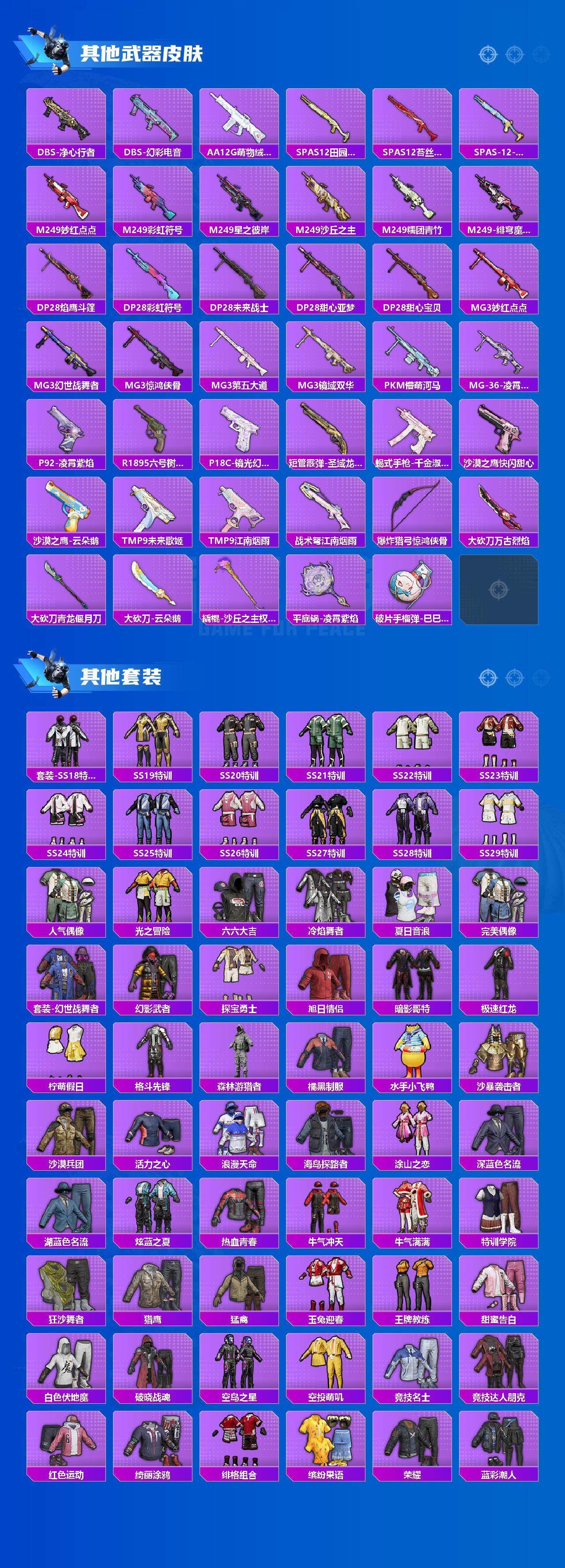 [13868389]苹果 手Q-23粉装-14特效枪-1载具-10粉色飞行器-103457热力值-17王牌印记-233套装-314枪皮 【热门品类】:粉装-梦幻火箭,粉装-缤纷油彩,套装-浪漫天命,套装-都市猎人,套装-冥河战士,套装-派对舞王,套装-深海小丑鱼,套装-小丑鱼,套装-奇异狩猎者,角色-2B战斗服款,角色-忠猛周仓,角色-忠真马岱,角色-忠义严颜,套装-龟仙人,套装-暗影哥特,角色-8号机,角色-Mark.06,大砍刀-青龙偃月刀 【粉色载具】:路特斯ELETRE(冰川蓝) 【粉色套装】:粉装-幻影战神,粉装-数码大师,粉装-甜心巧克力,粉装-宝贝奶油派,粉装-天使彩虹糖,粉装-梦幻火箭,粉装-智能音符,粉装-缤纷油彩,粉装-放客神游,粉装-绚金战神,粉装-冰霜白皇,粉装-岚岚物语,粉装-绚丽摇曳,粉装-赤焰黑爵,粉装-灵感创作师,粉装-第五大道,粉装-仲夏莫吉托,角色-呆萌星弥,粉装-莲影清波,粉装-傲傲奶龙,粉装-镜光幻境,角色-烟云彩露,粉装-星穹咏叹调 【粉色枪皮等级】:AKM-梦之光华(五级),M416-五爪金龙(六级),M416-心之恋语(七级),M416-风花雪月(一级),M416-电玩时刻(五级),AUG-暖羊咩咩(五级),UMP45-量子极限(五级),Vector-最终圣卫者(三级),汤姆逊-星月云朵(二级MK12-雪月幻音),P90-金丰海韵(五级),Kar98K-巳巳如意(五级),M417-第五大道(五级),DP-28-豹影疾电(五级),破片手榴弹-美味星星糖(六级) 【粉色枪皮】:AKM-梦之光华,M416-五爪金龙,M416-心之恋语,M416-风花雪月,M416-电玩时刻,AUG-暖羊咩咩,UMP45-量子极限,Vector-最终圣卫者,P90-金丰海韵,Kar98K-巳巳如意,M417-第五大道,MK12-雪月幻音,DP-28-豹影疾电,破片手榴弹-美味星星糖 【粉色飞行器】:梦幻火箭飞行器,拂晓神骑飞行器,沙丘之主天马,镜域双华-灵镜之阶,霓虹漫游飞行器,星空武士飞行器,龙翔九天飞行器,英伦信使飞行器,彩虹独角兽飞行器,桃源时光飞行器 【粉色降落伞】:极限特训降落伞,快乐主宰降落伞,幻影战神降落伞,甜心宝贝降落伞,至尊龙雀降落伞,梦幻火箭降落伞,甜蜜誓约降落伞,洛神天依降落伞,焦糖拿铁降落伞,恐龙拽拽降落伞,青空秋雨降落伞,音爆索尼克降落