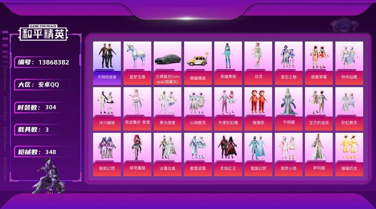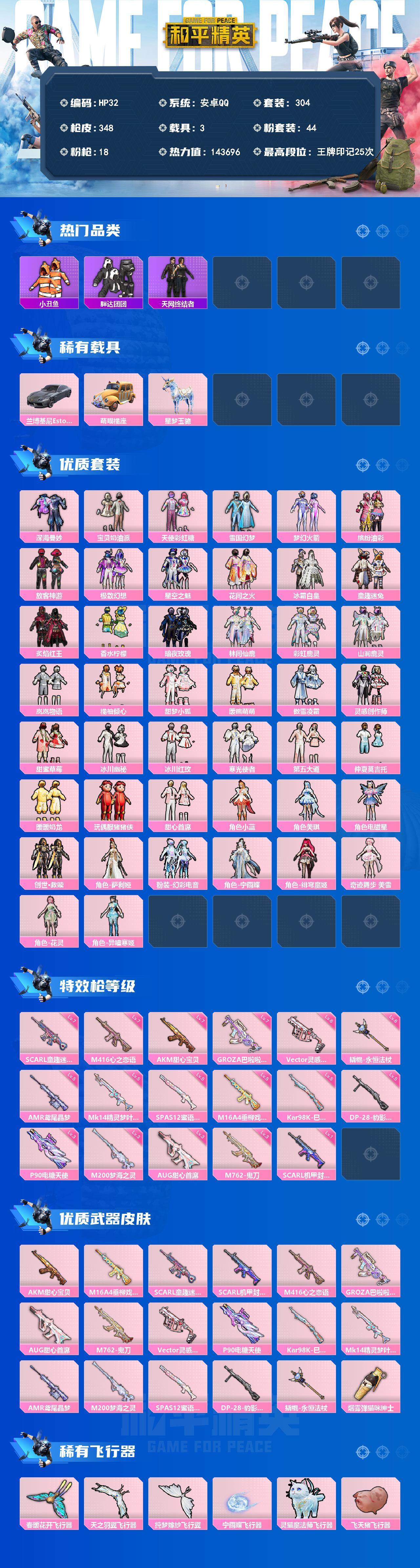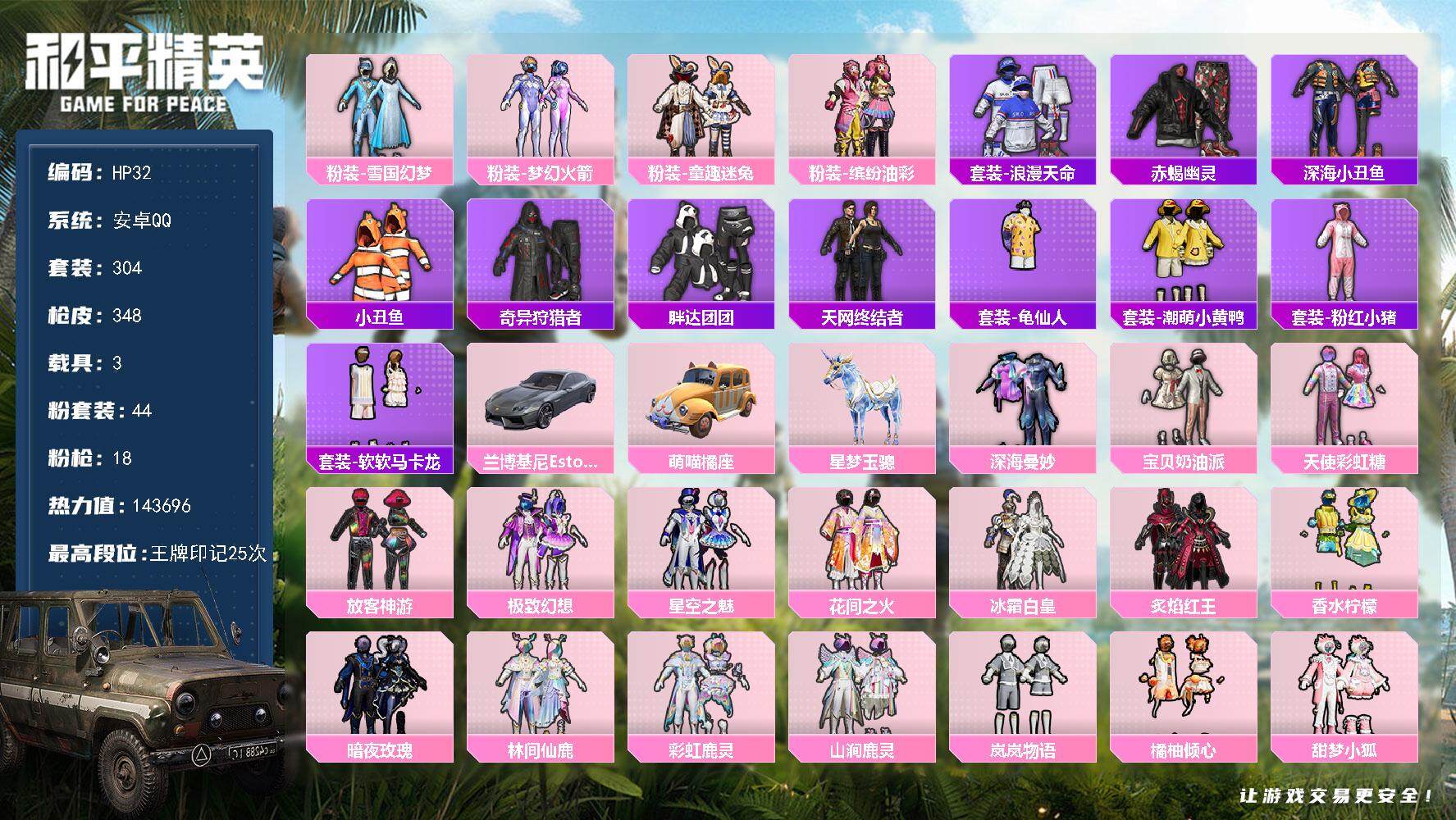 [13868382]安卓 手Q-44粉装-18特效枪-3载具-6粉色飞行器-143696热力值-25王牌印记-304套装-348枪皮
